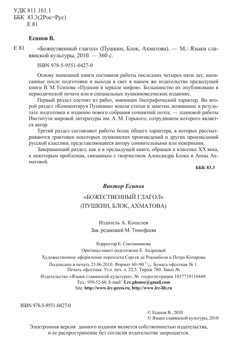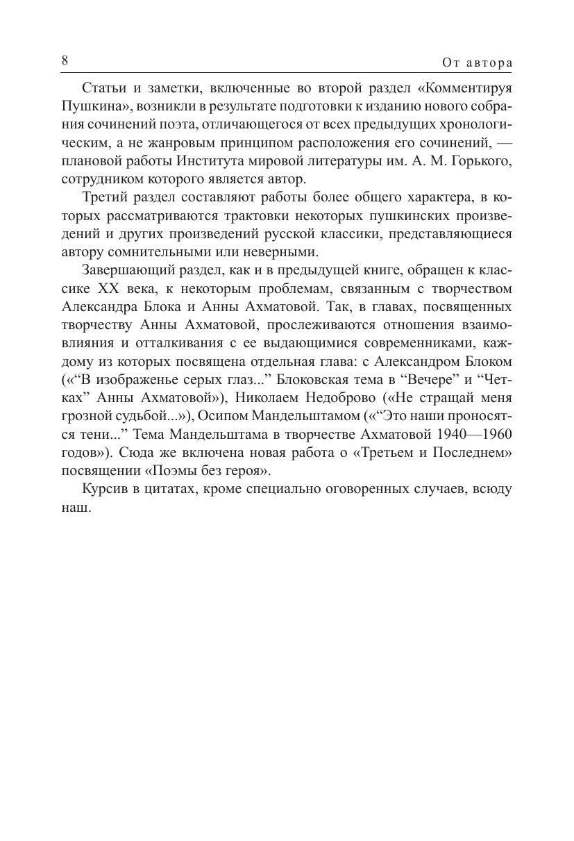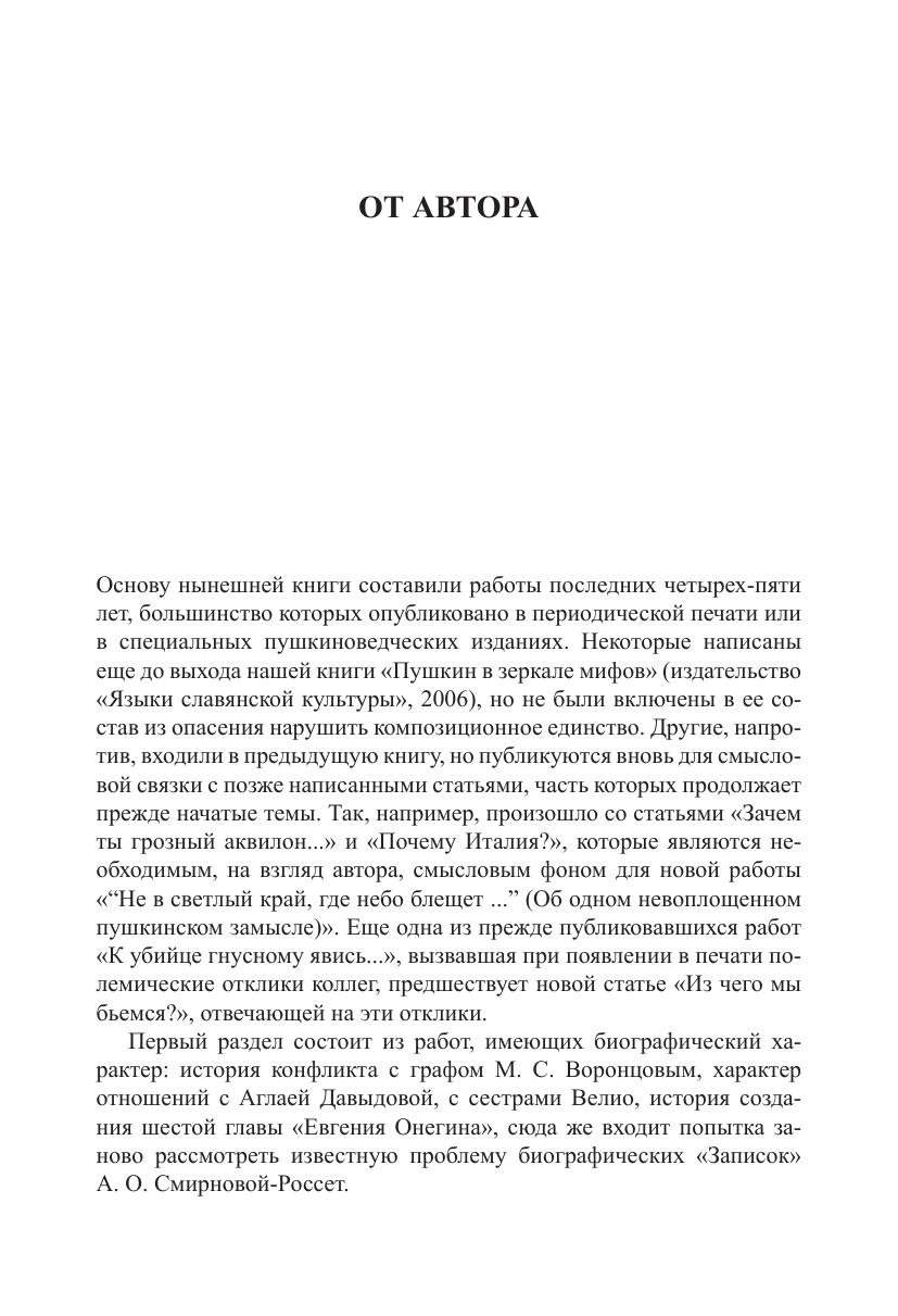 Основу нынешней книги составили работы последних четырех-пяти лет, написанные после подготовки и выхода в свет в нашем же издательстве предыдущей книги В.М. Есипова «Пушкин в зеркале мифов». Большинство их опубликовано в периодической печати или в специальных пушкиноведческих изданиях. Первый раздел состоит из работ, имеющих биографический характер. Во второй раздел «Комментируя Пушкина» вошли статьи и заметки, возникшие в результате подготовки к изданию нового собрания сочинений поэта, — плановой работы Института мировой литературы им. А.М. Горького, сотрудником которого является автор. Третий раздел составляют работы более общего характера, в которых рассматриваются трактовки некоторых пушкинских произведений и других произведений русской классики, представляющиеся автору сомнительными или неверными. Завершающий раздел, как и в предыдущей книге, обращен к классике XX века, к некоторым проблемам, связанным с творчеством Александра Блока и Анны Ахматовой.