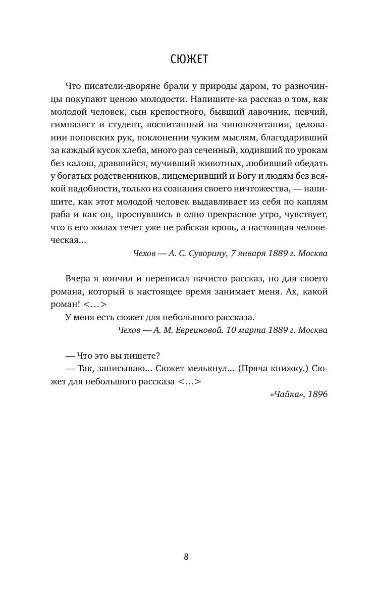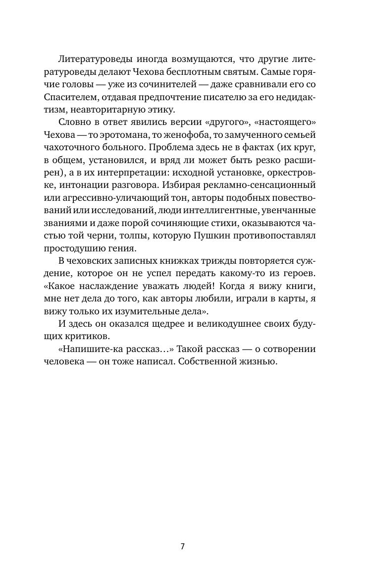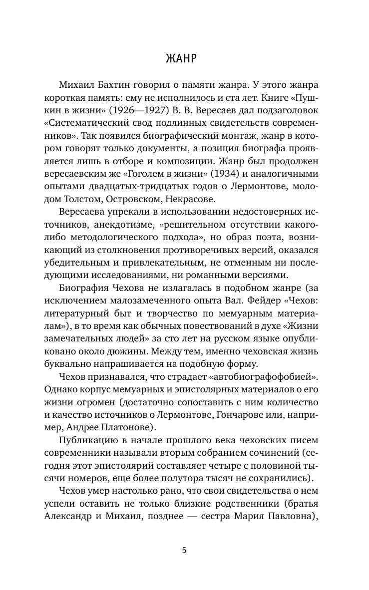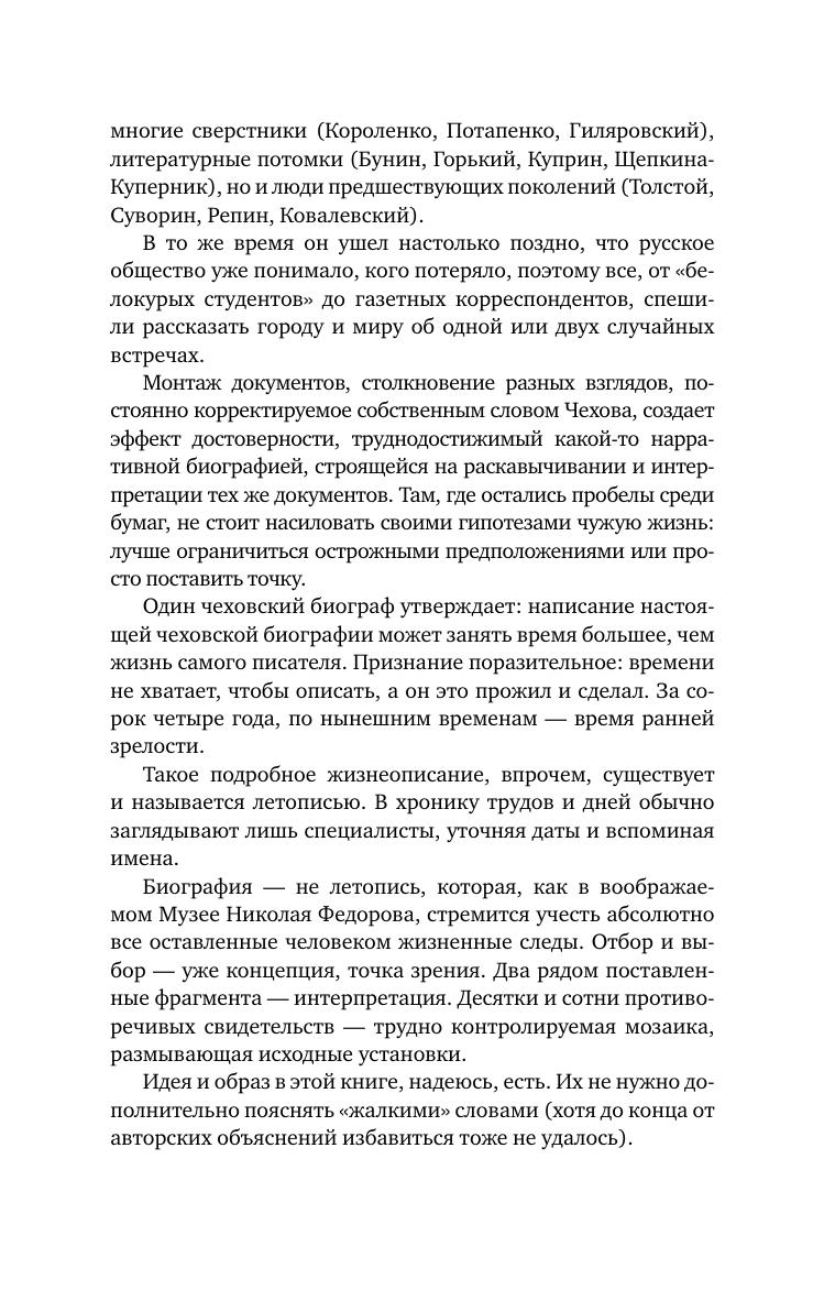 Чехов в жизни — книга в жанре документального монтажа. Однако вместо хронологического, линейного изложения читателю предлагается около полусотни разноплановых глав: семейных и географических, идеологических и любовных. Сквозным сюжетом повествования становится не разгадка мнимых чеховских загадок, а драма судьбы.