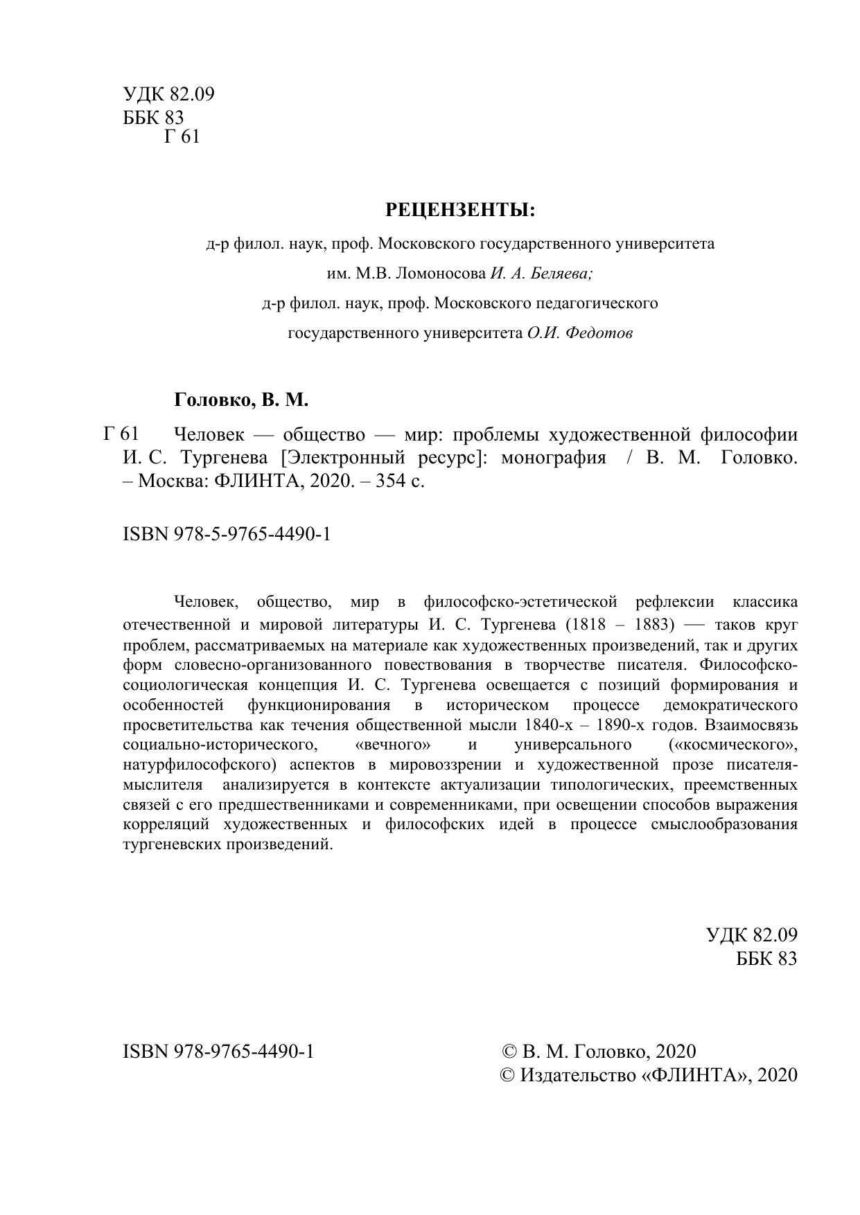 Человек, общество, мир в философско-эстетической рефлексии классика отечественной и мировой литературы И. С. Тургенева (1818 – 1883) — таков круг проблем, рассматриваемых на материале как художественных произведений, так и других форм словесно-организованного повествования в творчестве писателя. Философско-социологическая концепция И. С. Тургенева освещается с позиций формирования и особенностей функционирования в историческом процессе демократического просветительства как течения общественной мысли 1840-х – 1890-х годов. Взаимосвязь социально-исторического, «вечного» и универсального («космического», натурфилософского) аспектов в мировоззрении и художественной прозе писателя-мыслителя анализируется в контексте актуализации типологических, преемственных связей с его предшественниками и современниками, при освещении способов выражения корреляций художественных и философских идей в процессе смыслообразования тургеневских произведений.