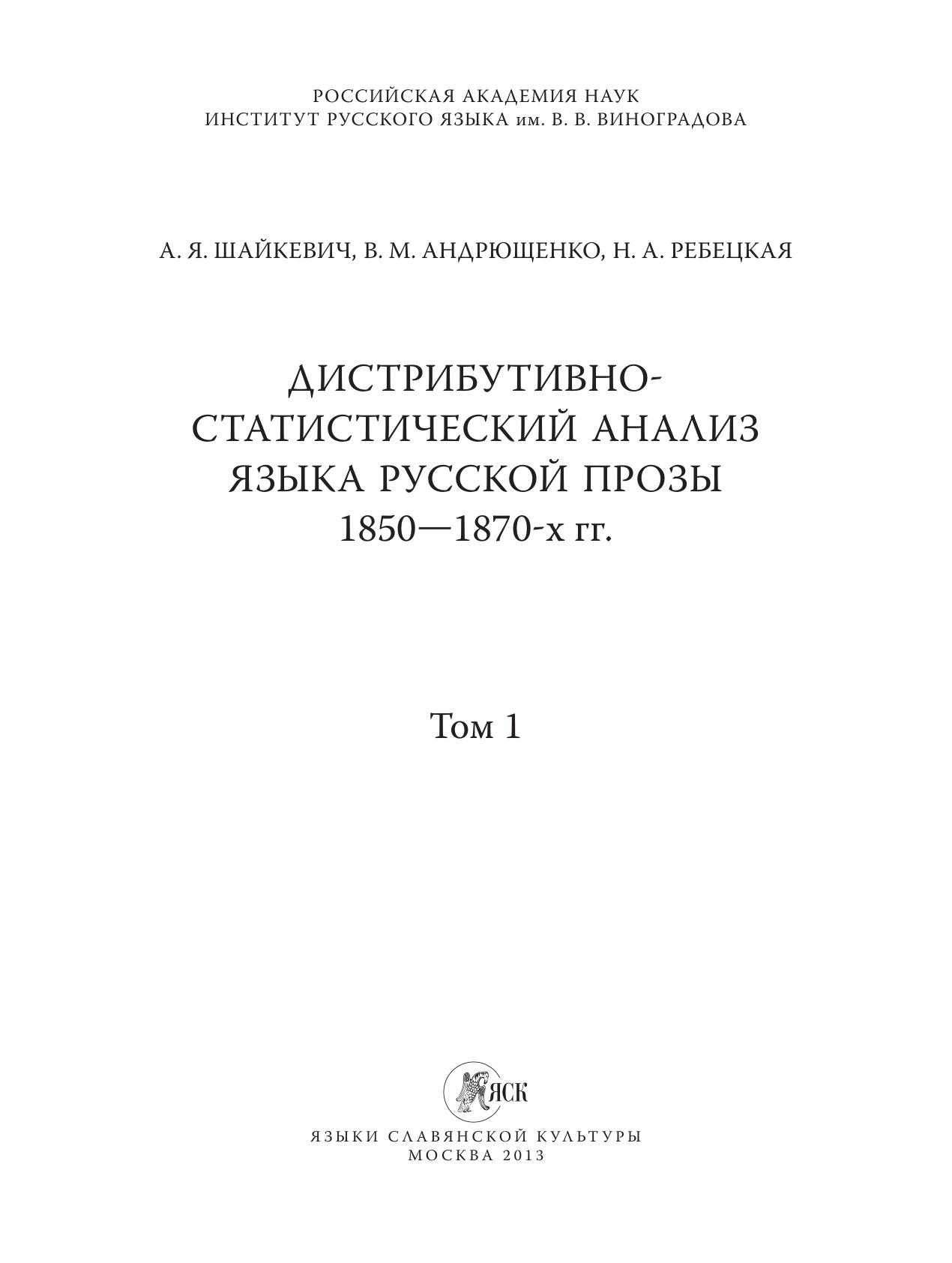 Дистрибутивно-статистический анализ языка русской прозы 1850-1870-х гг. Т. 1
