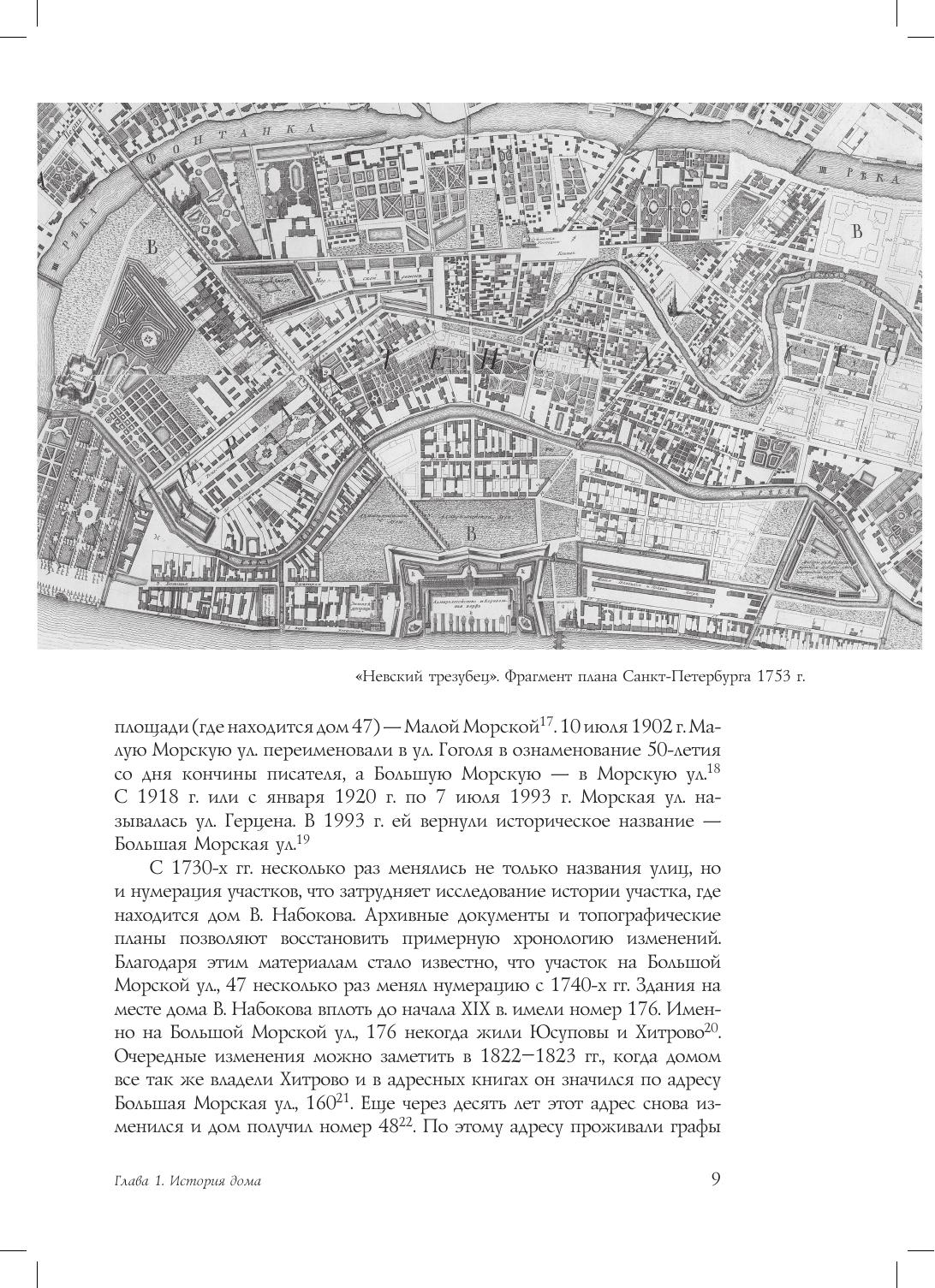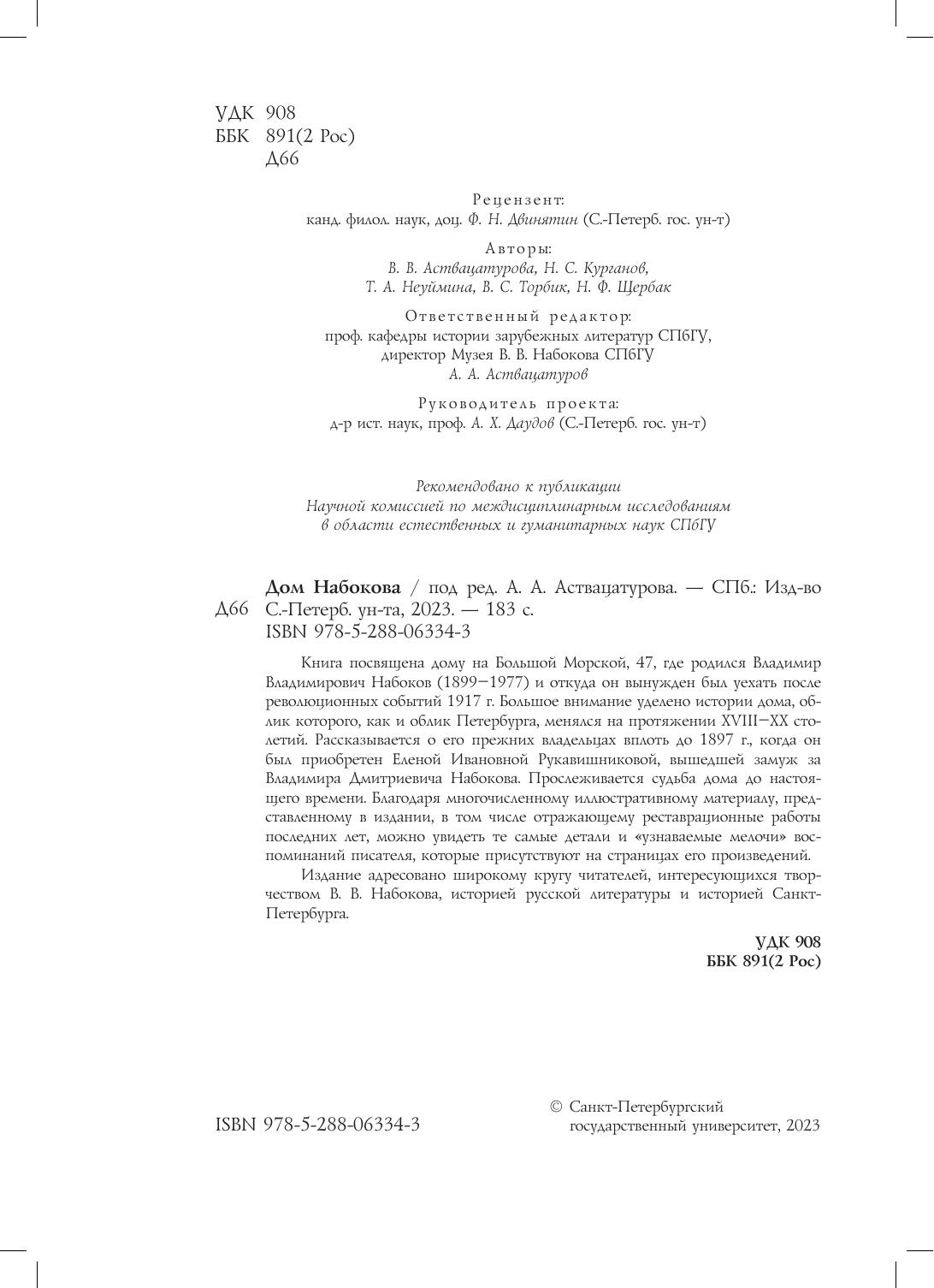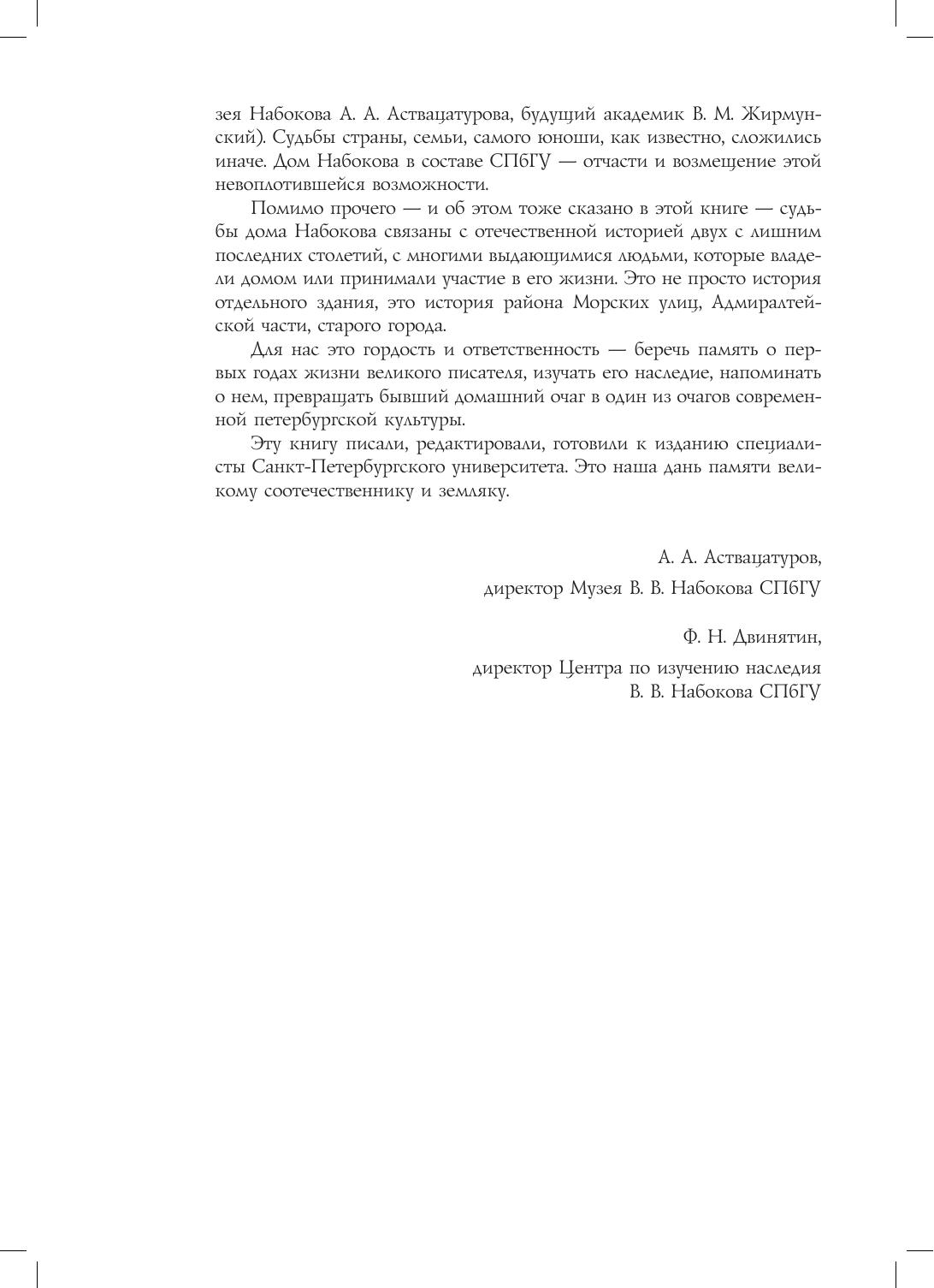 Книга посвящена дому на Большой Морской, 47, где родился Владимир Владимирович Набоков ( 1899-1977 ) и откуда он вынужден был уехать после революционных событий 1917 г. Большое внимание уделено истории дома, облик которого, как и облик Петербурга, менялся на протяжении XVIII-XX столетий. Рассказывается о его прежних владельцах вплоть до 1897 г., когда он был приобретен Еленой Ивановной Рукавишниковой, вышедшей замуж за Владимира Дмитриевича Набокова. Прослеживается судьба дома до настоящего времени. Благодаря многочисленному иллюстративному материалу, представленному в издании, в том числе отражающему реставрационные работы последних лет, можно увидеть те самые детали и "узнаваемые мелочи" воспоминаний писателя, которые присутствуют на страницах его произведений. Издание адресовано широкому кругу читателей, интересующихся творчеством В.В. Набокова, историей русской литературы и историей Санкт-Петербурга.