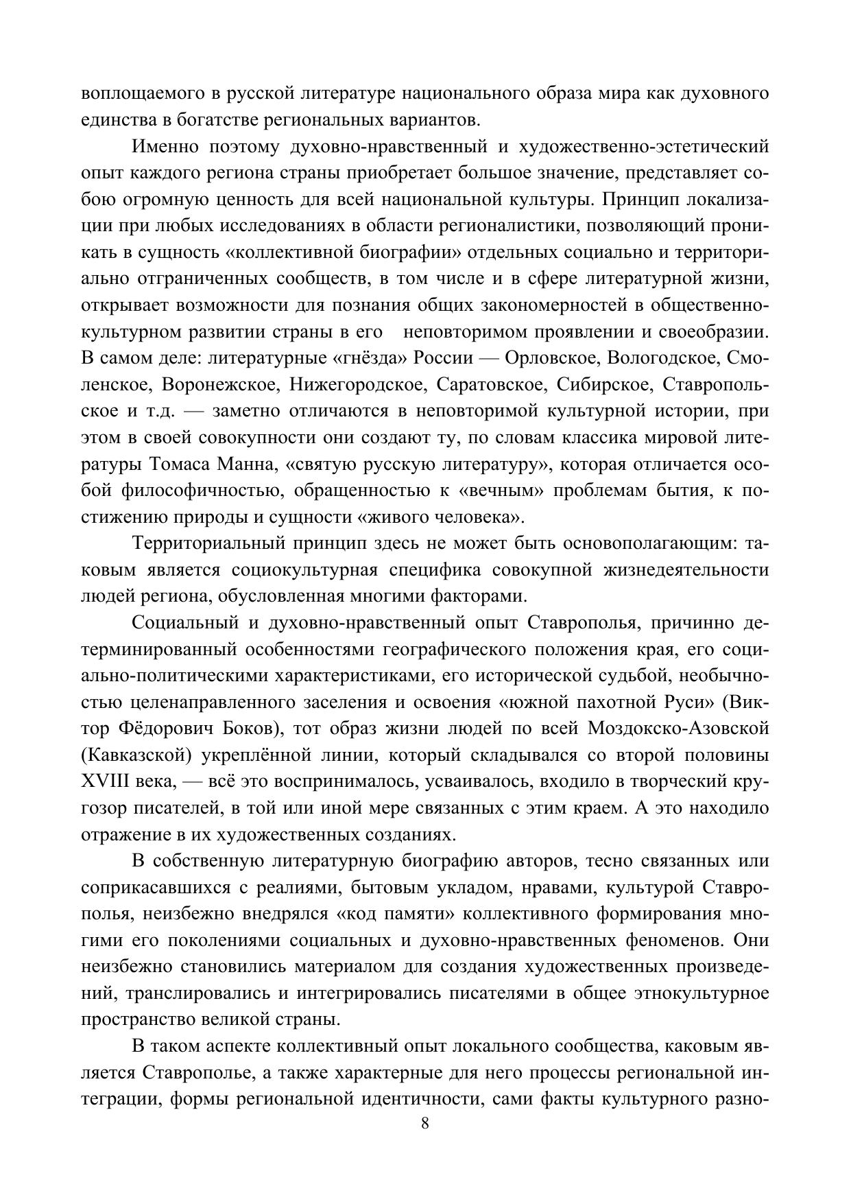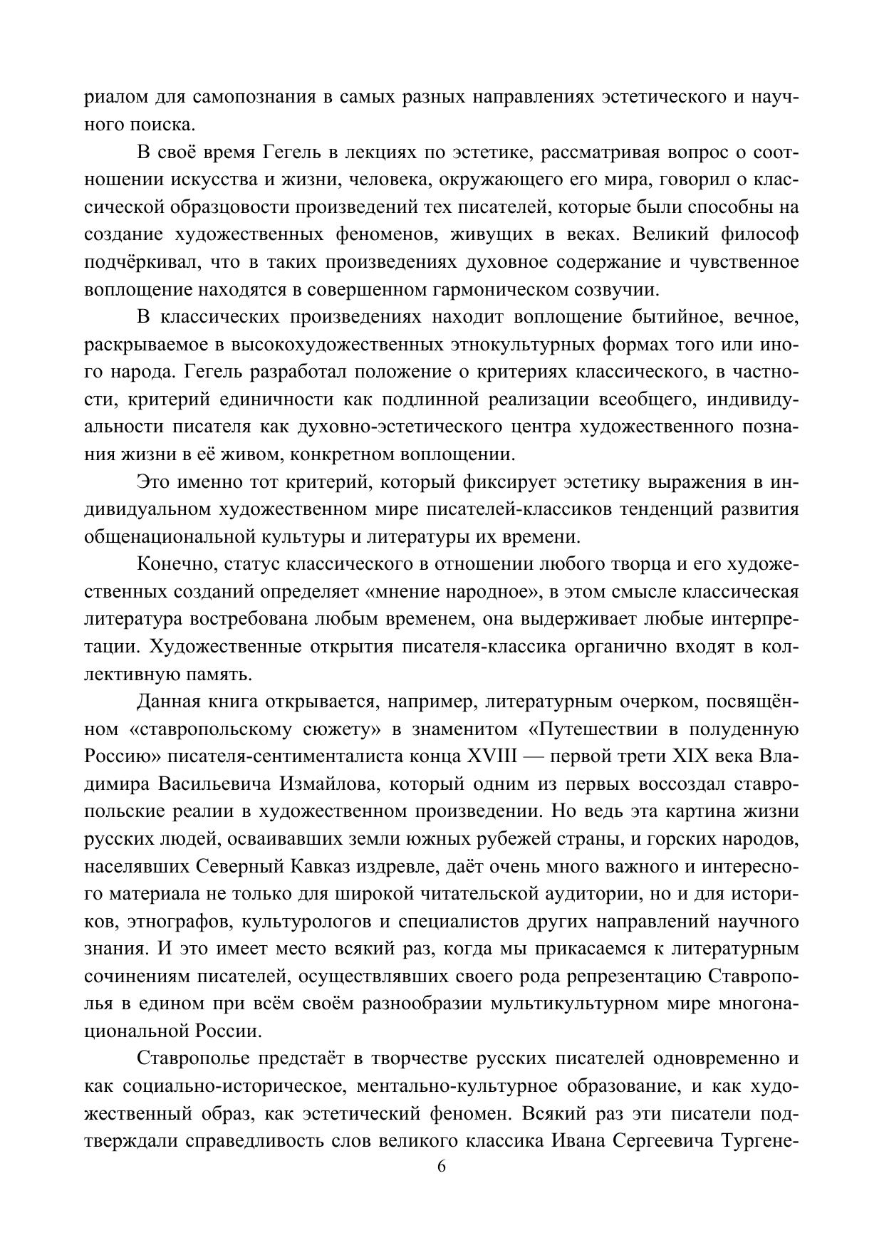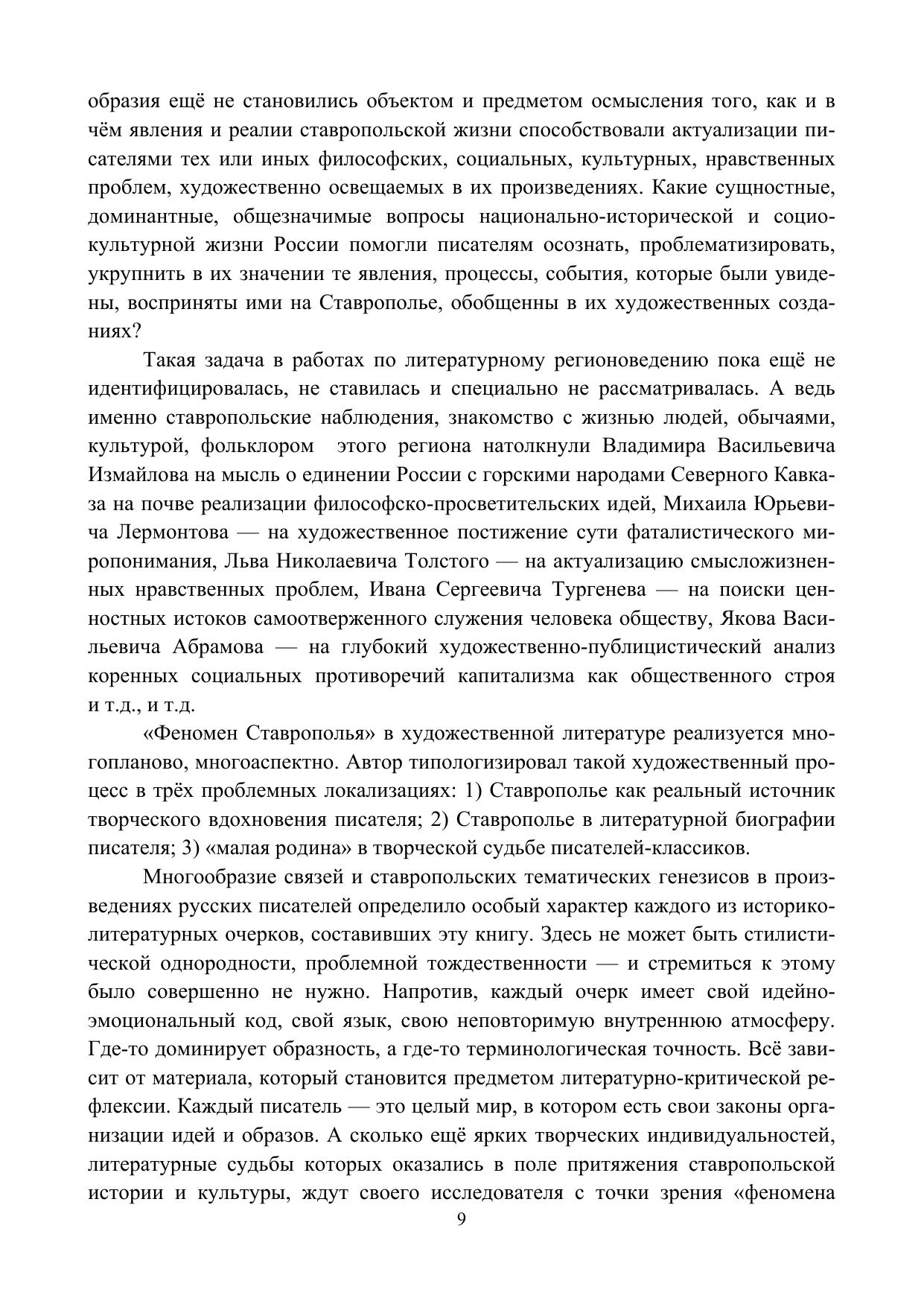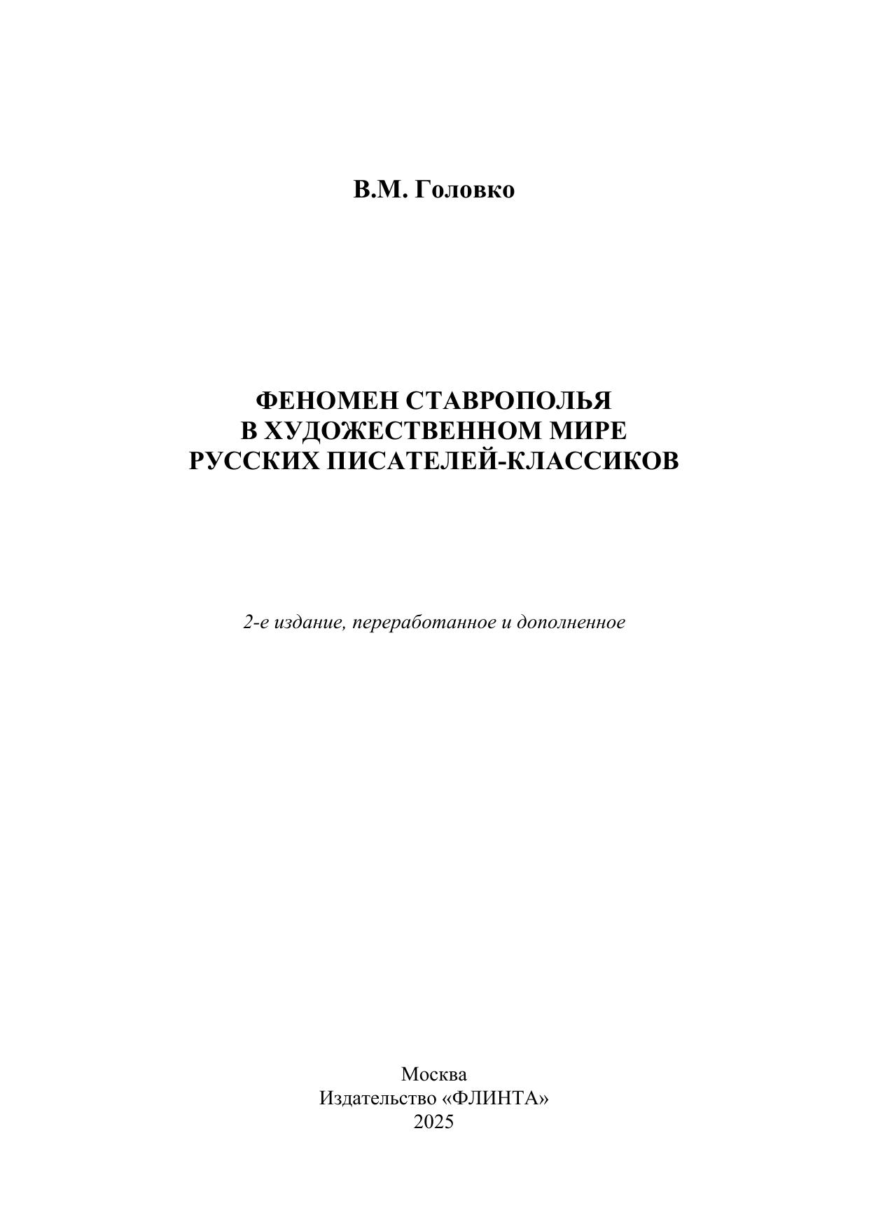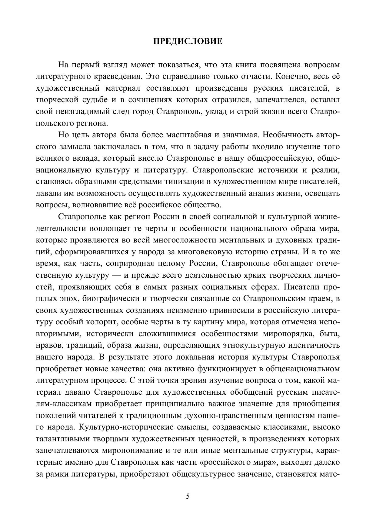 В книге теоретика литературы, историка русской литературы, писателя Вячеслава Головко, созданной в жанре научно-популярного литературоведения, понятие «феномен Ставрополья» обосновывается как эстетическая категория. Она реализуется на материале творчества писателей разных историко-культурных эпох, начиная с конца ХVIII и до начала ХХI века. Вопросы литературного краеведения поднимаются на уровень понимания общекультурного значения литературных явлений, созданных с опорой на ставропольский материал. Литературный «феномен Ставрополья» освещается в аспекте его функционирования в общероссийском художественном процессе. Опыт изучения локальной истории, «истории снизу», активно использовался автором для новаторского изучения творческого процесса русских писателей, использовавших при работе над своими произведениями ставропольские реалии, данные истории края, наблюдения над укладом жизни, социальными отношениями, трудом, бытом, нравами, менталитетом, психологией людей, населяющих юг России. Гармонизируя «горизонталь пространства» и «ось времени», автор книги освещает роль региональной идентичности в воссоздании тех духовно-нравственных основ и традиций, которые определили национальное своеобразие «русского мира», неотъемлемой частью которого является Ставрополье. В книге показано, как литература, стремительно и безостановочно развиваясь во времени, органически размещается в определенном локальном пространстве, взаимодействуя с ним, определяя формы его восприятия. В ней воссоздаётся тот национальный образ мира, который в наши дни восстанавливается в общественном сознании новых поколений и обеспечивает культурный суверенитет России. Автор впервые вводит в широкий оборот уникальные сведения и материалы, относящиеся к источникам произведений ряда русских писателей, биографически и творчески связанных со Ставрополем и Ставропольским краем, обогащая знания в области истории русской литературы, как региональной, так и общенациональной.