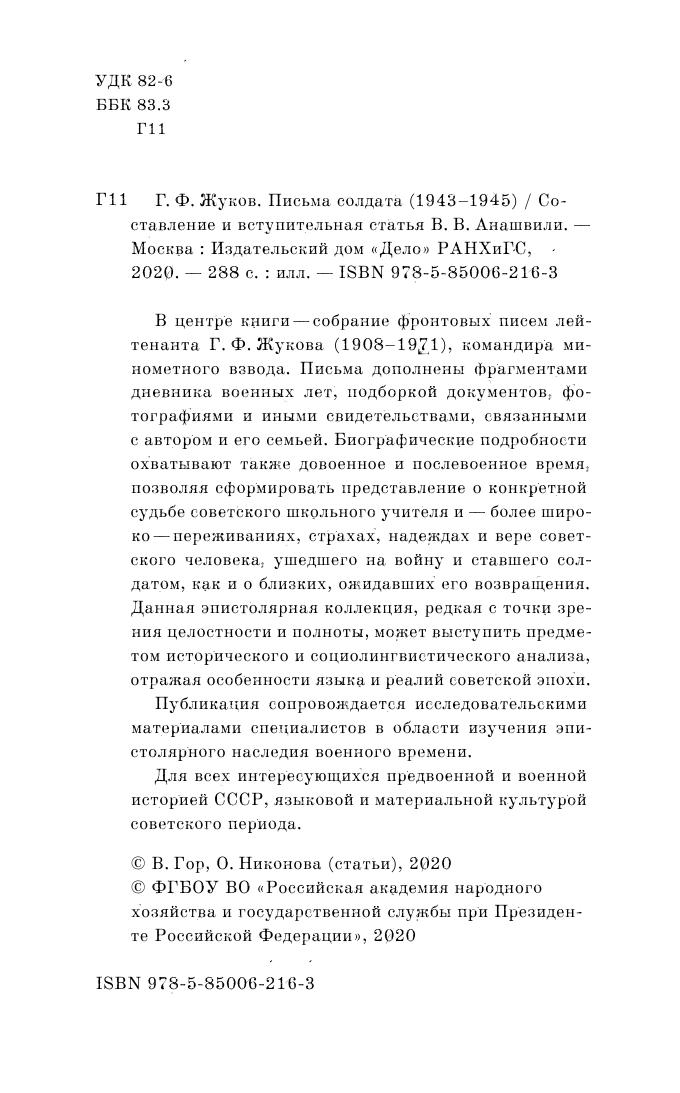 В центре книги — собрание фронтовых писем лейтенанта Г. Ф. Жукова (1908–1971), командира минометного взвода. Письма дополнены фрагментами дневника военных лет, подборкой документов, фотографиями и иными свидетельствами, связанными с автором и его семьей. Биографические подробности охватывают также довоенное и послевоенное время, позволяя сформировать представление о конкретной судьбе советского школьного учителя и — более широко — переживаниях, страхах, надеждах и вере советского человека, ушедшего на войну и ставшего солдатом, как и о близких, ожидавших его возвращения. Данная эпистолярная коллекция, редкая с точки зрения целостности и полноты, может выступить предметом исторического и социолингвистического анализа, отражая особенности языка и реалий советской эпохи. Публикация сопровождается исследовательскими материалами специалистов в области изучения эпистолярного наследия военного времени. Для всех интересующихся предвоенной и военной историей СССР, языковой и материальной культурой советского периода.