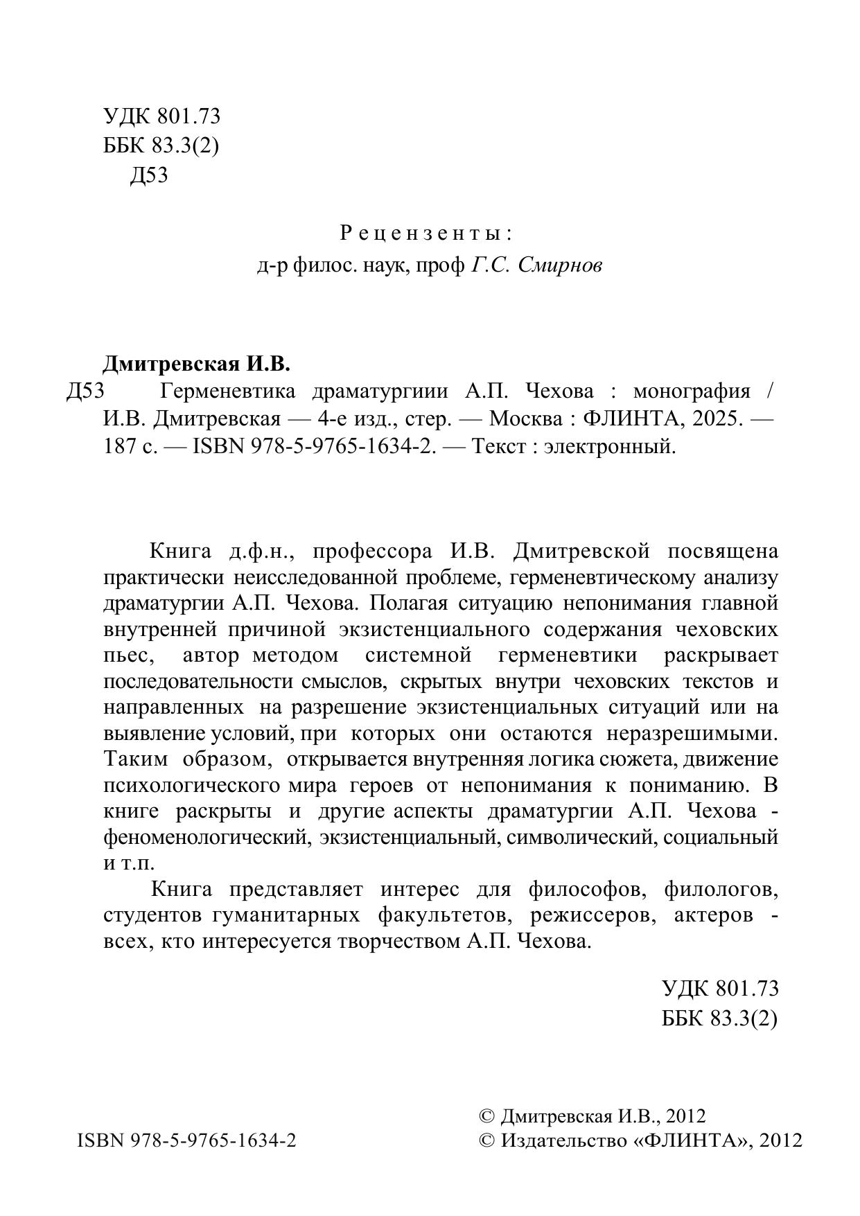 Книга д.ф.н., профессора И.В. Дмитревской посвящена практически неисследованной проблеме, герменевтическому анализу драматургии А.П. Чехова. Полагая ситуацию непонимания главной внутренней причиной экзистенциального содержания чеховских пьес, автор методом системной герменевтики раскрывает последовательности смыслов, скрытых внутри чеховских текстов и направленных на разрешение экзистенциальных ситуаций или на выявление условий, при которых они остаются неразрешимыми. Таким образом, открывается внутренняя логика сюжета, движение психологического мира героев от непонимания к пониманию. В книге раскрыты и другие аспекты драматургии А.П. Чехова - феноменологический, экзистенциальный, символический, социальный и т.п. Книга представляет интерес для философов, филологов, студентов гуманитарных факультетов, режиссеров, актеров - всех, кто интересуется творчеством А.П. Чехова.