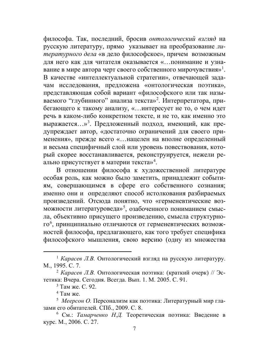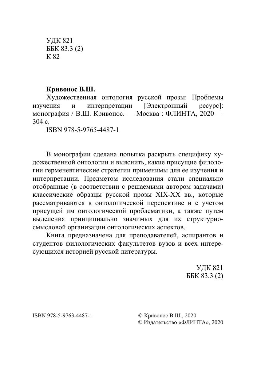 В монографии сделана попытка раскрыть специфику ху-дожественной онтологии и выяснить, какие присущие филоло-гии герменевтические стратегии применимы для ее изучения и интерпретации. Предметом исследования стали специально отобранные (в соответствии с решаемыми автором задачами) классические образцы русской прозы XIX-XX вв., которые рассматриваются в онтологической перспективе и с учетом присущей им онтологической проблематики, а также путем выделения принципиально значимых для их структурно-смысловой организации онтологических аспектов.