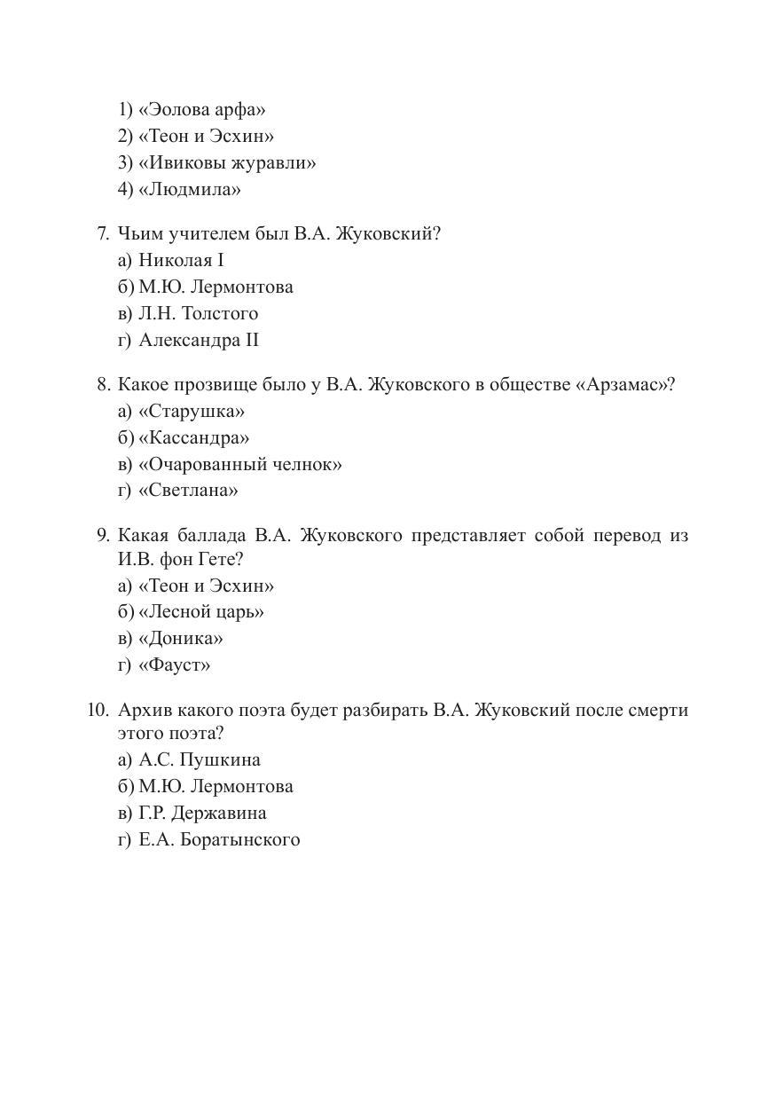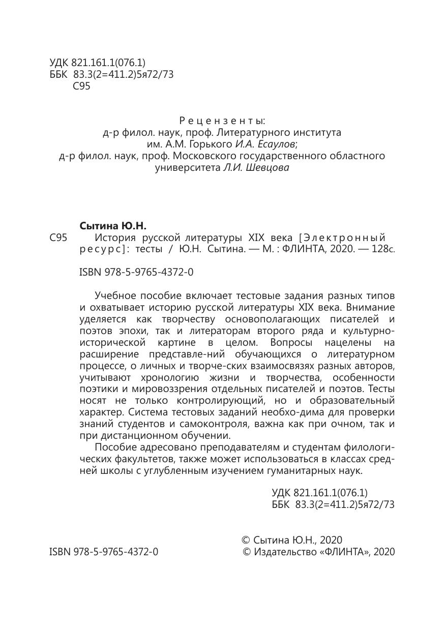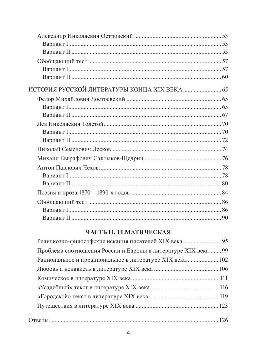 Учебное пособие включает тестовые задания разных типов и охватывает историю русской литературы XIX века. Внимание уделяется как творчеству основополагающих писателей и поэтов эпохи, так и литераторам второго ряда и культурно-исторической картине в целом. Вопросы нацелены на расширение представле-ний обучающихся о литературном процессе, о личных и творческих взаимосвязях разных авторов, учитывают хронологию жизни и творчества, особенности поэтики и мировоззрения отдельных писателей и поэтов. Тесты носят не только контролирующий, но и образовательный характер. Система тестовых заданий необхо-дима для проверки знаний студентов и самоконтроля, важна как при очном, так и при дистанционном обучении.