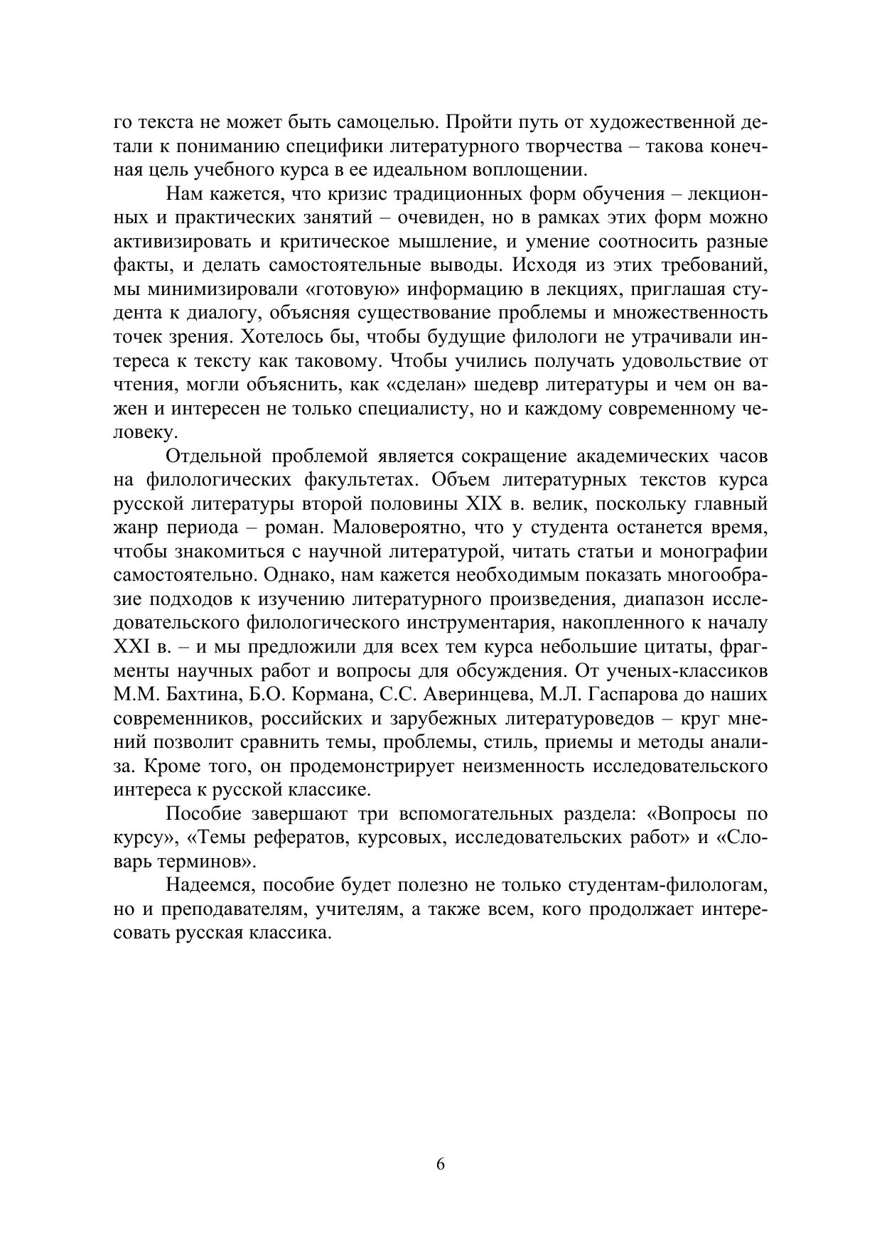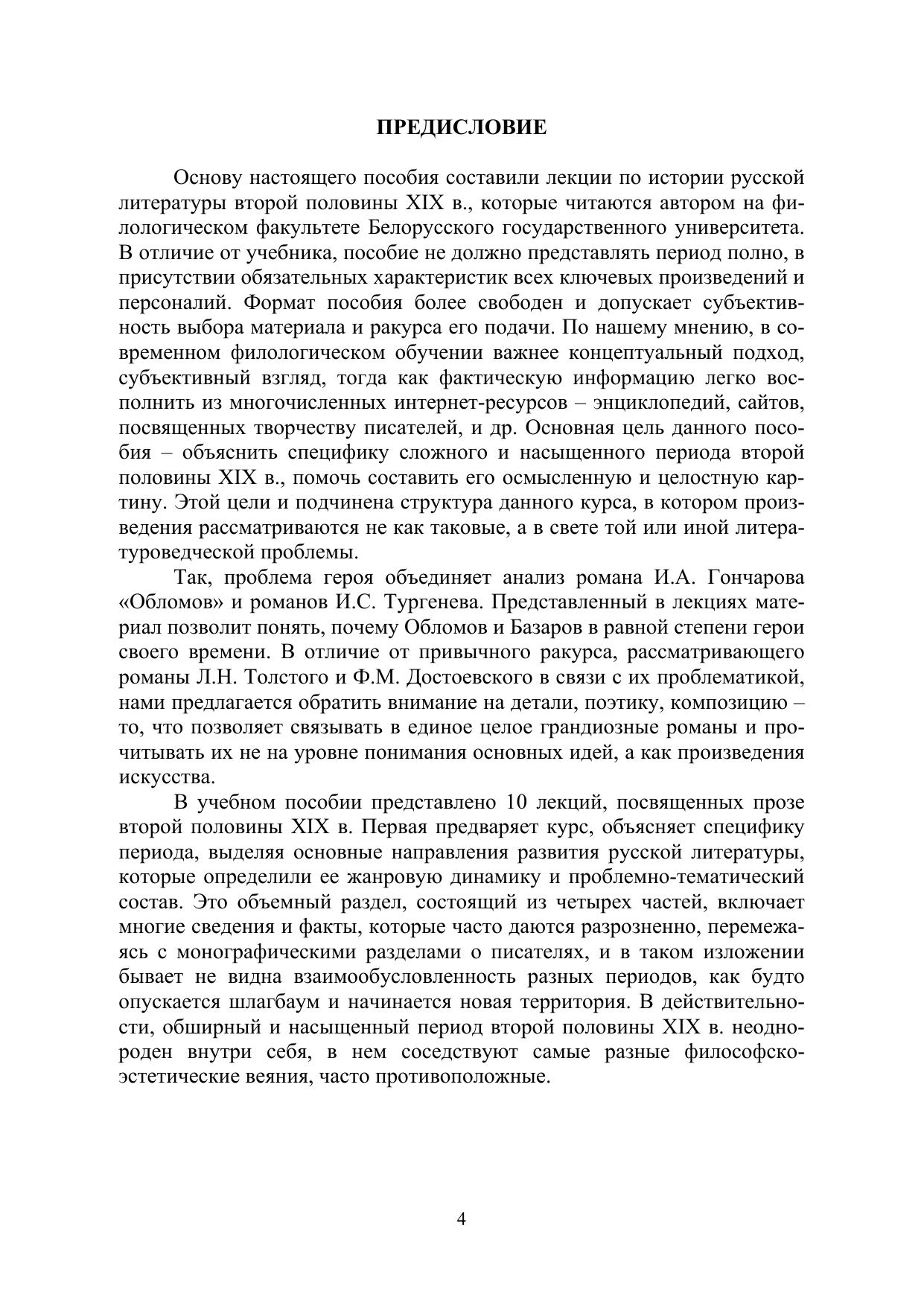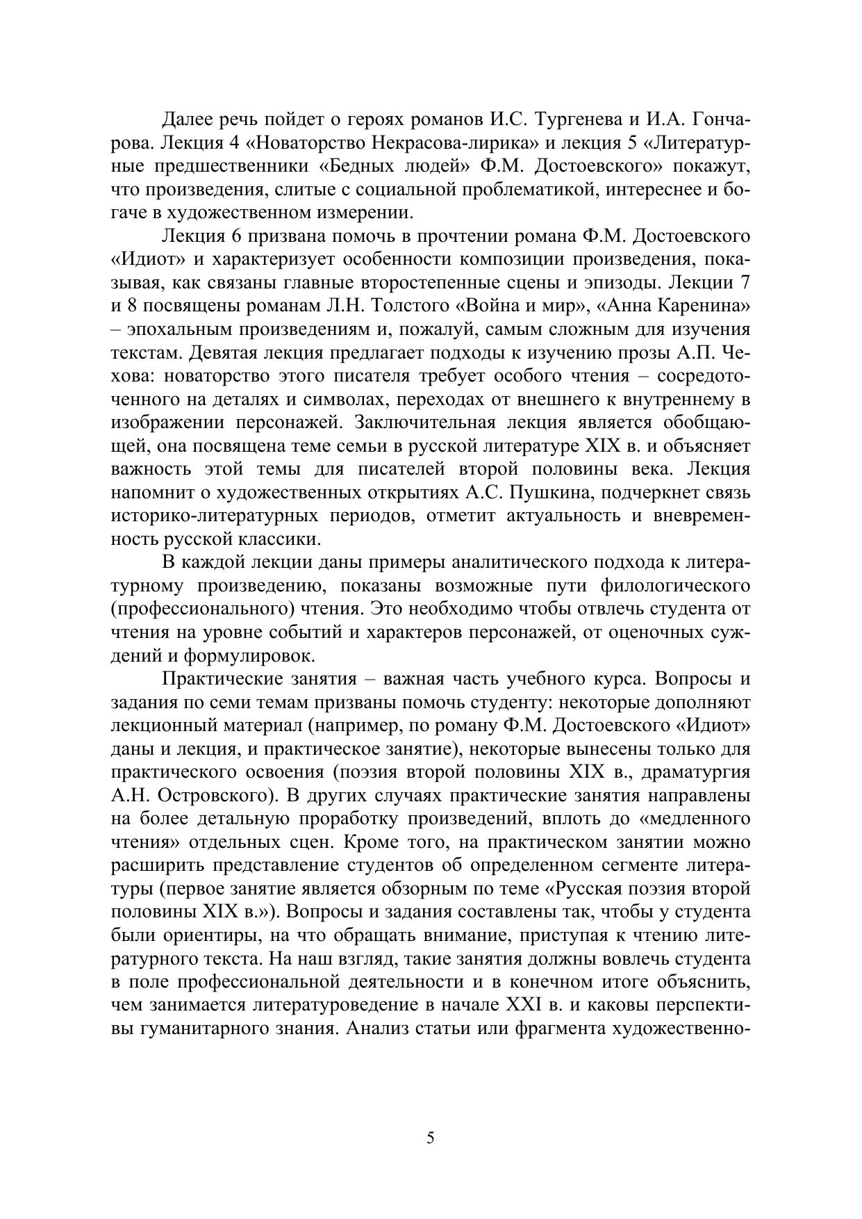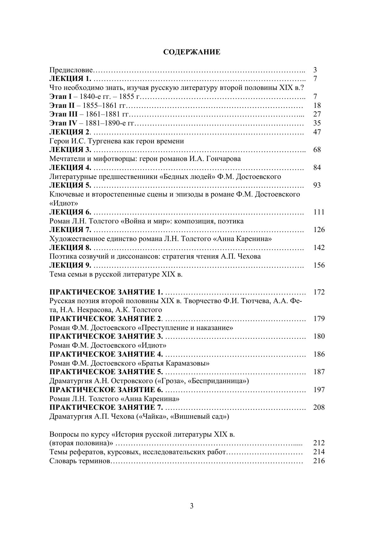 Учебное издание включает 10 лекций, 7 практических занятий, элементы хрестоматии, контрольные вопросы, темы рефератов, курсовых и исследовательских работ, словарь терминов. Содержание охватывает весь курс истории русской литературы второй половины ХIХ в. Первая обзорная лекция характеризует период в целом. В соответствии с четырьмя периодами отмечены важнейшие историко-культурные явления, показано движение жанровых процессов в поэзии, прозе, драматургии. Восемь лекций посвящены романам И.С. Тургенева, И.А. Гончарова, Ф.М. Достоевского, Л.Н. Толстого, прозе А.П. Чехова. Заключительная лекция посвящена теме семьи в русской литературе ХІХ в. Тематика практических занятий включает, кроме прозы, поэзию и драматургию.