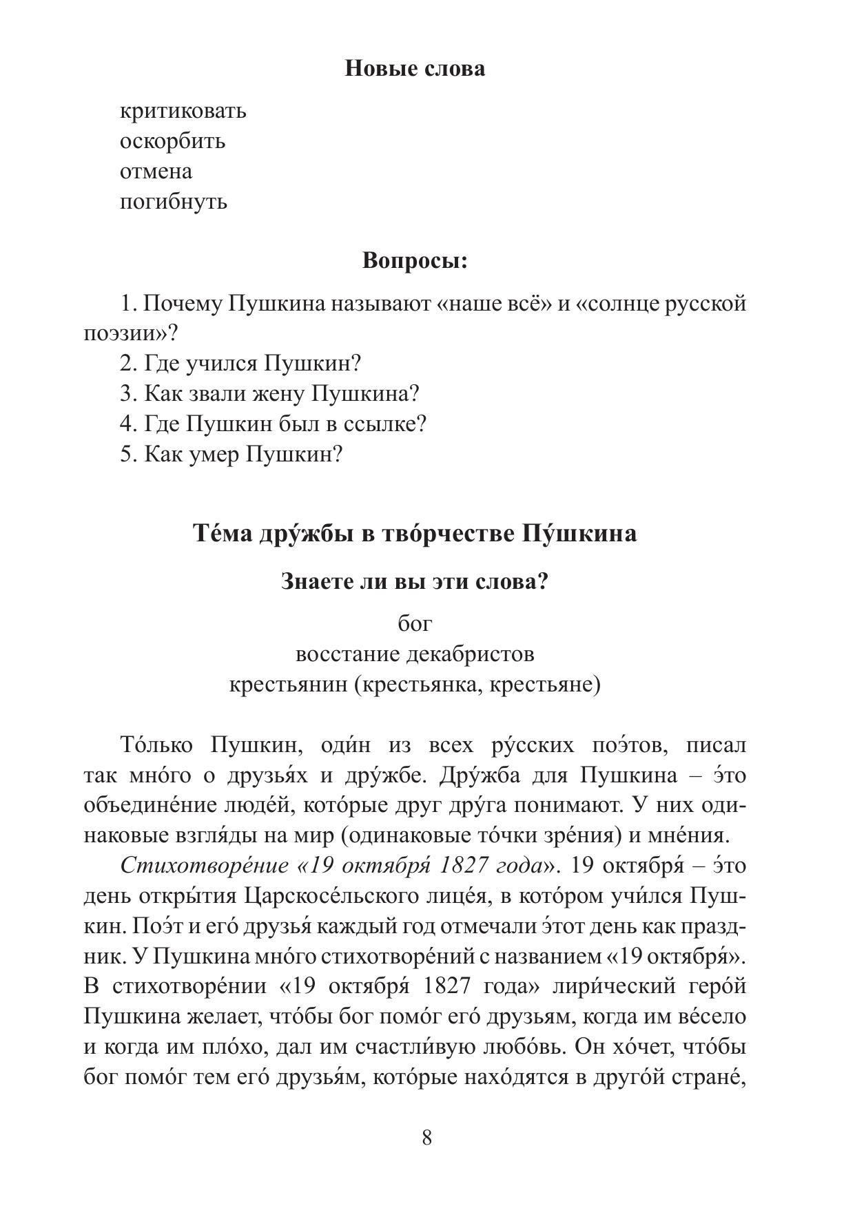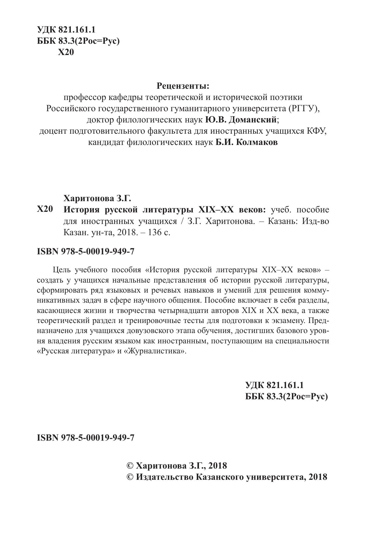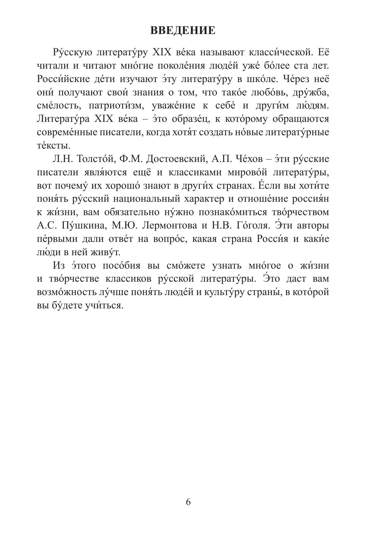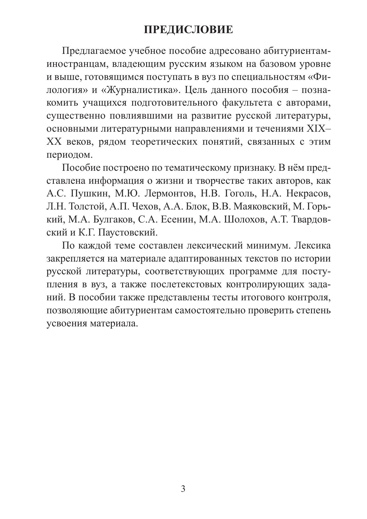 Цель учебного пособия «История русской литературы XIX–ХХ веков» – создать у учащихся начальные представления об истории русской литературы, сформировать ряд языковых и речевых навыков и умений для решения коммуникативных задач в сфере научного общения. Пособие включает в себя разделы, касающиеся жизни и творчества четырнадцати авторов XIX и ХХ века, а также теоретический раздел и тренировочные тесты для подготовки к экзамену. Предназначено для учащихся довузовского этапа обучения, достигших базового уровня владения русским языком как иностранным, поступающим на специальности «Русская литература» и «Журналистика».