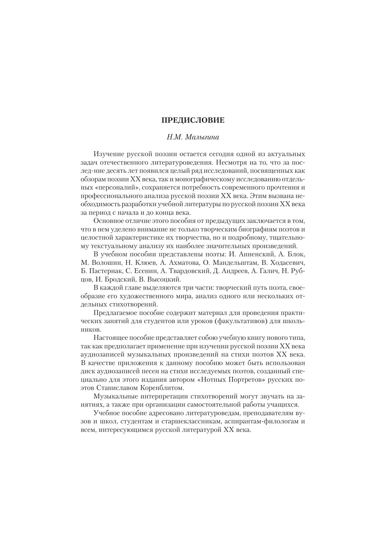 Учебное пособие посвящено изучению творчества поэтов ХХ века. Коллективом авторов рассматриваются творческие биографии и поэтические миры И. Анненского, А. Блока, М. Волошина, Н. Клюева, А. Ахматовой, О. Мандельштама, В. Ходасевича, Б. Пастернака, С. Есенина, А. Твардовского, Д. Андреева, А. Галича, Н. Рубцова, И. Бродского, В. Высоцкого. В каждой главе представлен творческий путь поэта, раскрыто своеобразие его художественного мира и дан анализ поэтики его отдельных произведений. Предлагаемое пособие содержит материалы, которые могут использоваться при проведении практических занятий. Для студентов, аспирантов, преподавателей филологических факультетов вузов, учителей-словесников.