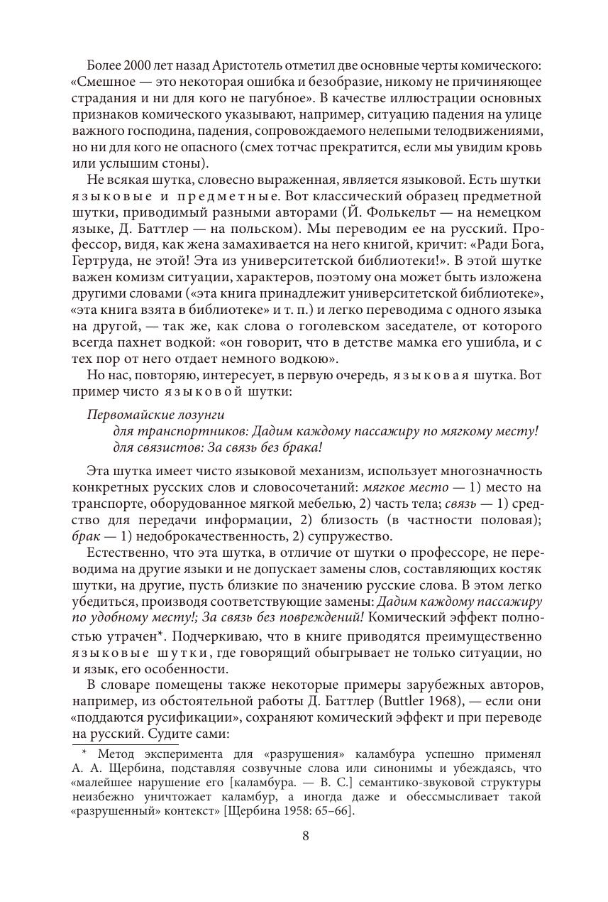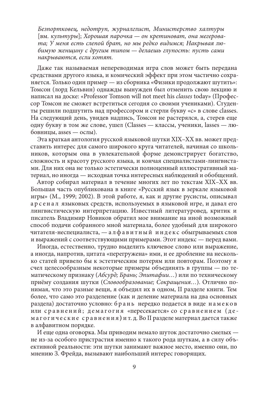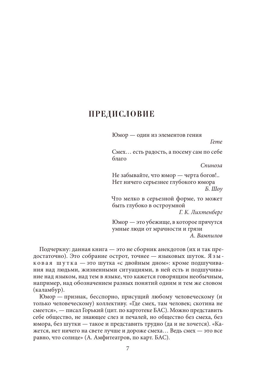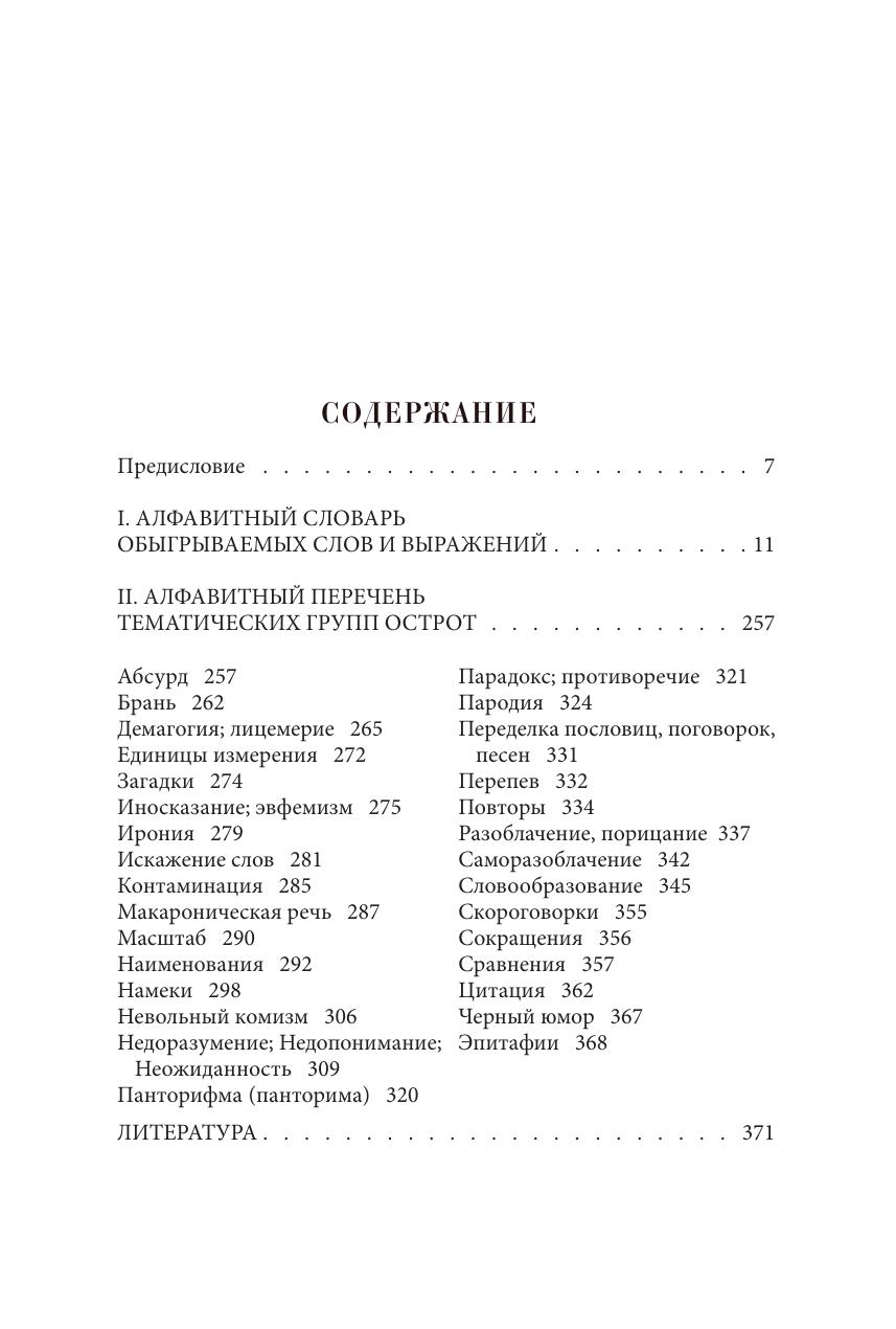 Книга представляет собой краткую антологию русской языковой шутки, построенную на собранном автором материале русского фольклора, периодики и художественной литературы XIX—XX вв. Для удобства читателя принят алфавитный порядок приведения материала: в начале приводятся статьи, где обыгрываются слова на букву А, затем на другие буквы алфавита. Например, среди статей на букву П – статья Пол, включающая примеры: Крашеный пол (женский) (Эмиль Кроткий), Раньше носили платья до пола, а теперь – до признаков пола, Танцы – это трение двух полов о третий и т. д. В тех случаях, когда трудно выделить в шутке ключевое слово или выражение, примеры объединены в группы – по тематическому признаку (Абсурд, Брань, Эпитафии…) или по техническому приему создания шутки (Словообразование, Сокращения…). Книга может представить интерес для самого широкого круга читателей.