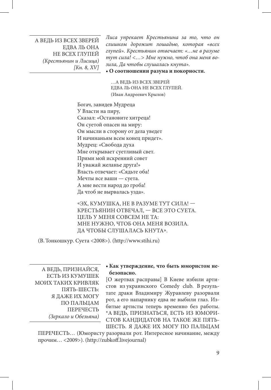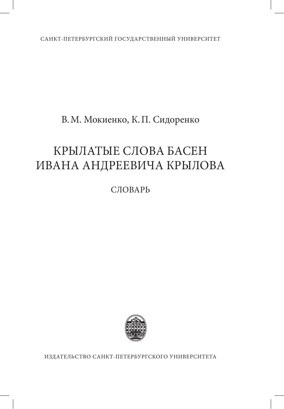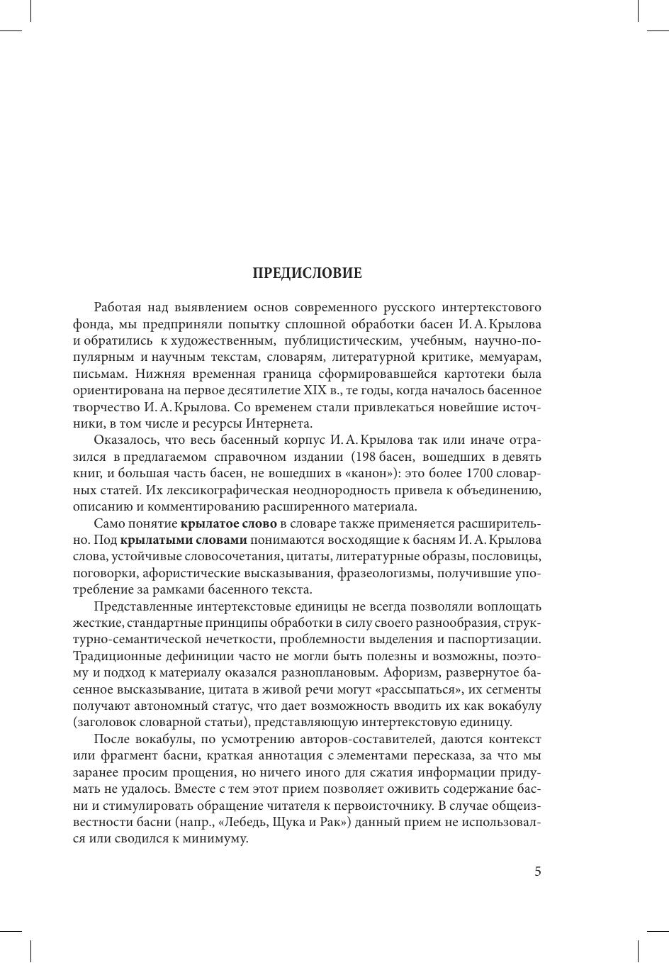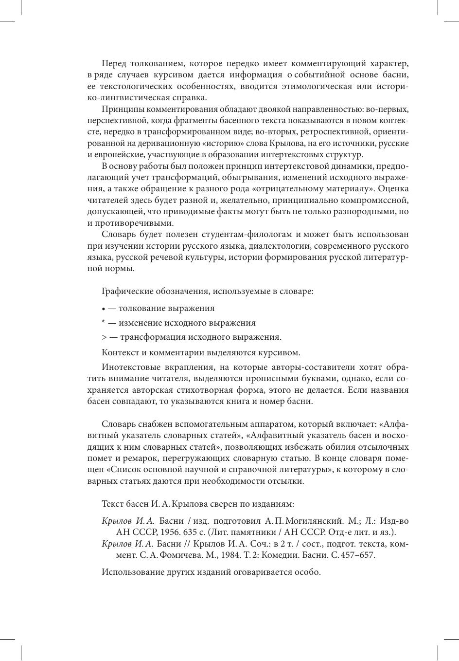 Словарь представляет собой собрание цитат, литературных образов и крылатых выражений, восходящих к басням И. А. Крылова. Издание включает более 1700 словарных статей, созданных на основе обработки материалов публицистики, художественной, научной, научно-популярной, эпистолярной и мемуарной литературы, а также периодической печати за последние два столетия. Значительное место в словаре занимают источники Интернета. В книге рассматриваются все басни И. А. Крылова (198 произведений), объединенные в «канонические» 9 книг, а также большая часть басен, не вошедших в основной корпус. Справочник предназначен, в первую очередь, для студентов-филологов, изучающих историю русского литературного языка, русскую диалектологию, современный русский язык, историю формирования русской речевой культуры. Книга будет полезна преподавателям-словесникам, учащимся средних учебных заведений, а также всем, кому дорого творчество Ивана Андреевича Крылова.