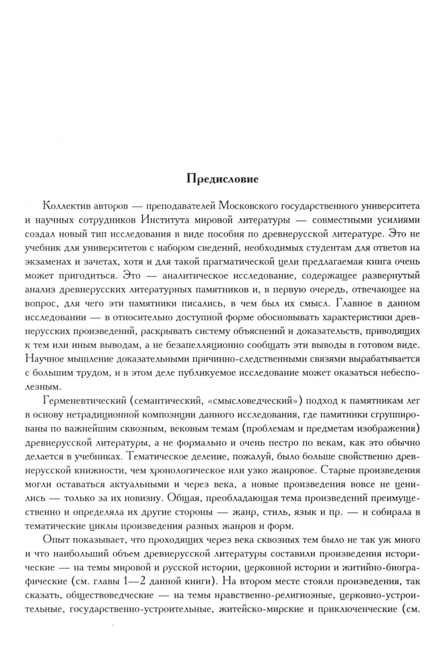 Коллектив авторов - преподавателей МГУ и научных сотрудников ИМЛИ совместными усилиями создал новый тип исследования в виде пособия по древнерусской литературе. Это не университетский учебник с набором сведений необходимых студентам для ответов на экзаменах и зачетах, хотя и для такой прагматической цели предлагаемая книга очень может пригодиться. Это — аналитическое исследование, содержащее развернутый анализ древнерусских литературных памятников и в первую очередь отвечающее на вопрос, для чего памятники писались, в чем был их смысл. Главное в данном исследовании в относительно доступной форме обосновывать характеристики древнерусских произведений, раскрывать систему доказательств, приводящих к тем или иным выводам, а не безапелляционно сообщать эти выводы в готовом виде. Научное мышление доказательными причинно-следственными связями вырабатывается с большим трудом, и в этом деле публикуемое исследование может оказаться небесполезным.