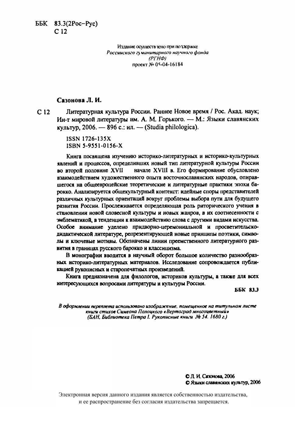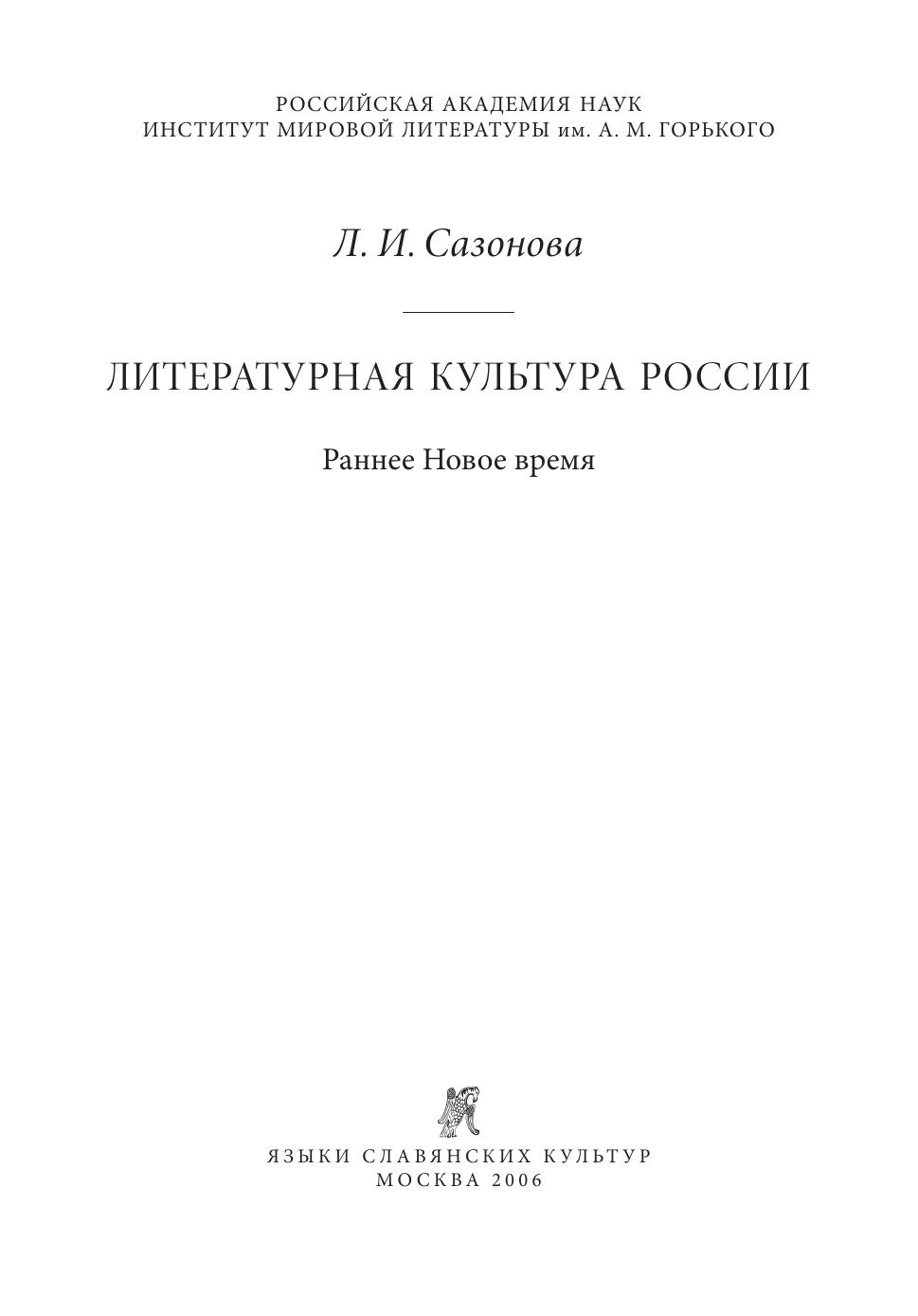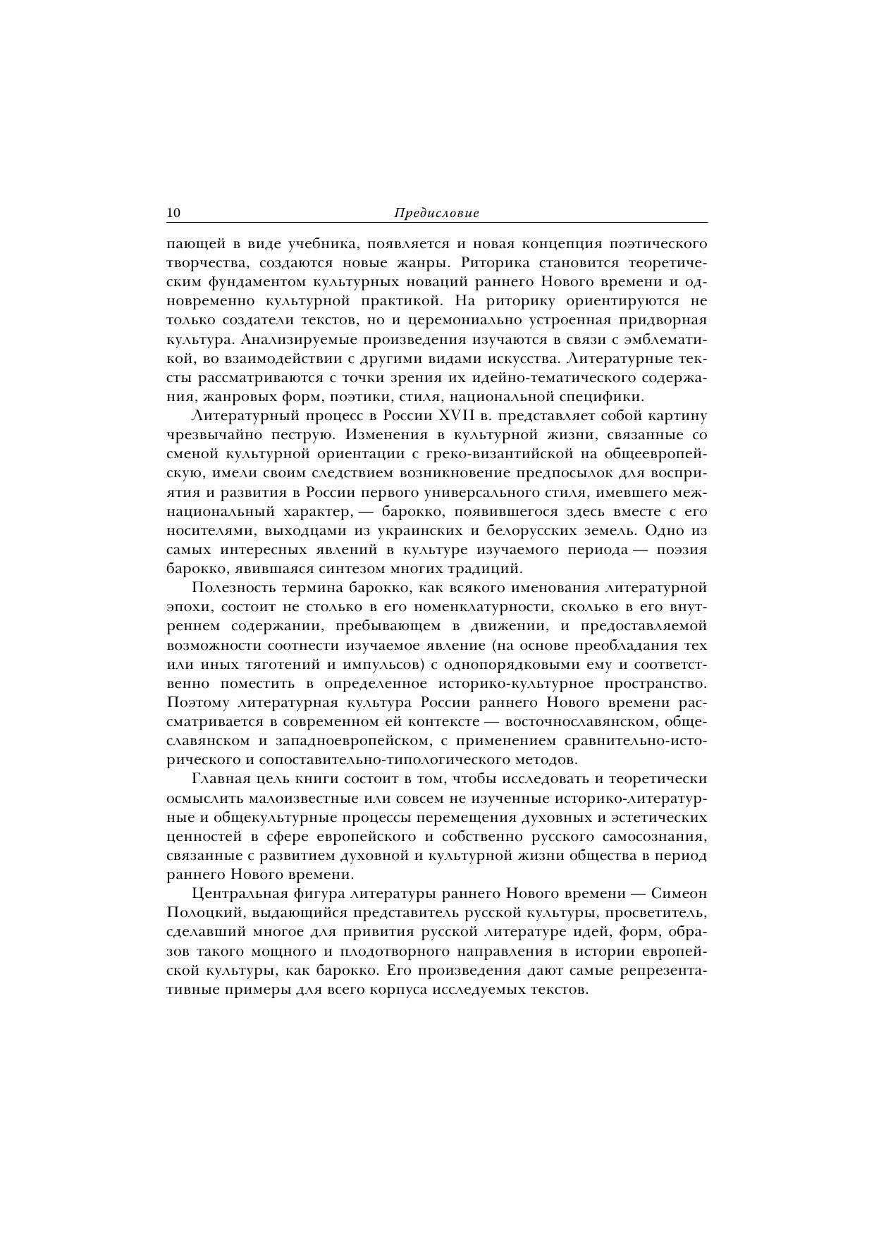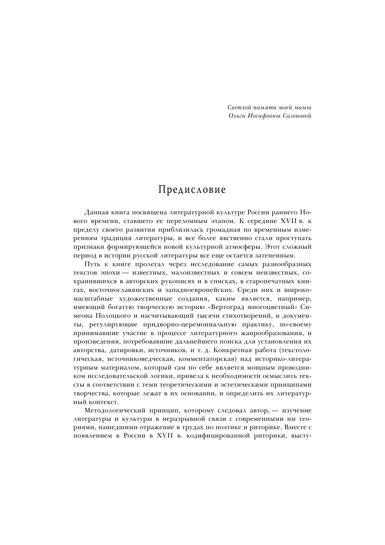 Книга посвящена изучению историко-литературных и историко-культурных явлений и процессов, определивших новый тип литературной культуры России во второй половине XVII — начале XVIII в. Его формирование обусловлено взаимодействием художественного опыта восточнославянских народов, опиравшегося на общеевропейские теоретические и литературные практики эпохи барокко. Анализируется общекультурный контекст: идейные споры представителей различных культурных ориентации вокруг проблемы выбора пути для будущего развития России. Прослеживается определяющая роль риторического учения в становлении новой словесной культуры и новых жанров, в их соотнесенности с эмблематикой, в тенденции к взаимодействию слова с другими видами искусства. Особое внимание уделено придворно-церемониальной и просветительско-дидактической литературе, репрезентирующей новые принципы поэтики, символы и ключевые мотивы. Обозначены линии преемственного литературного развития в границах русского барокко и классицизма. В монографии вводится в научный оборот большое количество разнообразных историко-литературных материалов. Исследование сопровождается публикацией рукописных и старопечатных произведений. Книга предназначена для филологов, историков культуры, а также для всех интересующихся вопросами литературы и культуры России.