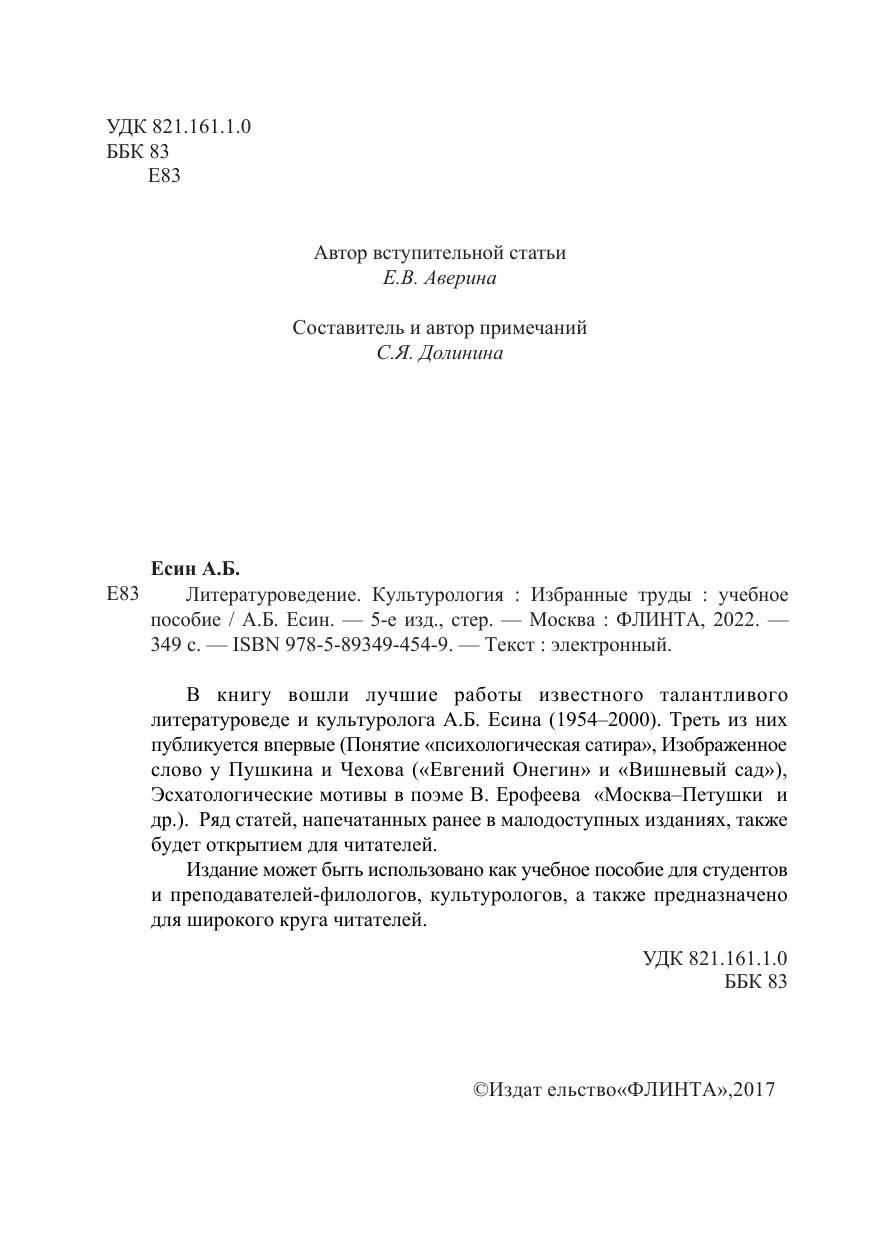 В книгу вошли лучшие работы известного талантливого литературоведе и культуролога А.Б. Есина (1954–2000). Треть из них публикуется впервые (Понятие «психологическая сатира», Изображенное слово у Пушкина и Чехова («Евгений Онегин» и «Вишневый сад»), Эсхатологические мотивы в поэме В. Ерофеева «Москва–Петушки и др.). Ряд статей, напечатанных ранее в малодоступных изданиях, также будет открытием для читателей.