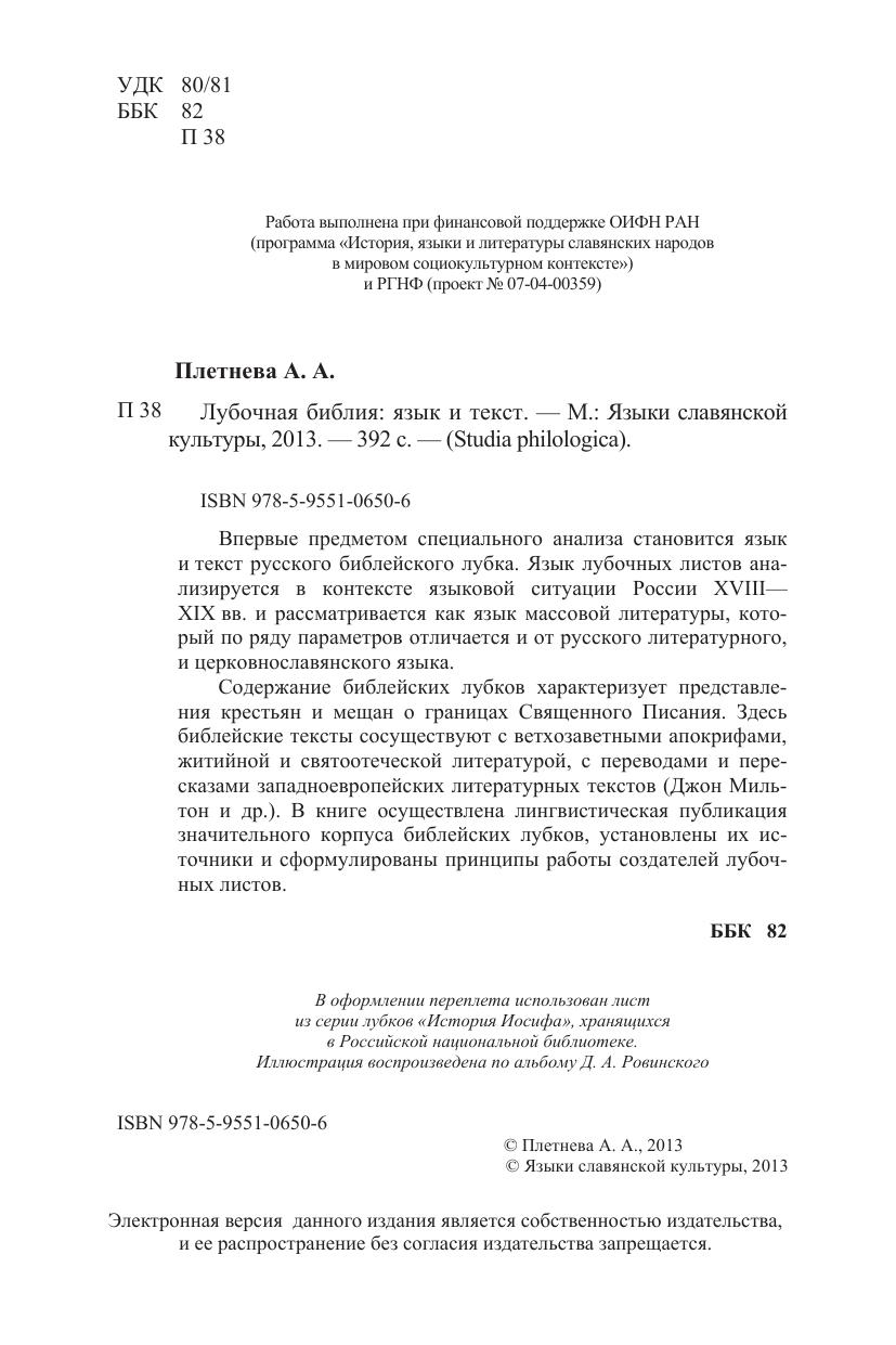 Впервые предметом специального анализа становится язык и текст русского библейского лубка. Язык лубочных листов анализируется в контексте языковой ситуации России XVIII—XIX вв. и рассматривается как язык массовой литературы, который по ряду параметров отличается и от русского литературного, и церковнославянского языка. Содержание библейских лубков характеризует представления крестьян и мещан о границах Священного Писания. Здесь библейские тексты сосуществуют с ветхозаветными апокрифами, житийной и святоотеческой литературой, с переводами и пересказами западноевропейских литературных текстов (Джон Мильтон и др.). В книге осуществлена лингвистическая публикация значительного корпуса библейских лубков, установлены их источники и сформулированы принципы работы создателей лубочных листов.