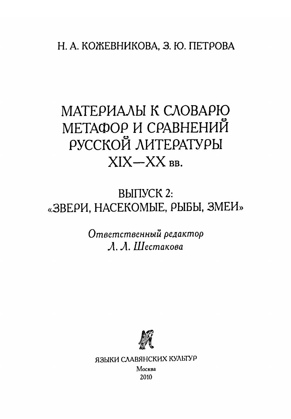 Материалы к словарю метафор и сравнений русской литературы XIX—XX вв. Вып. 2: Звери, насекомые, рыбы, змеи / Отв. ред. Л. Л. Шестакова