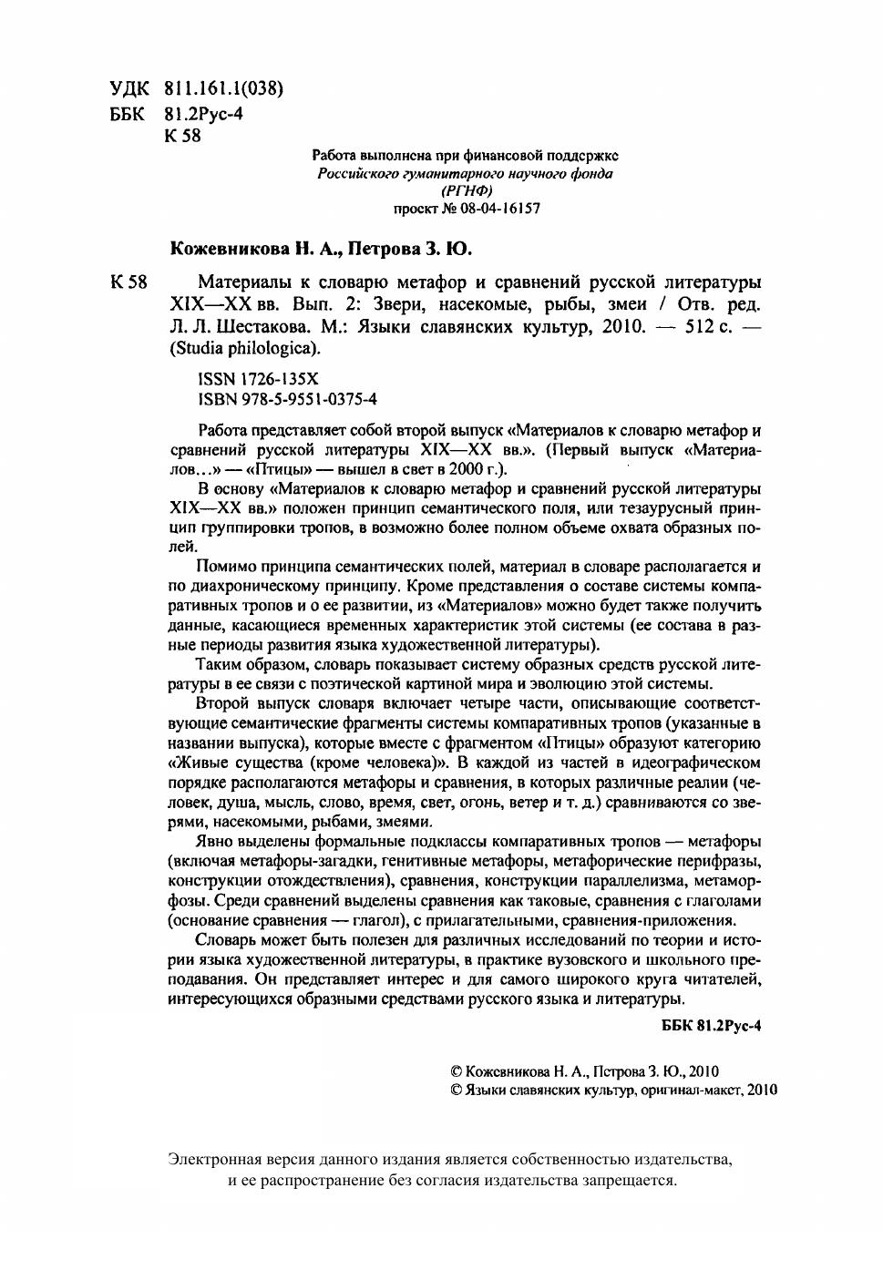 Работа представляет собой второй выпуск "Материалов к словарю метафор и сравнений русской литературы XIX-XX вв.". В основу "Материалов к словарю метафор и сравнений русской литературы XIX-XX вв." положен принцип семантического поля, или тезаурусный принцип группировки тропов, в возможно более полном объеме охвата образных полей. Помимо принципа семантических полей, материал в словаре располагается и по диахроническому принципу. Кроме представления о составе системы компаративных тропов и о ее развитии, из "Материалов" можно будет также получить данные, касающиеся временных характеристик этой системы (ее состава в разные периоды развития языка художественной литературы). Таким образом, словарь показывает систему образных средств русской литературы в ее связи с поэтической картиной мира и эволюцию этой системы. Второй выпуск словаря включает четыре части, описывающие соответствующие семантические фрагменты системы компаративных тропов (указанные в названии выпуска), которые вместе с фрагментом "Птицы" образуют категорию "Живые существа (кроме человека)". В каждой из частей в идеографическом порядке располагаются метафоры и сравнения, в которых различные реалии (человек, душа, мысль, слово, время, свет, огонь, ветер и т. д.) сравниваются со зверями, насекомыми, рыбами, змеями. Явно выделены формальные подклассы компаративных тропов - метафоры (включая метафоры-загадки, генитивные метафоры, метафорические перифразы, конструкции отождествления), сравнения, конструкции параллелизма, метаморфозы. Среди сравнений выделены сравнения как таковые, сравнения с глаголами (основание сравнения - глагол), с прилагательными, сравнения-приложения. Словарь может быть полезен для различных исследований по теории и истории языка художественной литературы, в практике вузовского и школьного преподавания. Он представляет интерес и для самого широкого круга читателей, интересующихся образными средствами русского языка и литературы.