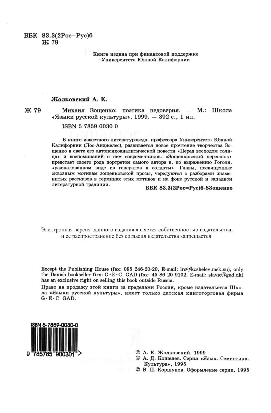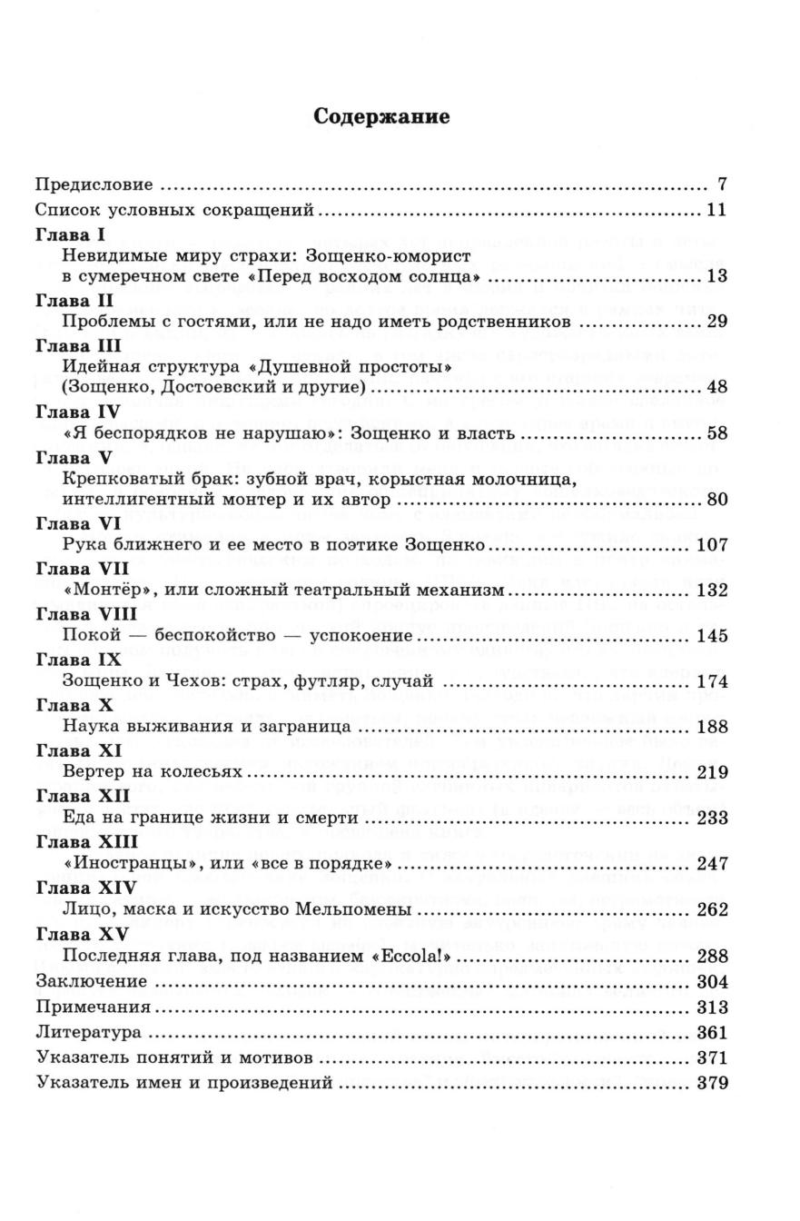 В книге известного литературоведа, профессора Университета Южной Калифорнии (Лос-Анджелес), развивается новое прочтение творчества Зощенко в свете его автопсихоаналитической повести «Перед восходом солнца» и воспоминаний о нем современников. «Зощенковский персонаж» предстает своего рода портретом самого автора в, по выражению Гоголя, «разжалованном виде из генералов в солдаты». Главы, посвященные сквозным мотивам зощенковской прозы, чередуются с разборами знаменитых рассказов в терминах этих мотивов и на фоне русской и западной литературной традиции.