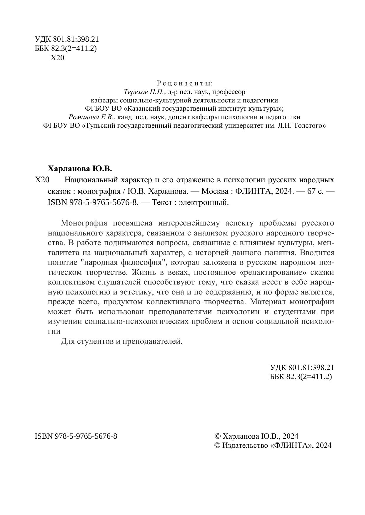 Монография посвящена интереснейшему аспекту проблемы русского национального характера, связанном с анализом русского народного творчества. В работе поднимаются вопросы, связанные с влиянием культуры, менталитета на национальный характер, с историей данного понятия. Вводится понятие "народная философия", которая заложена в русском народном поэтическом творчестве. Жизнь в веках, постоянное «редактирование» сказки коллективом слушателей способствуют тому, что сказка несет в себе народную психологию и эстетику, что она и по содержанию, и по форме является, прежде всего, продуктом коллективного творчества. Для студентов и преподавателей.
