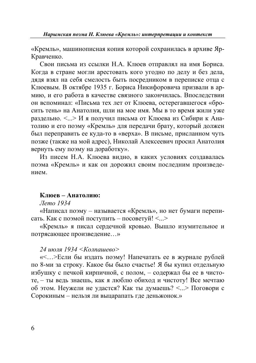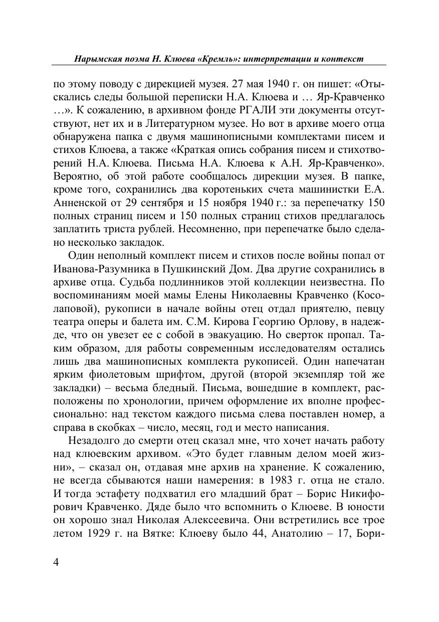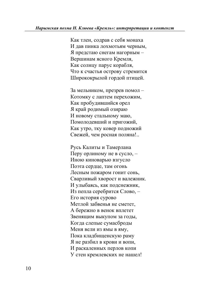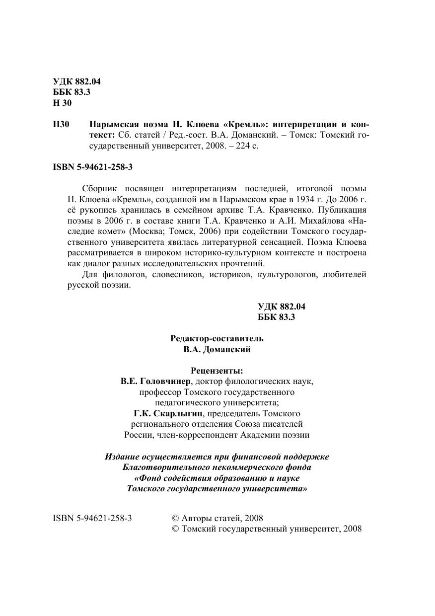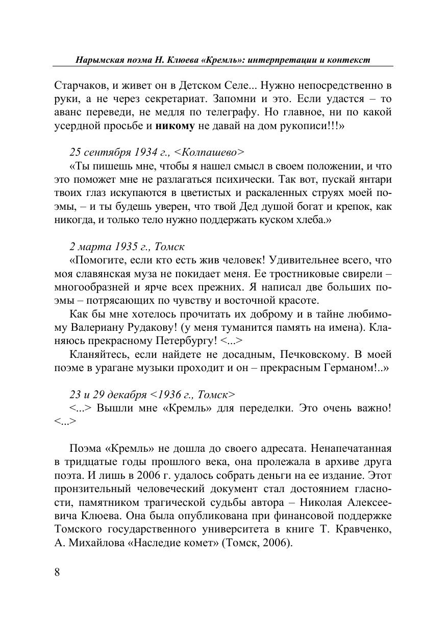Сборник посвящен интерпретациям последней, итоговой поэмы Н. Клюева «Кремль», созданной им в Нарымском крае в 1934 г. До 2006 г. её рукопись хранилась в семейном архиве Т.А. Кравченко. Публикация поэмы в 2006 г. в составе книги Т.А. Кравченко и А.И. Михайлова «Наследие комет» (Москва, Томск, 2006) при содействии Томского государственного университета явилась литературной сенсацией. Поэма Клюева рассматривается в широком историко-культурном контексте и построена как диалог разных исследовательских прочтений. Для филологов, словесников, историков, культурологов, любителей русской поэзии.