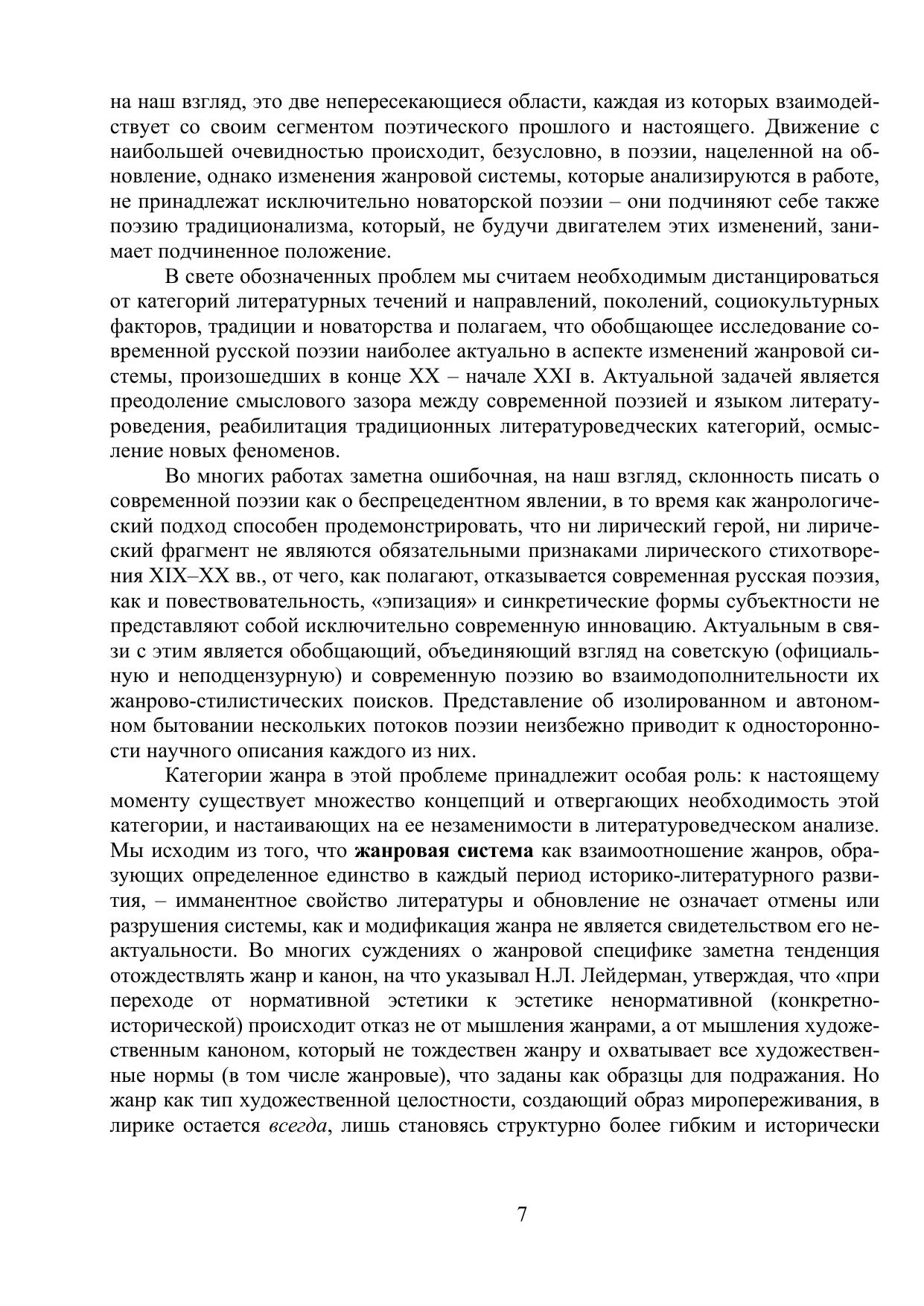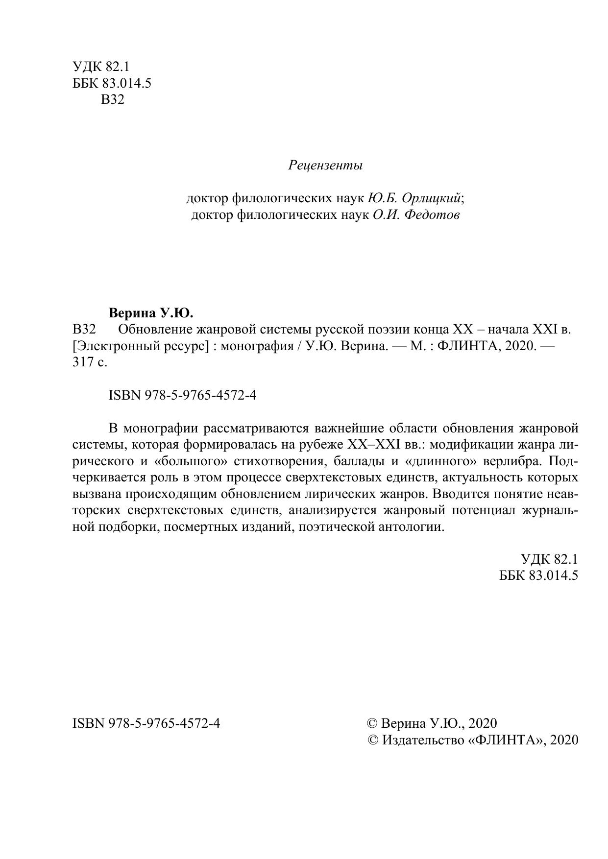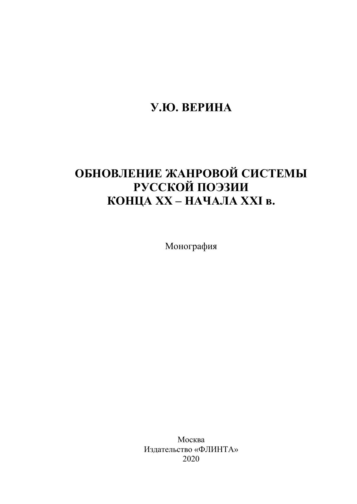 В монографии рассматриваются важнейшие области обновления жанровой системы, которая формировалась на рубеже ХХ–ХХІ вв.: модификации жанра лирического и «большого» стихотворения, баллады и «длинного» верлибра. Подчеркивается роль в этом процессе сверхтекстовых единств, актуальность которых вызвана происходящим обновлением лирических жанров. Вводится понятие неавторских сверхтекстовых единств, анализируется жанровый потенциал журнальной подборки, посмертных изданий, поэтической антологии.