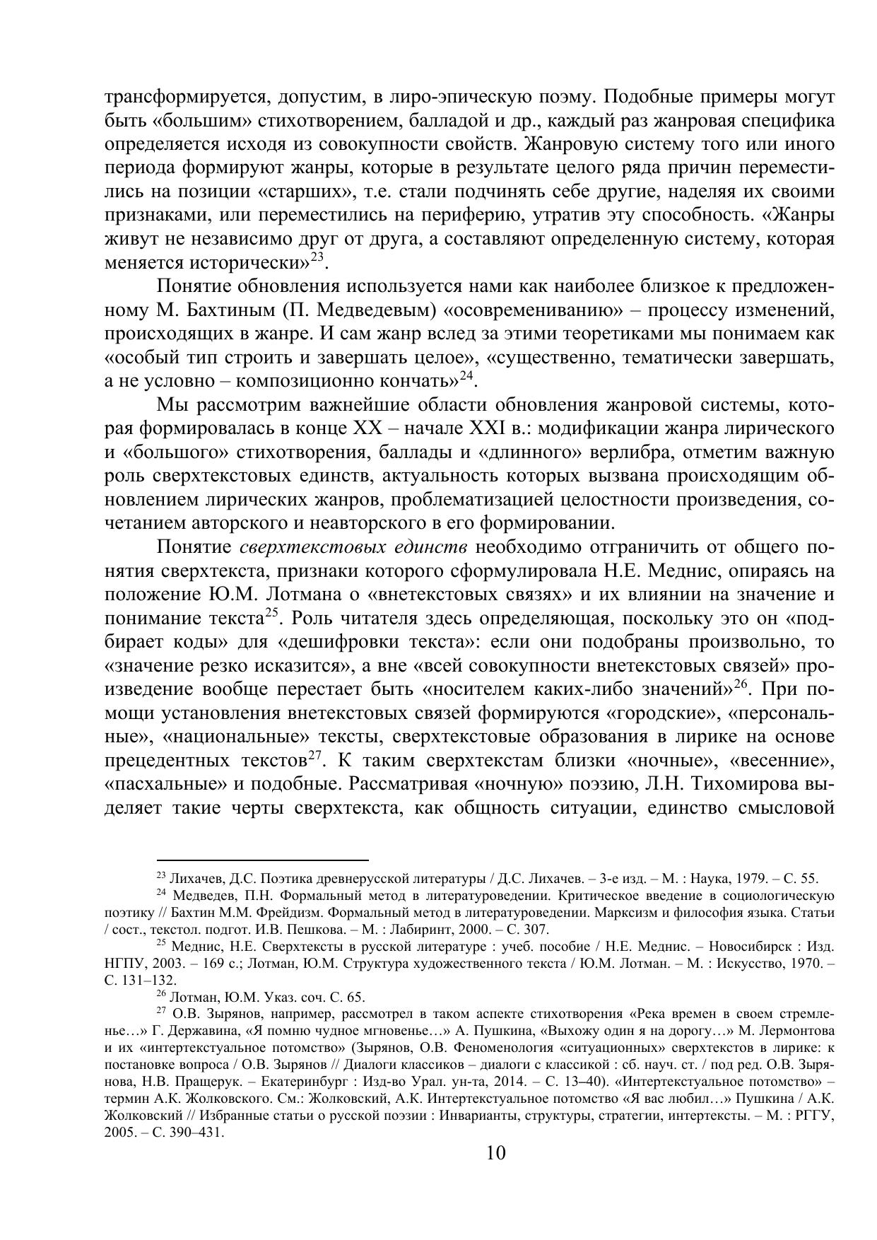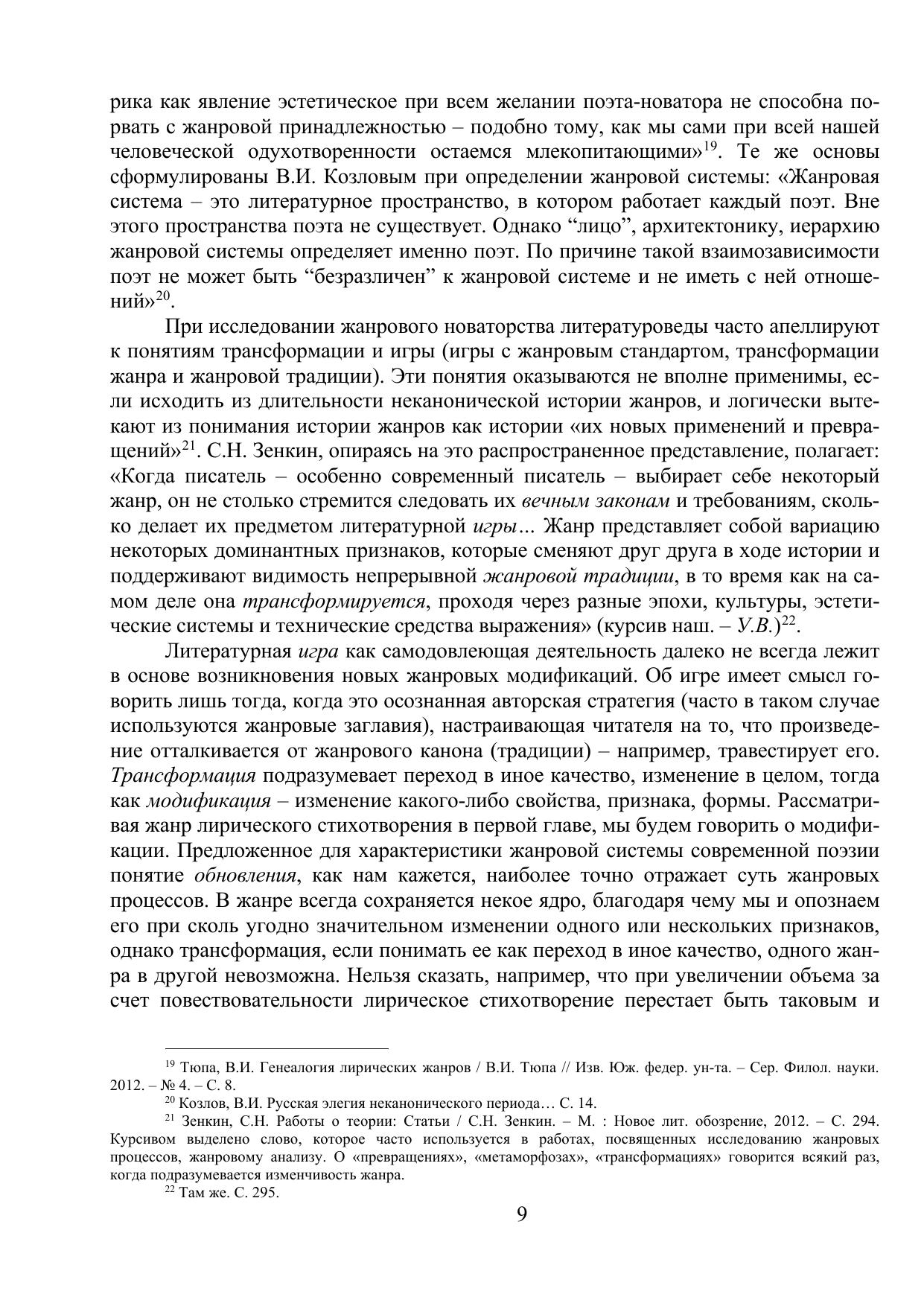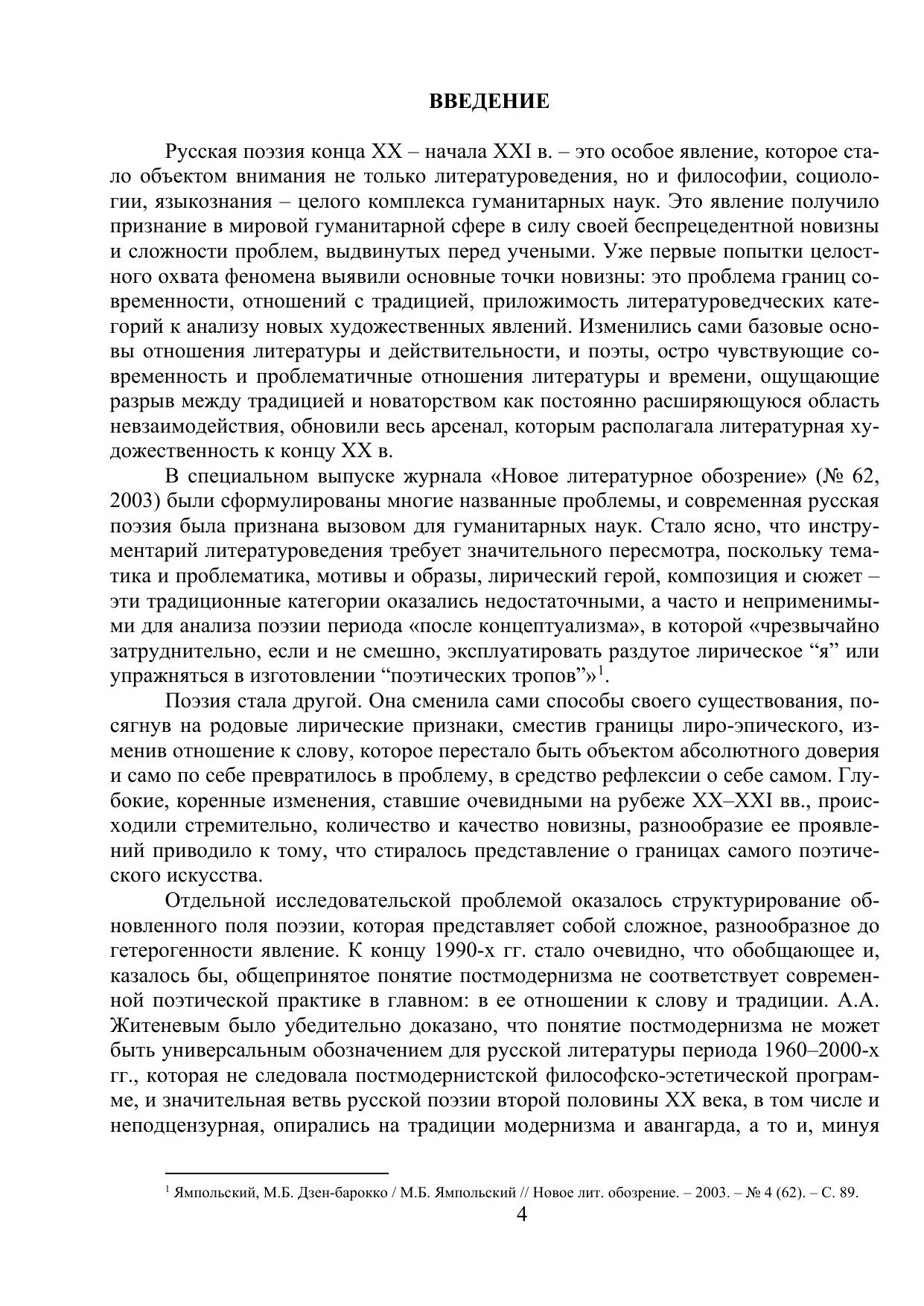 В монографии рассматриваются важнейшие области обновления жанровой системы, которая формировалась на рубеже ХХ–ХХІ вв.: модификации жанра лирического и «большого» стихотворения, баллады и «длинного» верлибра. Подчеркивается роль в этом процессе сверхтекстовых единств, актуальность которых вызвана происходящим обновлением лирических жанров. Вводится понятие неавторских сверхтекстовых единств, анализируется жанровый потенциал журнальной подборки, посмертных изданий, поэтической антологии.