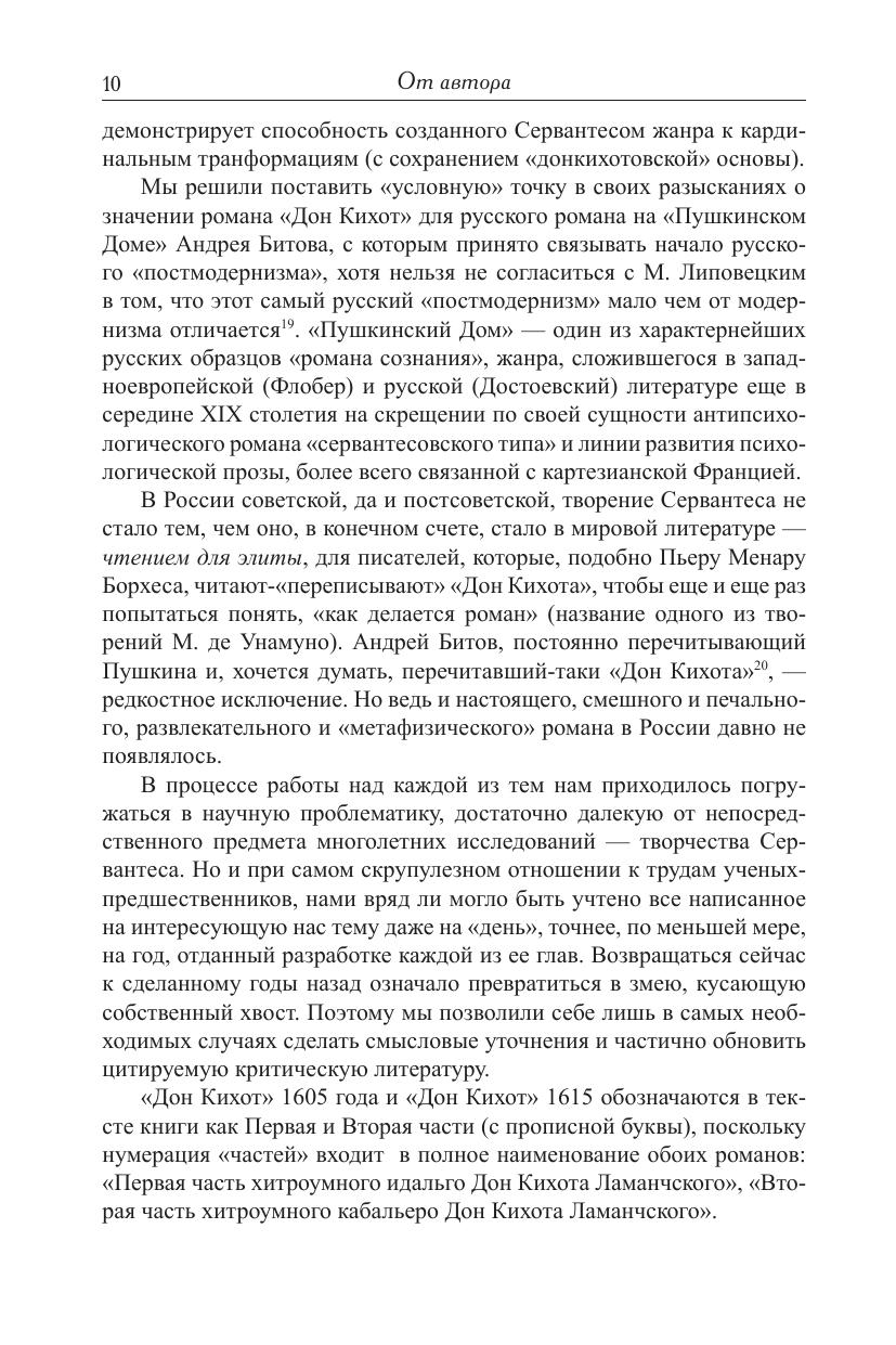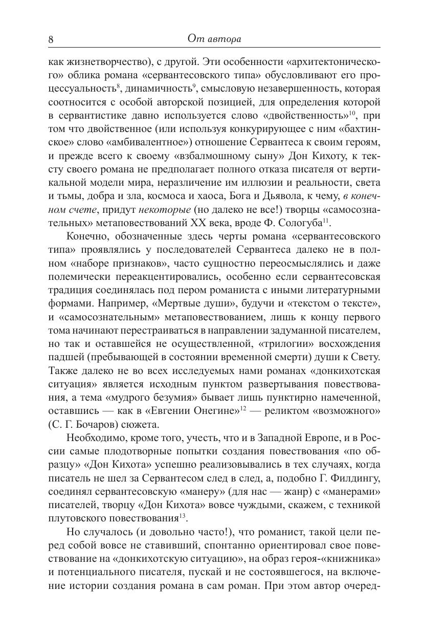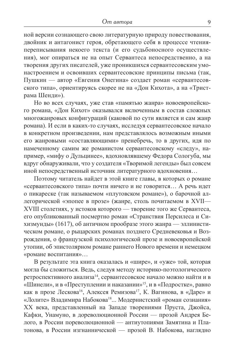 Центральная тема книги - судьба романа «сервантесовского типа» в русской литературе XIX-XX веков. Под романом «сервантесовского типа» автор книги понимает созданную Сервантесом в «Дон Кихоте» модель новоевропейского «романа сознания», в том или ином виде эксплуатирующего так называемую «донкихотскую ситуацию». Уже став «памятью жанра» новоевропейского романа, «Дон Кихот» оказался включенным в состав сложных многожанровых конфигураций. Поэтому читатель найдет в книге главы, в которых речь идет также о пикареске (так называемом «плутовском романе»), о барочной аллегорической «эпопее в прозе», о новоевропейской утопии, об эпистолярном романе, немецком «романе воспитания», французском психологическом романе. Модернистский «роман сознания» XX века, представленный на Западе творениями Пруста, Джойса, Кафки, Унамуно, в дореволюционной России - прозой Андрея Белого, в России послереволюционной - антиутопиями