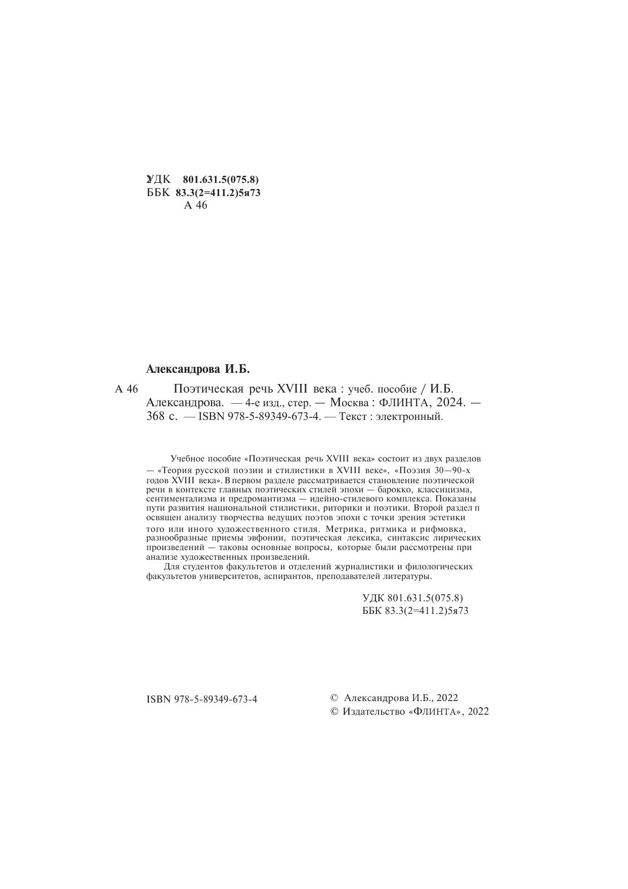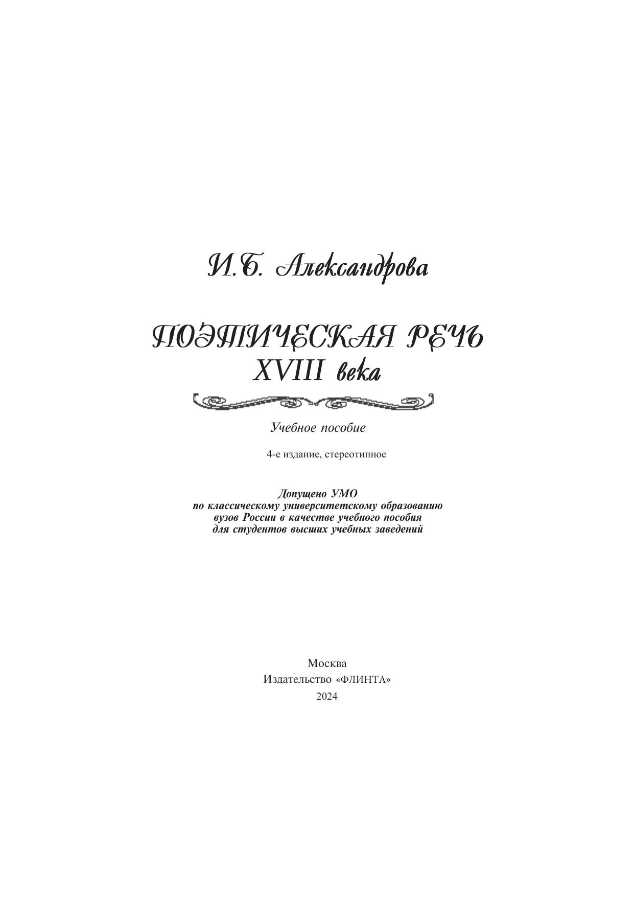 Учебное пособие «Поэтическая речь XVIII века» состоит из двух разделов - «Теория русской поэзии и стилистики в XVIII веке», «Поэзия 30-90-х годов XVIII века». В первом разделе рассматривается становление поэтической речи в контексте главных поэтических стилей эпохи - барокко, классицизма, сентиментализма и предромантизма - идейно-стилевого комплекса. Показаны пути развития национальной стилистики, риторики и поэтики. второй раздел посвящен анализу творчества ведущих поэтов эпохи с точки зрения эстетики того или иного художественного стиля. Метрика, ритмика и рифмовка, разнообразные приемы эвфонии, поэтическая лексика, синтаксис лирических произведений - таковы основные вопросы, которые были рассмотрены при анализе художественных произведений. Для студентов факультетов и отделений журналистики и филологических факультетов университетов, аспирантов, преподавателей литературы.