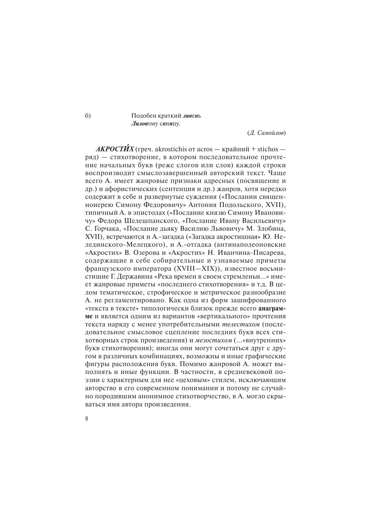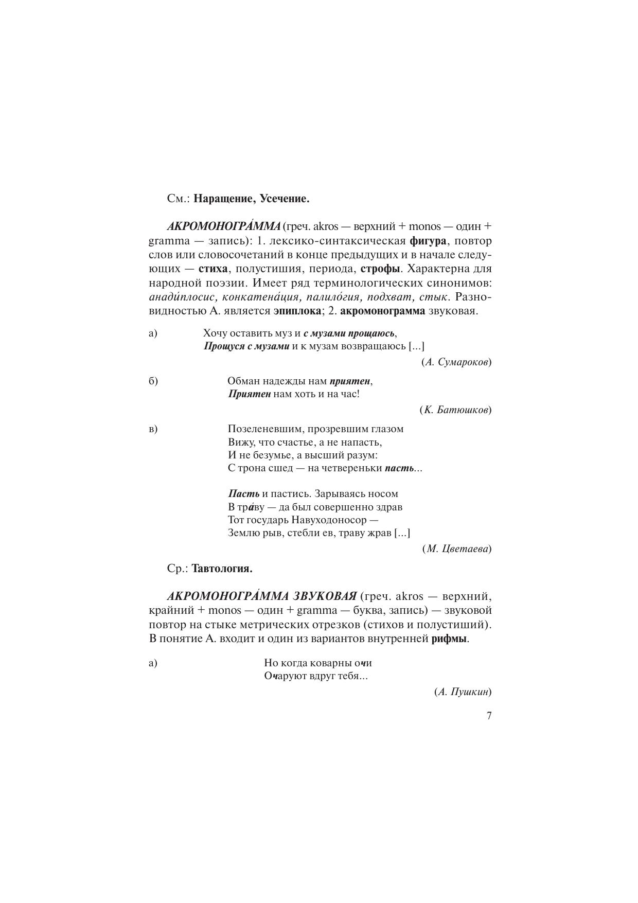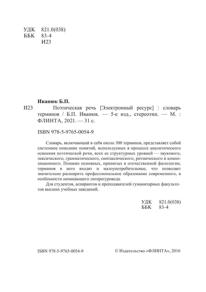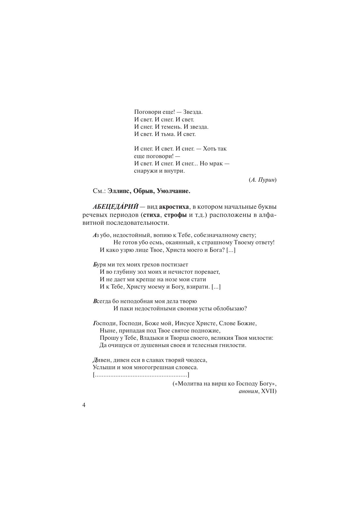 Словарь, включающий в себя около 300 терминов, представляет собой системное описание понятий, используемых в процессе аналитического освоения поэтической речи, всех ее структурных уровней — звукового, лексического, грамматического, синтаксического, ритмического и композиционного. Помимо основных, принятых в отечественной филологии, терминов в него входят и малоупотребительные, что позволяет значительно расширить профессиональное образование современного, в особенности начинающего литературоведа. Для студентов, аспирантов и преподавателей гуманитарных факультетов высших учебных заведений.