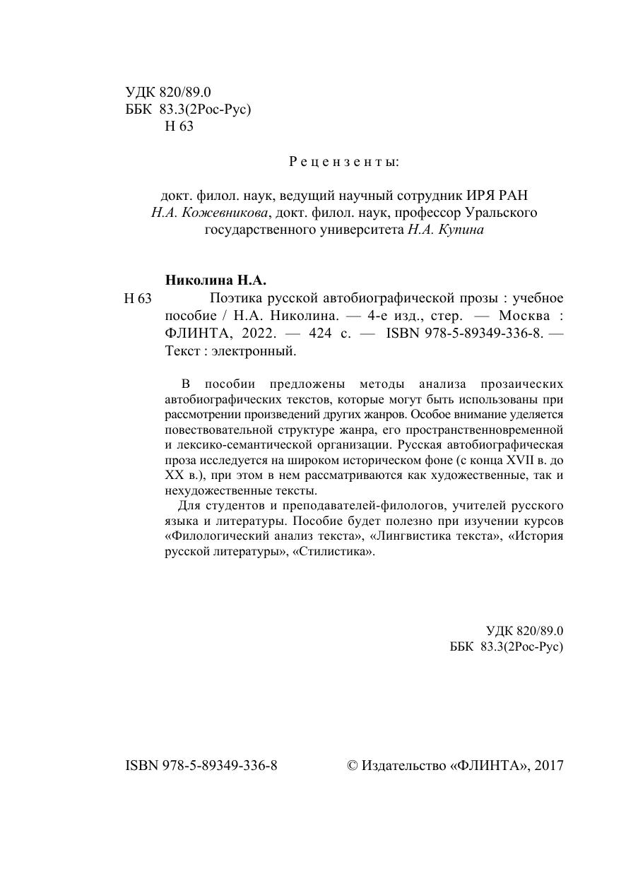 В пособии предложены методы анализа прозаических автобиографических текстов, которые могут быть использованы при рассмотрении произведений других жанров. Особое внимание уделяется повествовательной структуре жанра, его пространственновременной и лексико-семантической организации. Русская автобиографическая проза исследуется на широком историческом фоне (с конца XVII в. до ХХ в.), при этом в нем рассматриваются как художественные, так и нехудожественные тексты.