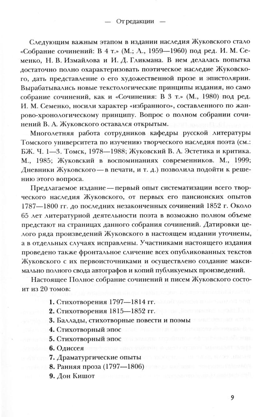 Полное собрание сочинений В. А. Жуковского впервые в эдиционной практике представляет наследие великого русского поэта в максимально полном на сегодняшний день объеме. Тексты Жуковского даны на основе критического осмысления всех известных автографов поэта и прижизненных публикаций. Настоящее издание состоит из 20 томов: тт. 1—2 включают лирику первого русского романтика 1797—1852 гг., тт. 3—6 – баллады и стихотворный эпос, т. 7 впервые представляет все драматургические опыты Жуковского, тт. 8—12 – прозу Жуковского, в том числе перевод «Дон Кишота», тт. 13—14 – полный свод его дневников, наконец, тт. 15—20 – все выявленные на сегодняшний день письма Жуковского.