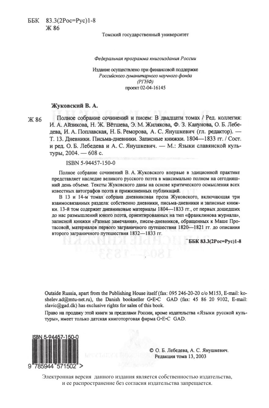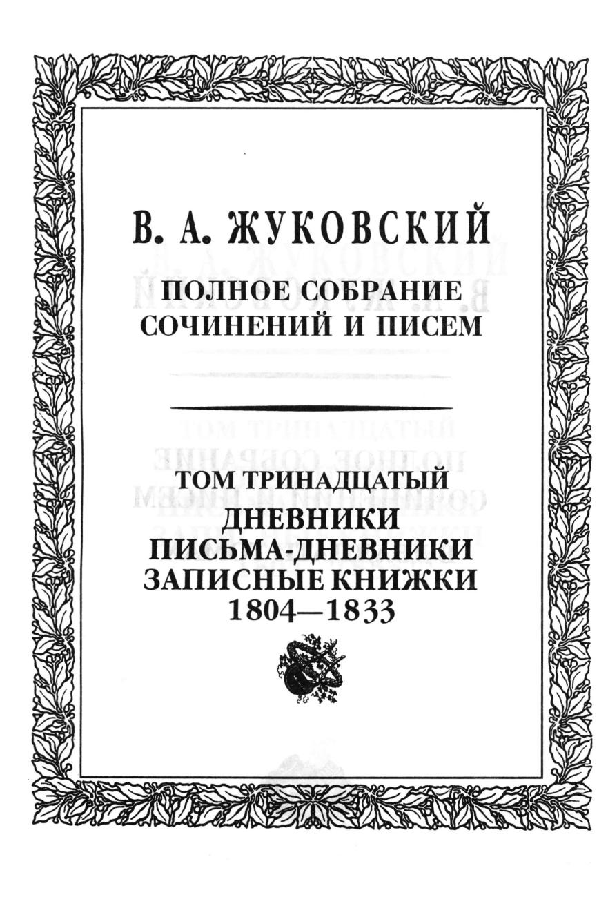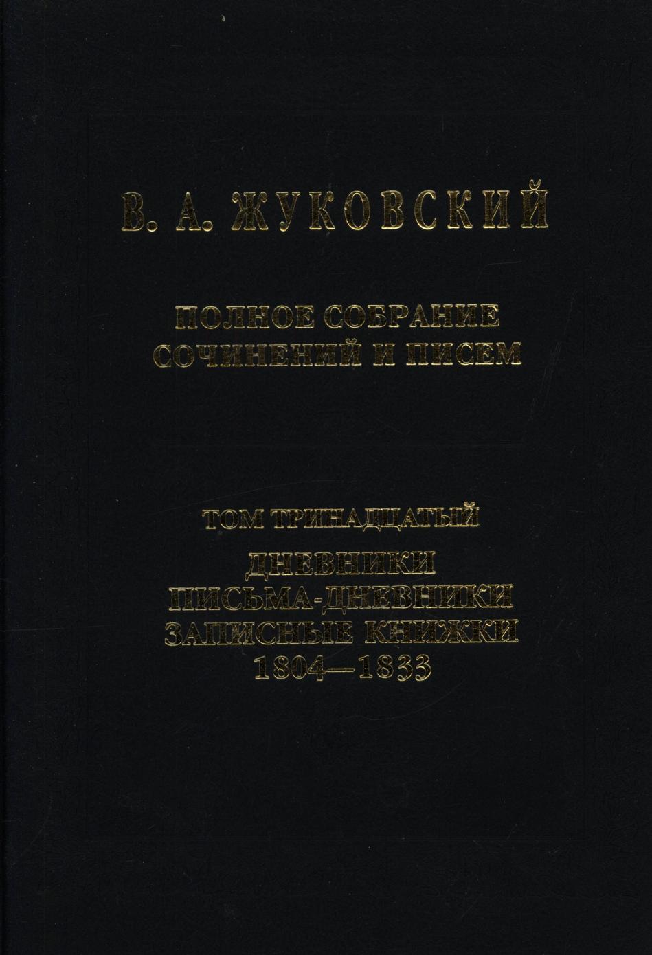 Полное собрание сочинений В. А. Жуковского впервые в эдиционной практике представляет наследие великого русского поэта в максимально полном на сегодняшний день объеме. Тексты Жуковского даны на основе критического осмысления всех известных автографов поэта и прижизненных публикаций. В 13 и 14-м томах собрана дневниковая проза Жуковского, включающая три взаимосвязанных раздела: собственно дневники, письма-дневники и записные книжки. 13-й том содержит дневниковые материалы 1804—1833 гг., от первых дошедших до нас размышлений юного поэта, ориентированных на тип «франклинова журнала», записной книжки «Разные замечания», писем-дневников, обращенных к Маше Протасовой, материалов первого заграничного путешествия 1820—1821 гг. до описания второго заграничного путешествия 1832—1833 гг.