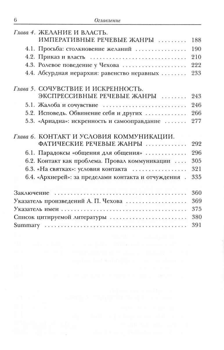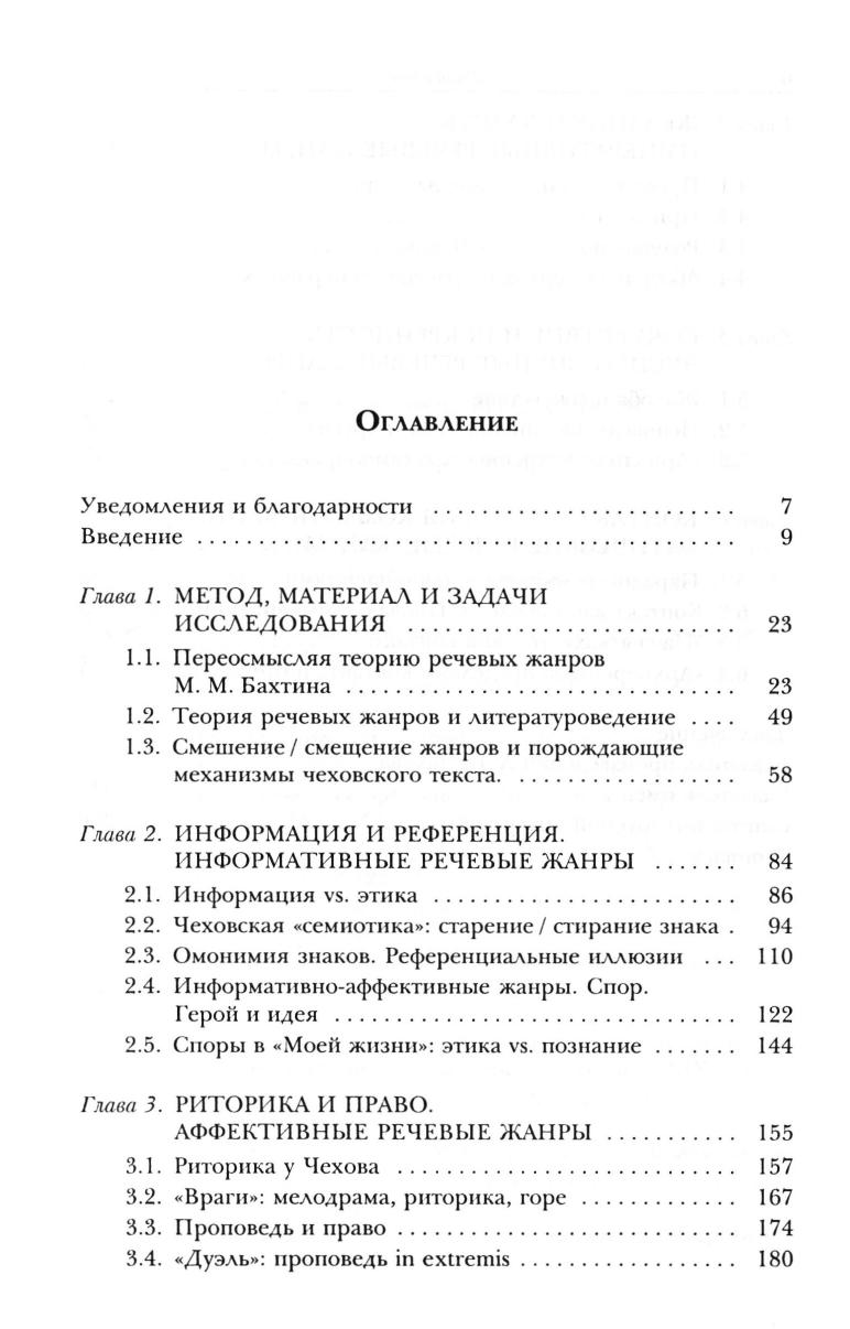 Монография представляет собой попытку применения бахтинской теории речевых жанров к изучению поэтики художественного текста. На материале всего чеховского творчества исследуется специфика функционирования информативных, риторических, императивных, экспрессивных и фатических жанров, в том числе спора, проповеди, просьбы, приказа, жалобы, исповеди и др. Описание особенностей изображения Чеховым речевых жанров сочетается с исследованием стоящих за ними интерсубъективных и социальных категорий. Автор демонстрирует имплицитное понимание Чеховым пределов возможностей человеческого языка, самовыражения и понимания другого.