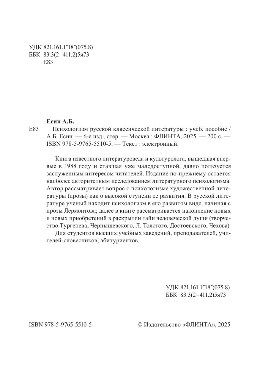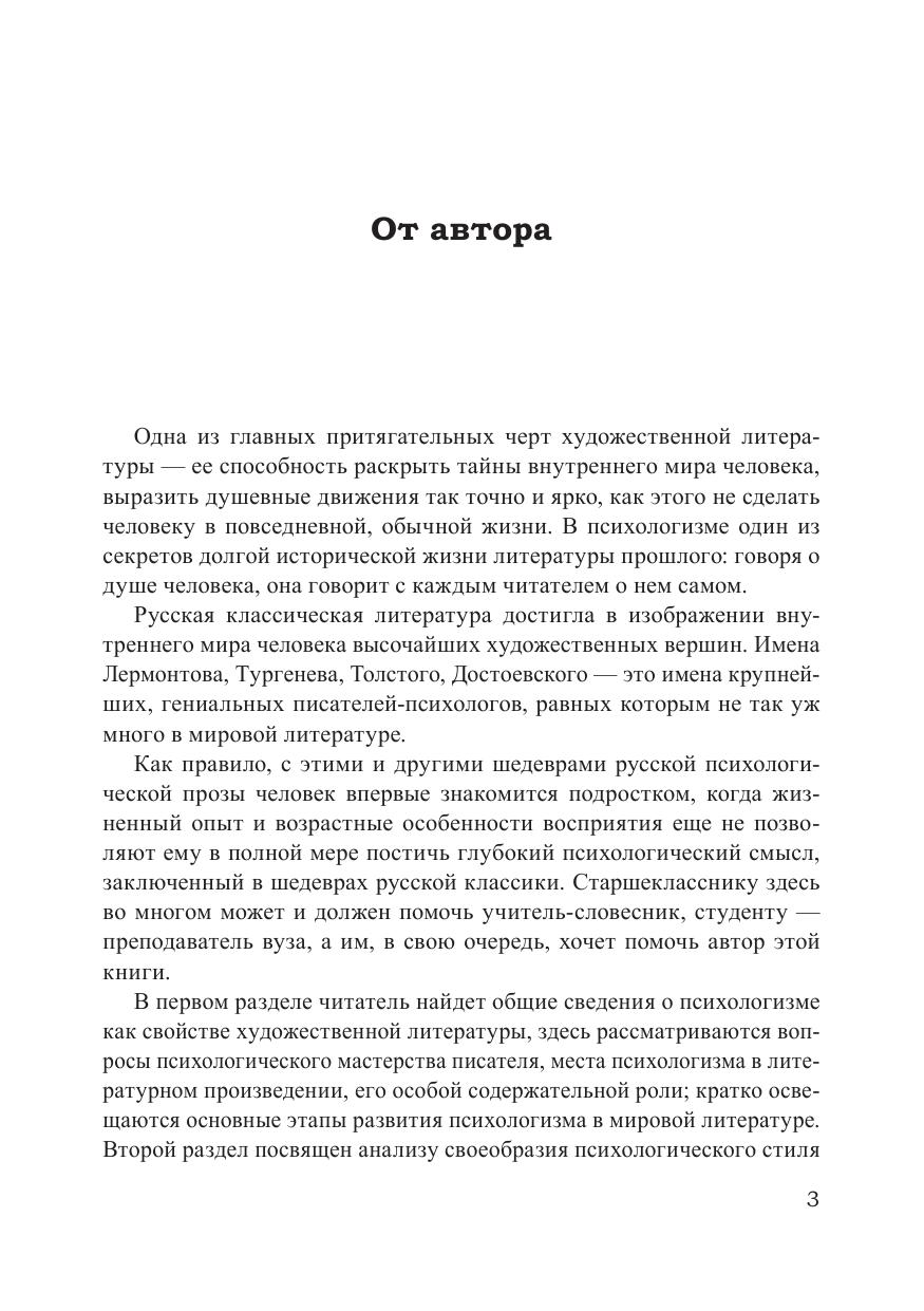 Книга известного литературоведа и культуролога, вышедшая впервые в 1988 году и ставшая уже малодоступной, давно пользуется заслуженным интересом читателей. Издание по-прежнему остается наиболее авторитетным исследованием литературного психологизма. Автор рассматривает вопрос о психологизме художественной литературы (прозы) как о высокой ступени ее развития. В русской литературе ученый находит психологизм в его развитом виде, начиная с прозы Лермонтова; далее в книге рассматривается накопление новых и новых приобретений в раскрытии тайн человеческой души (творчество Тургенева, Чернышевского, Л. Толстого, Достоевского, Чехова). Для студентов высших учебных заведений, преподавателей, учителей-словесников, абитуриентов.