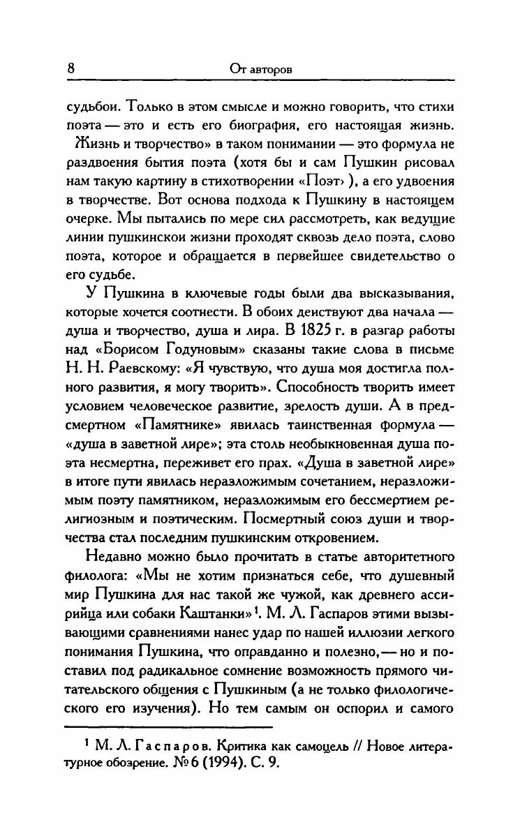 Книга экспериментальная: это опыт сжатой творческой биографии Пушкина, которая бы позволила охватить единым взглядом его жизненный и поэтический путь. Пользуясь привычной формулой «жизнь и творчество», авторы очерка стремятся представить подвижную картину непрерывных взаимопереходов биографии и поэзии, образующих вместе пушкинскую творческую судьбу. Общая сверхзадача очерка – дать материал к пониманию проблемы жизнеописания художника, его внутренней биографии, – одной из нерешенных проблем филологической науки.