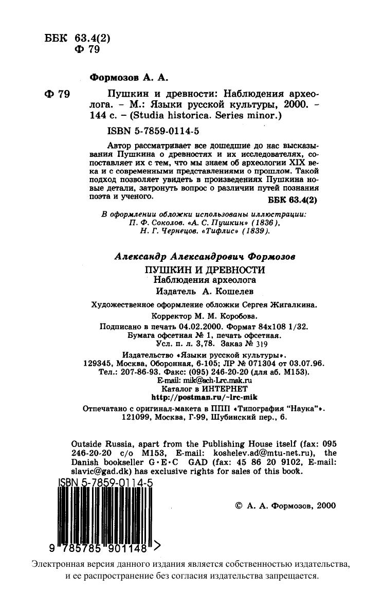 Автор рассматривает все дошедшие до нас высказывания Пушкина о древностях и их исследователях, сопоставляет их с тем, что мы знаем об археологии XIX века и с современными представлениями о прошлом. Такой подход позволяет увидеть в произведениях Пушкина новые детали, затронуть вопрос о различии путей познания поэта и ученого. Для научных работников, широкого круга специалистов.