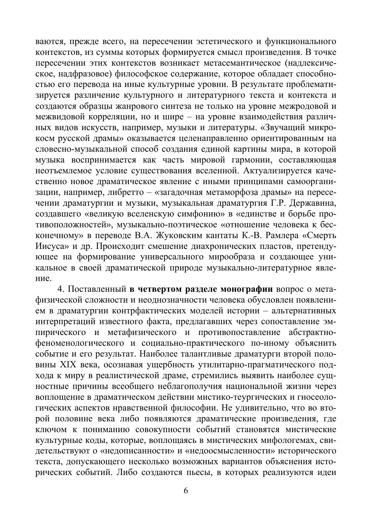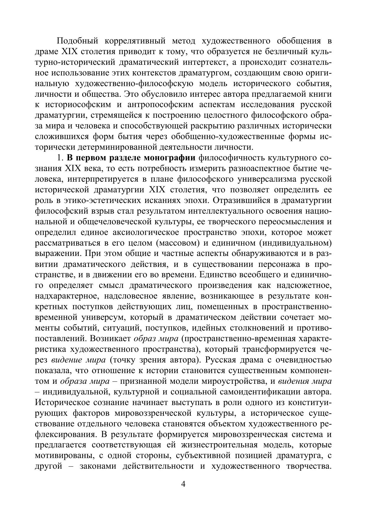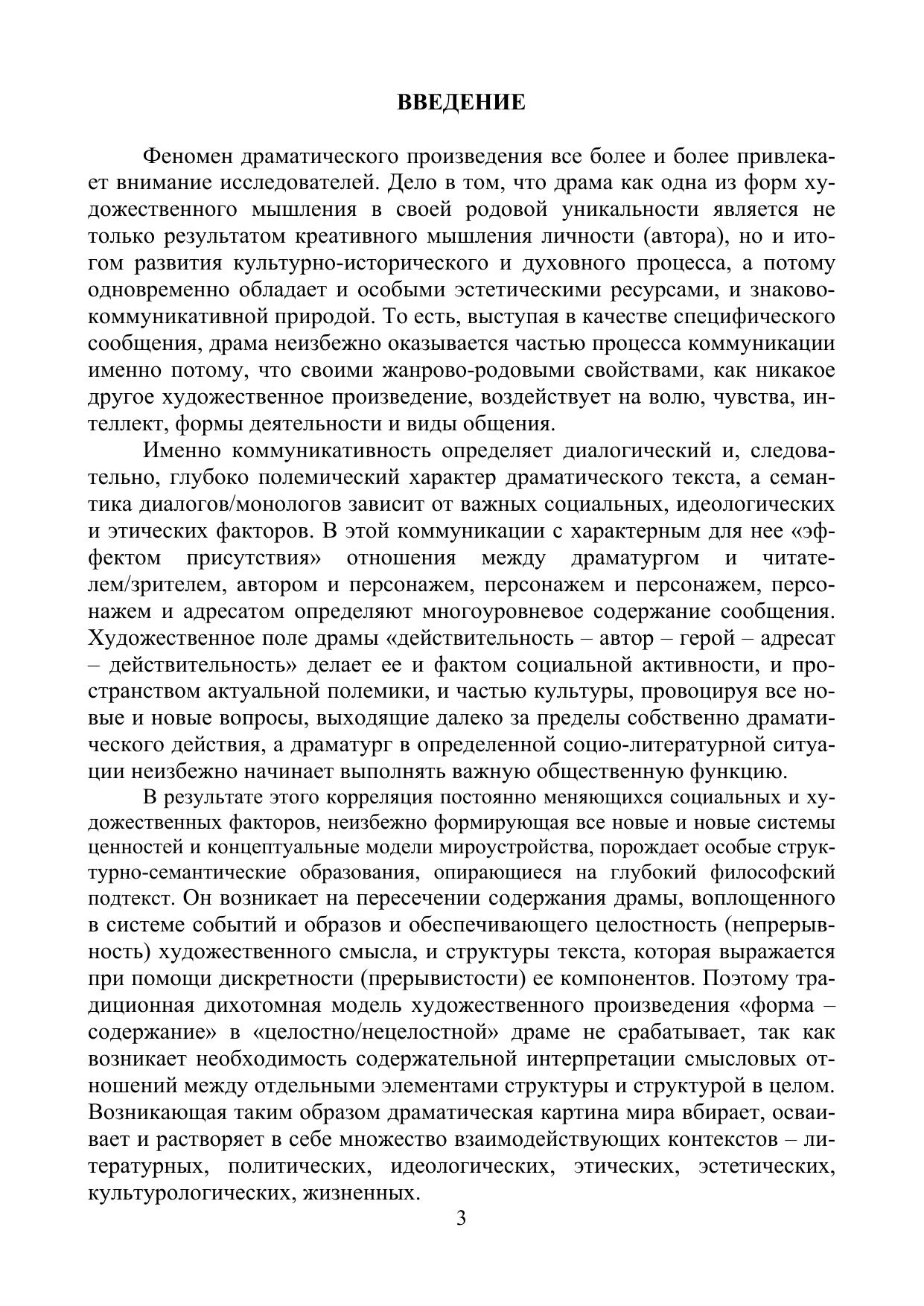 Монография представляет собой исследование русской драматургии как художественно-эстетического феномена, факта социальной активности, пространства актуальной полемики и части культуры. В пяти разделах монографии предпринимается концептуальный анализ широкого драматургического контекста XIX века, а также драматических произведений таких писателей, как Г.Р. Державин, В.А. Жуковский, А.Н. Островский, А.К. Толстой, Л.Н. Толстой, Е.И. Замятин. В монографии показывается, как взаимодействие социальных факторов и факторов художественных, формирующее в драматическом произведении иную систему ценностей или новую модель мироустройства, неизбежно порождает особую структурно-семантическую конструкцию, опирающуюся на глубокий философский подтекст. Автор доказывает, что драма как культурный феномен всегда философична и всегда исторична, а это позволяет выявить уникальные особенности и возможности драматического произведения в историко-культурном, аксиологическом, структурно-семиотическом и, прежде всего, философском аспектах.