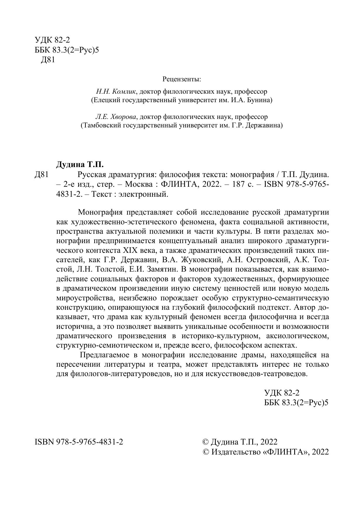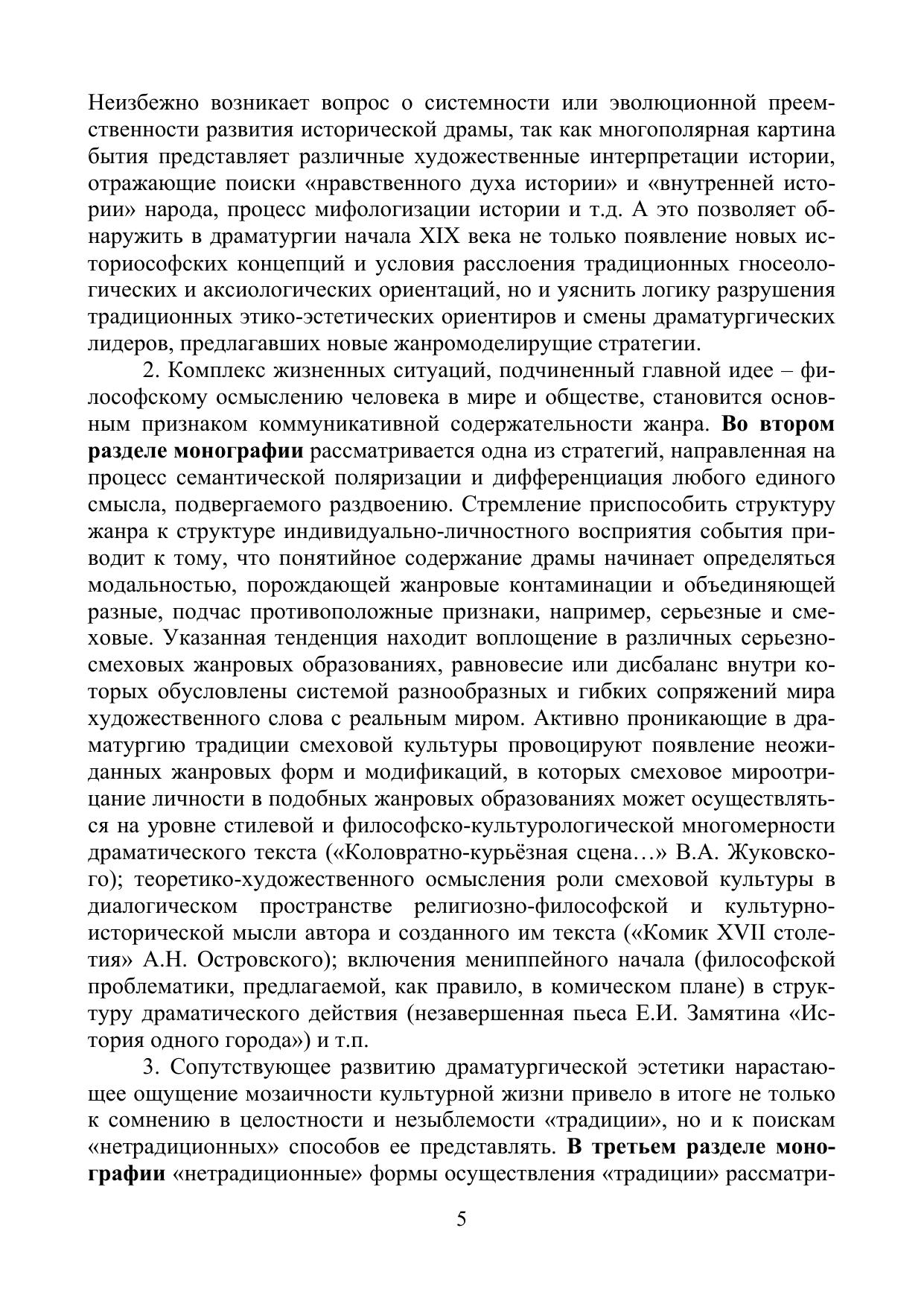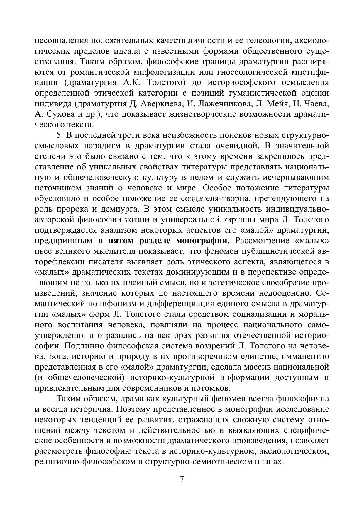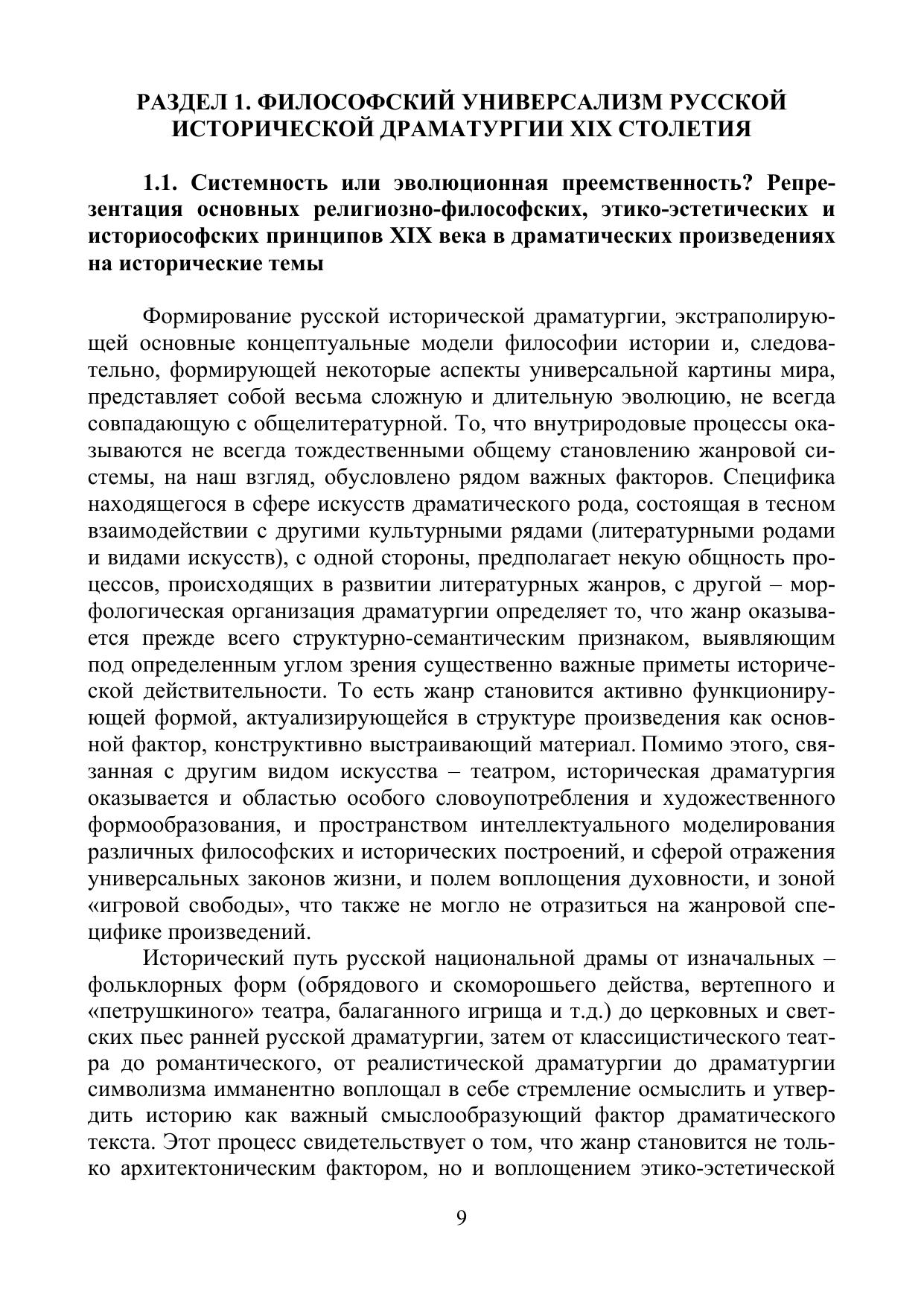Монография представляет собой исследование русской драматургии как художественно-эстетического феномена, факта социальной активности, пространства актуальной полемики и части культуры. В пяти разделах монографии предпринимается концептуальный анализ широкого драматургического контекста XIX века, а также драматических произведений таких писателей, как Г.Р. Державин, В.А. Жуковский, А.Н. Островский, А.К. Толстой, Л.Н. Толстой, Е.И. Замятин. В монографии показывается, как взаимодействие социальных факторов и факторов художественных, формирующее в драматическом произведении иную систему ценностей или новую модель мироустройства, неизбежно порождает особую структурно-семантическую конструкцию, опирающуюся на глубокий философский подтекст. Автор доказывает, что драма как культурный феномен всегда философична и всегда исторична, а это позволяет выявить уникальные особенности и возможности драматического произведения в историко-культурном, аксиологическом, структурно-семиотическом и, прежде всего, философском аспектах.