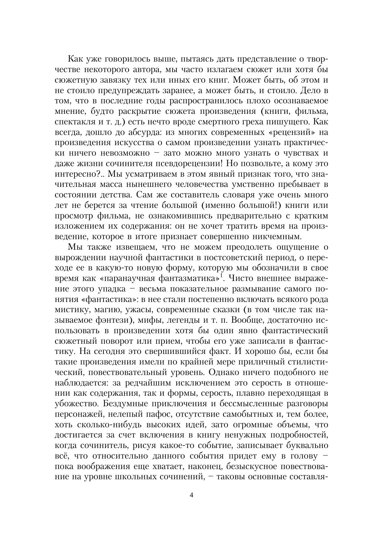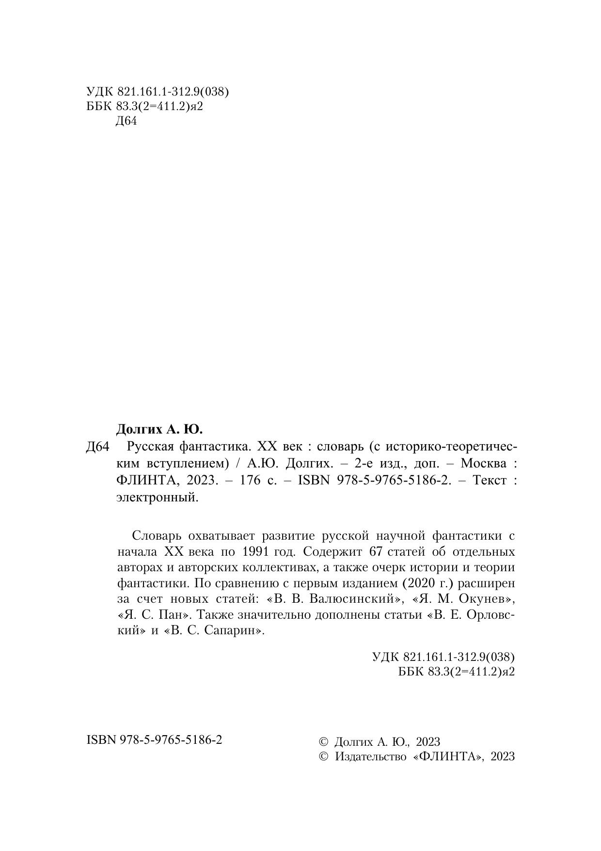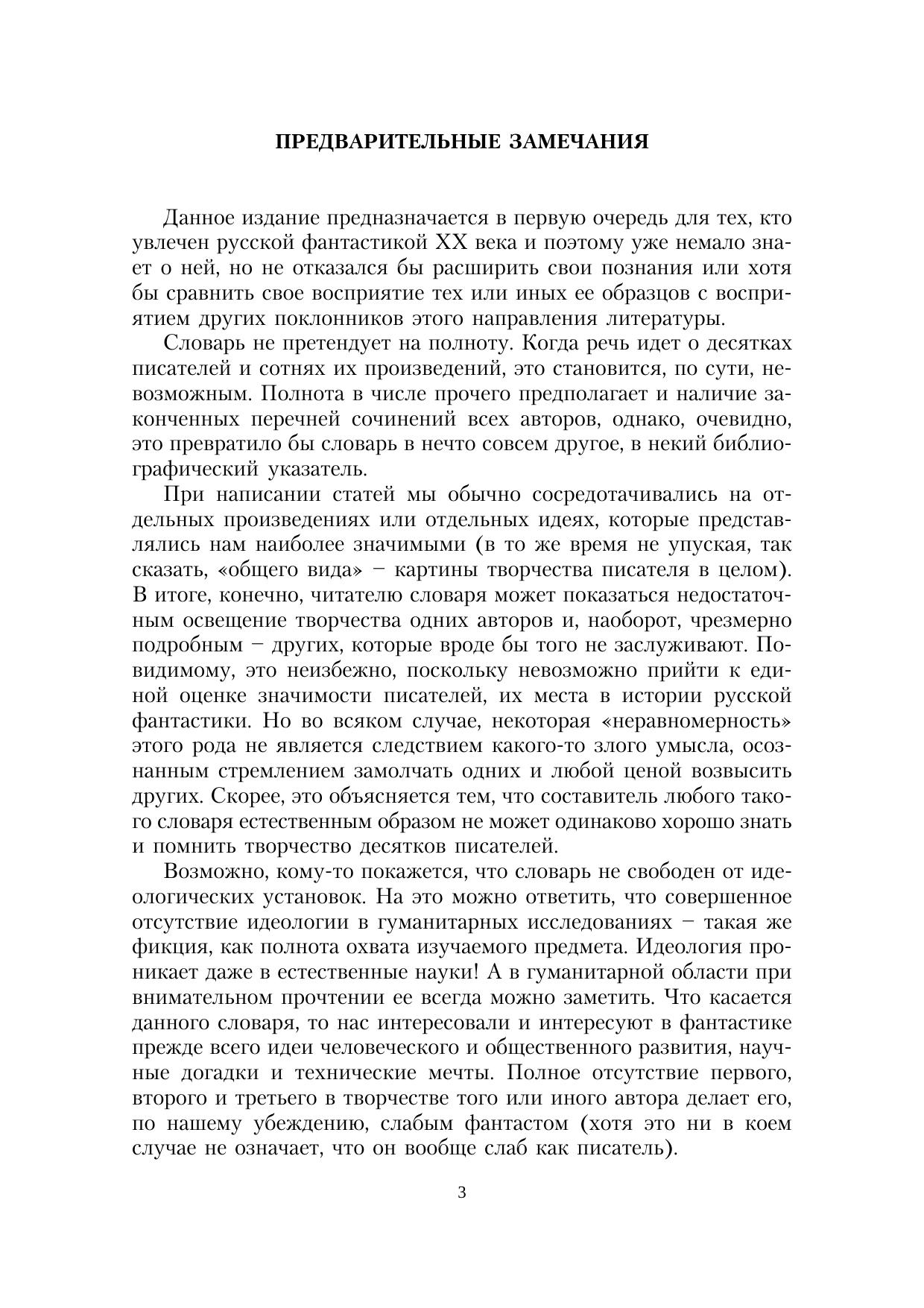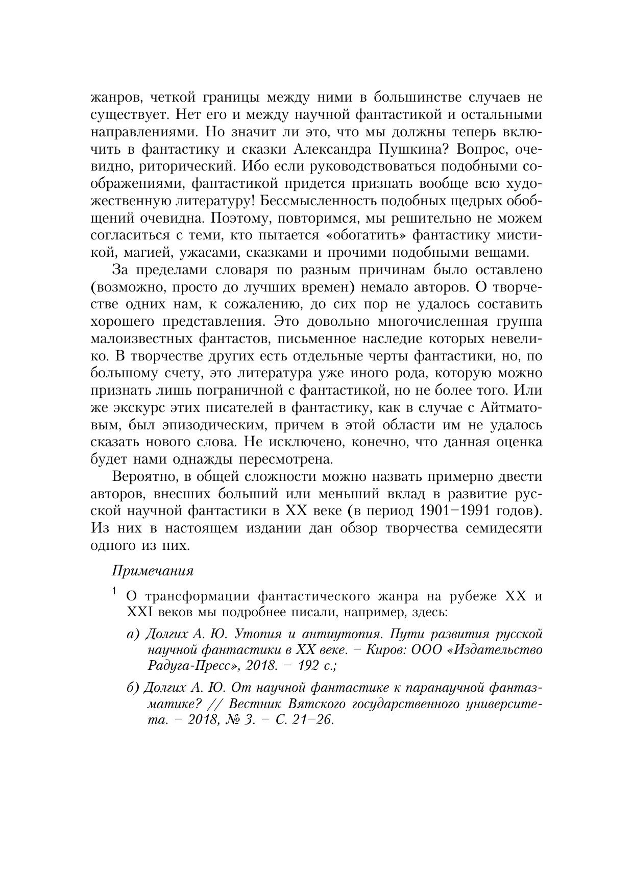 Словарь охватывает развитие русской научной фантастики с начала XX века по 1991 год. Содержит 67 статей об отдельных авторах и авторских коллективах, а также очерк истории и теории фантастики. По сравнению с первым изданием (2020 г.) расширен за счет новых статей: «В. В. Валюсинский», «Я. М. Окунев», «Я. С. Пан». Также значительно дополнены статьи «В. Е. Орловский» и «В. С. Сапарин».