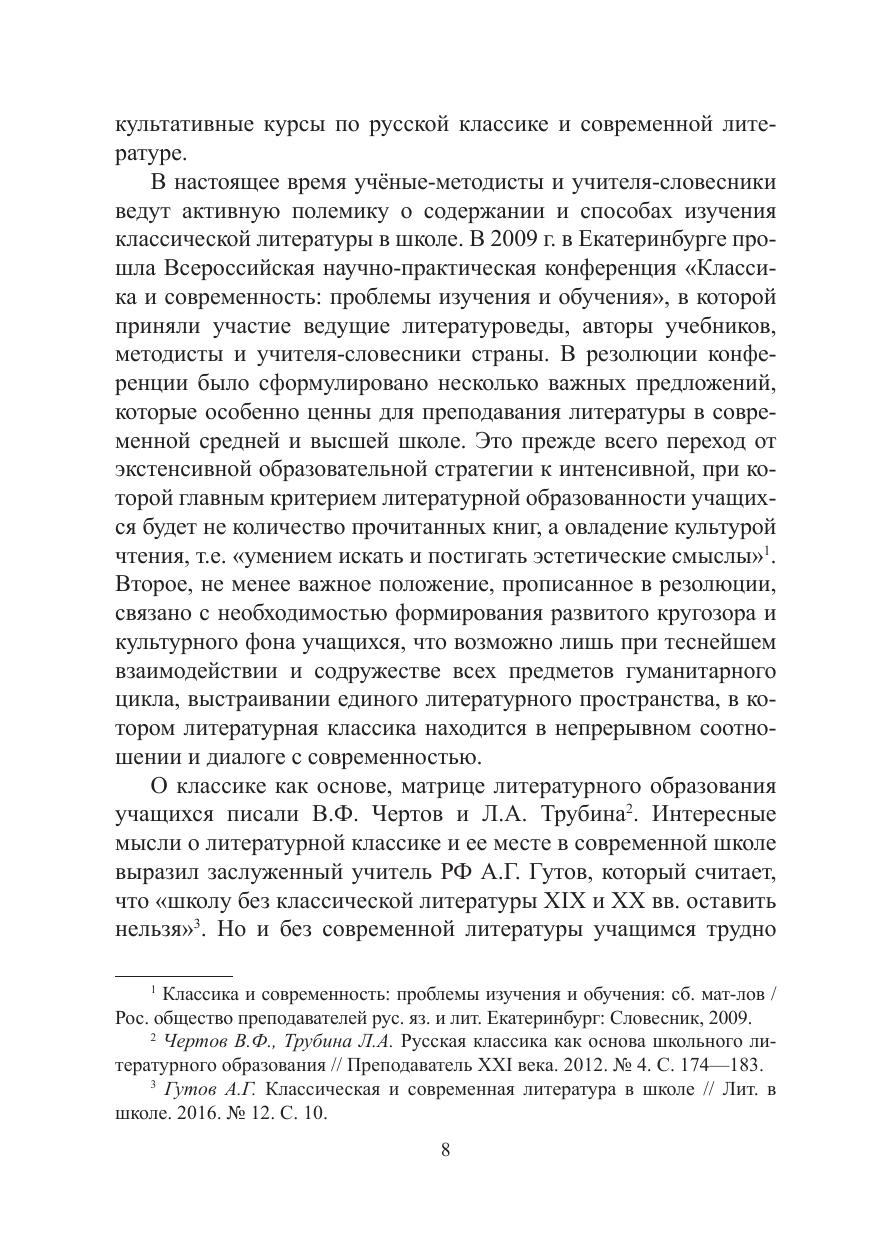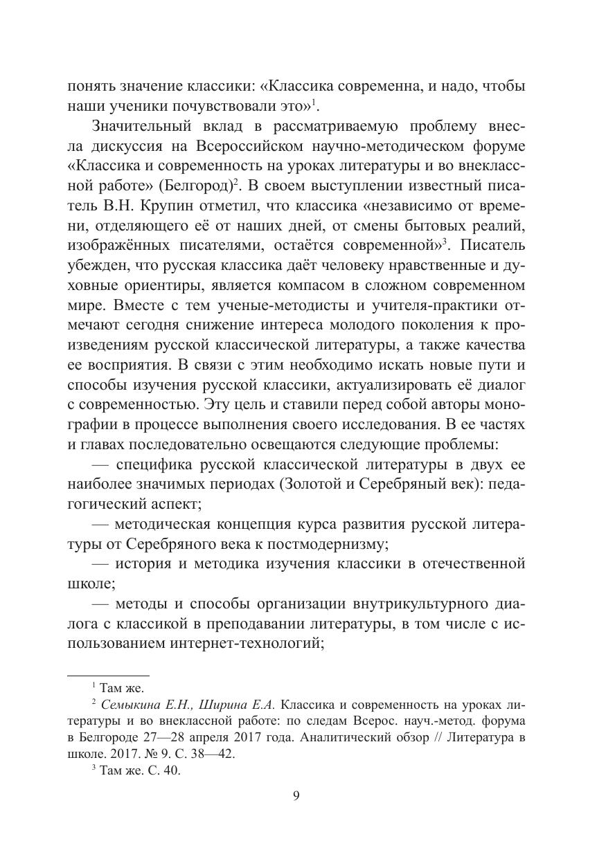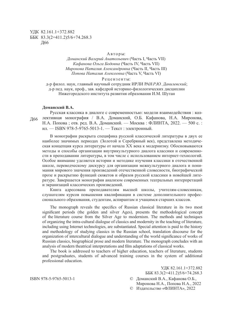 В монографии раскрыта специфика русской классической литературы в двух ее наиболее значимых периодах (Золотой и Серебряный век), представлена методическая концепция курса литературы от начала XX века к модернизму. Обосновываются методы и способы организации внутрикультурного диалога классики и современности в преподавании литературы, в том числе с использованием интернет-технологий. Особое внимание уделяется истории и методике изучения классики в отечественной школе, переводческому дискурсу для организации межкультурного диалога и понимания мирового значения произведений отечественной словесности, биографической прозе и раскрытию функций сюжетов и образов русской классики в новейшей литературе. Завершается монография анализом современных театральных интерпретаций и экранизаций классических произведений.