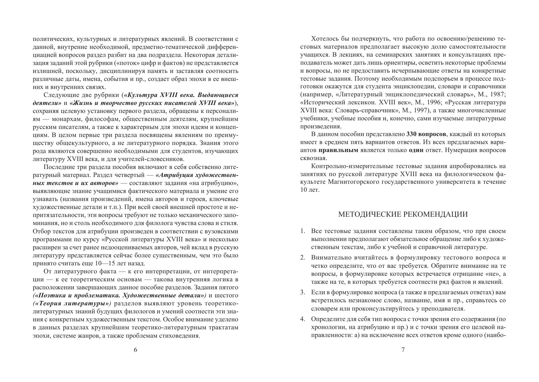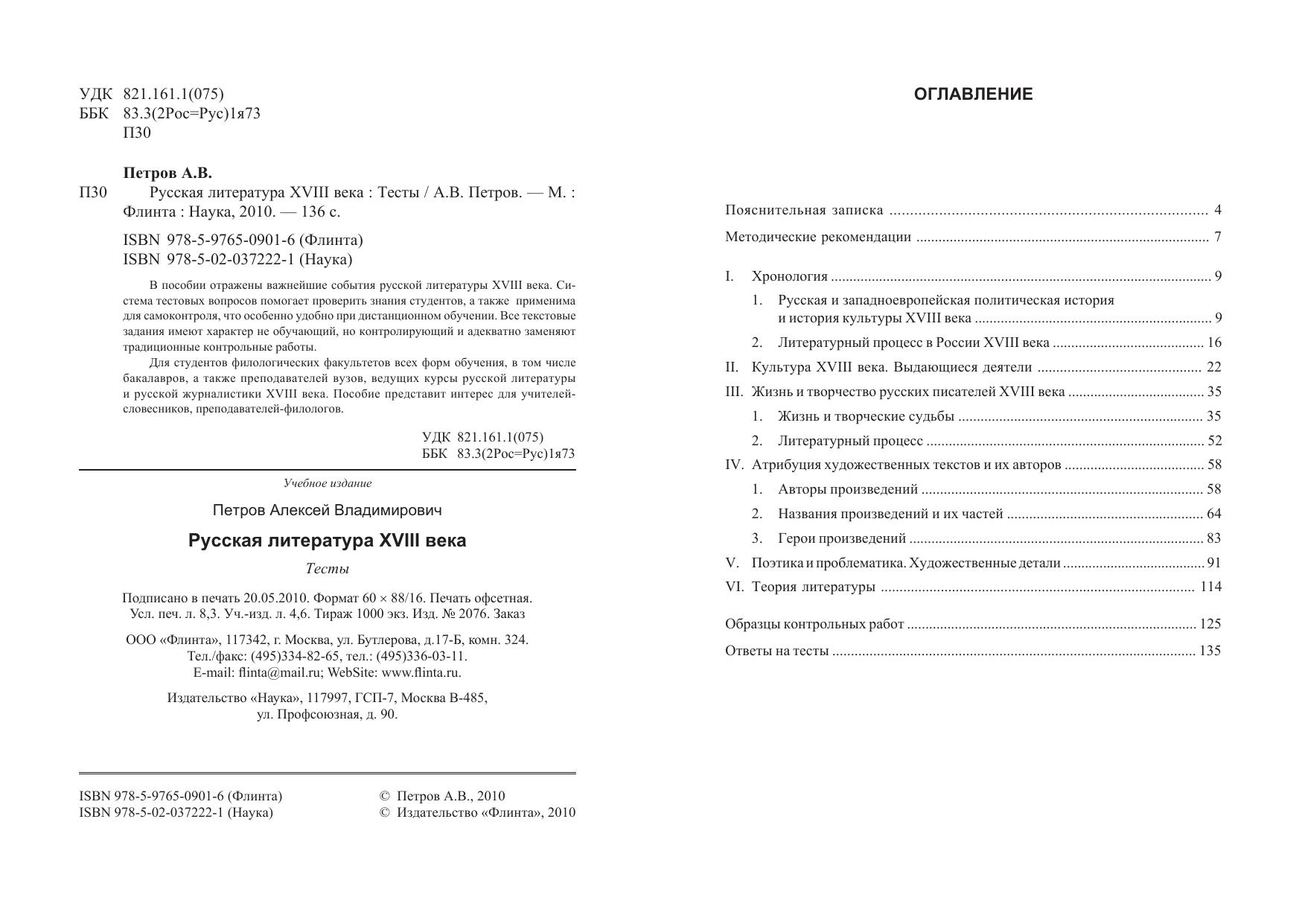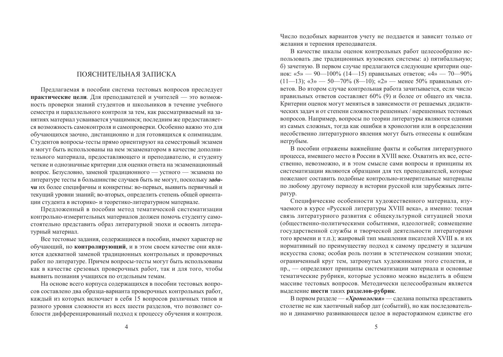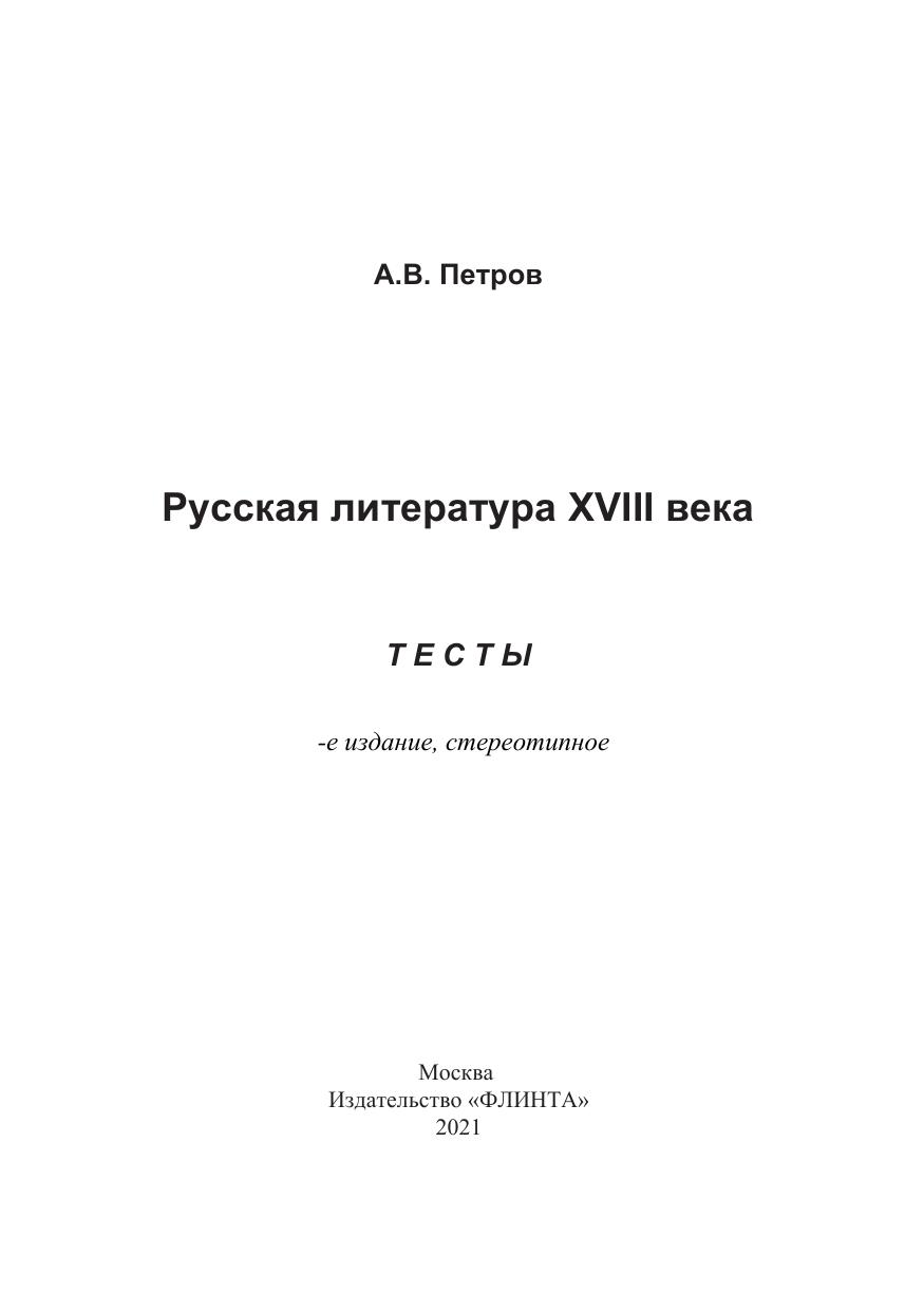 В пособии отражены важнейшие события русской литературы XVIII века. Система тестовых вопросов помогает проверить знания студентов, а также применима для самоконтроля, что особенно удобно при дистанционном обучении. Все текстовые задания имеют характер не обучающий, но контролирующий и адекватно заменяют традиционные контрольные работы. Для студентов филологических факультетов всех форм обучения, в том числе бакалавров, а также преподавателей вузов, ведущих курсы русской литературы и русской журналистики XVIII века. Пособие представит интерес для учителей-словесников, преподавателей-филологов.