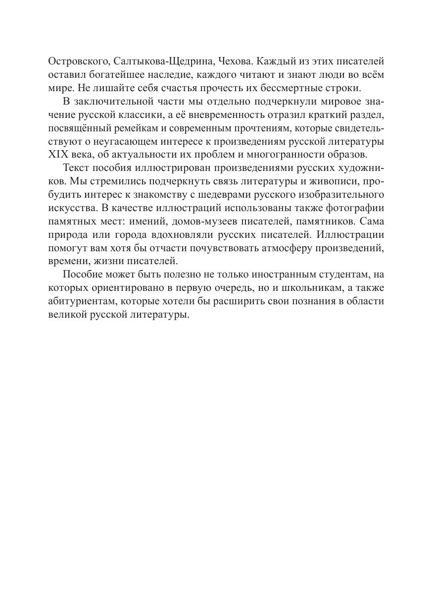 Авторы пособия объединили свой многолетний опыт преподавания русской литературы ХІХ века за пределами России: в Беларуси и в Словакии, и представили материалы, которые, по их мнению, соответствуют уровню современных студентов, предоставляют им и преподавателю право выбора объёма и содержания материала, заданий разного вида и типа. Каждый раздел пособия завершает лингвокультурологический комментарий, словарь, списки литературы, дополненные ссылками на