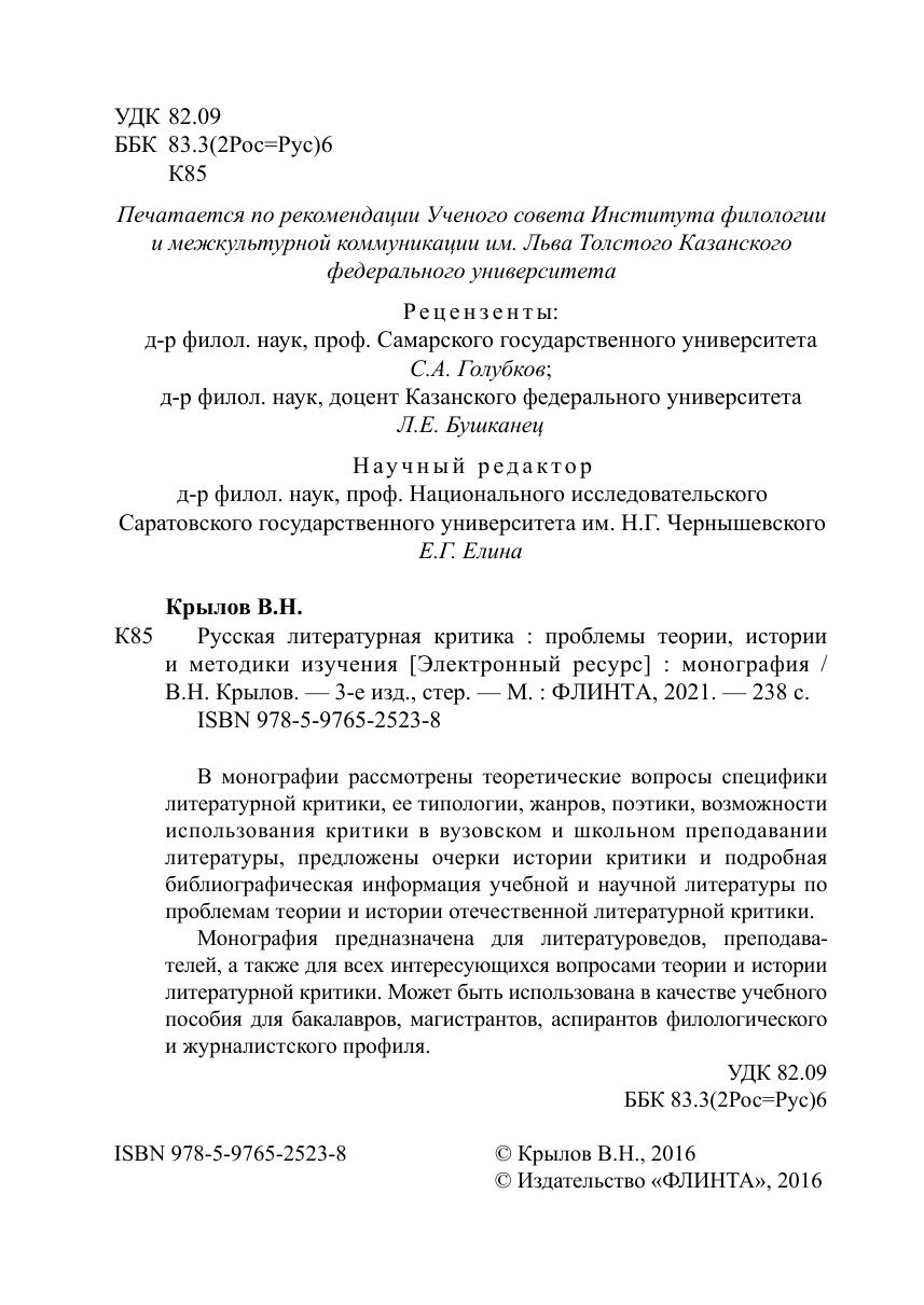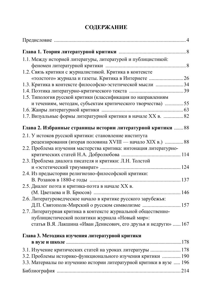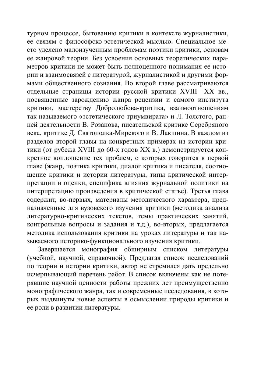 В монографии рассмотрены теоретические вопросы специфики литературной критики, ее типологии, жанров, поэтики, возможности использования критики в вузовском и школьном преподавании литературы, предложены очерки истории критики и подробная библиографическая информация учебной и научной литературы по проблемам теории и истории отечественной литературной критики.