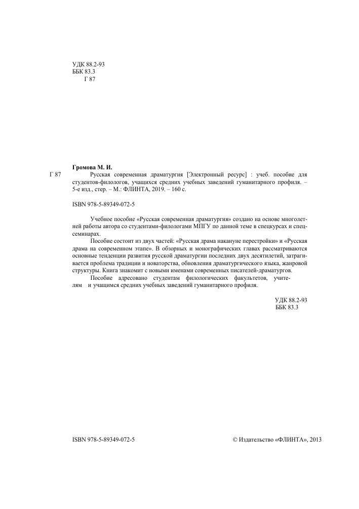 Пособие состоит из двух частей: «Русская драма накануне перестройки» и «Русская драма на современном этапе». В обзорных и монографических главах рассматриваются основные тенденции развития русской драматургии последних двух десятилетий, затрагивается проблема традиции и новаторства, обновления драматургического языка, жанровой структуры. Книга знакомит с новыми именами современных писателей-драматургов. Пособие адресовано студентам филологических факультетов, учителям и учащимся средних учебных заведений гуманитарного профиля.