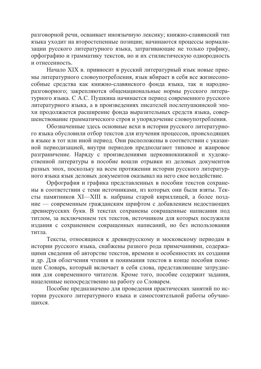 Учебное пособие включает тексты из наиболее значительных памятников письменности русского языка XI-XIX вв., задания для их лингвистического и стилистического анализа, вопросы и упражнения для самостоятельной работы. Материал расположен в соответствии с общепринятой периодизацией истории русского литературного языка, связанной с историей русского народа. К зазданиям приложен словарь древнерусских слов, необходимый для чтения, перевода и анализа представленных текстов.