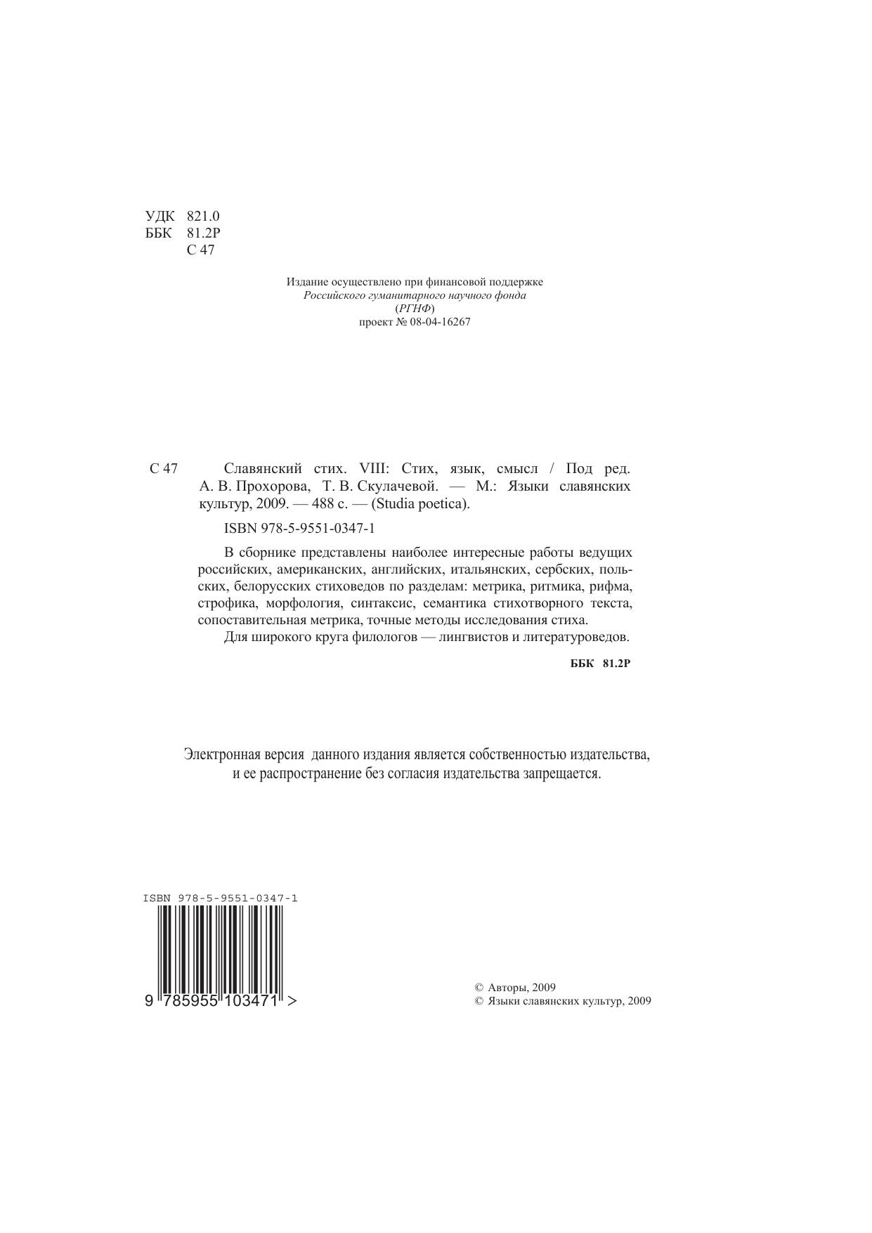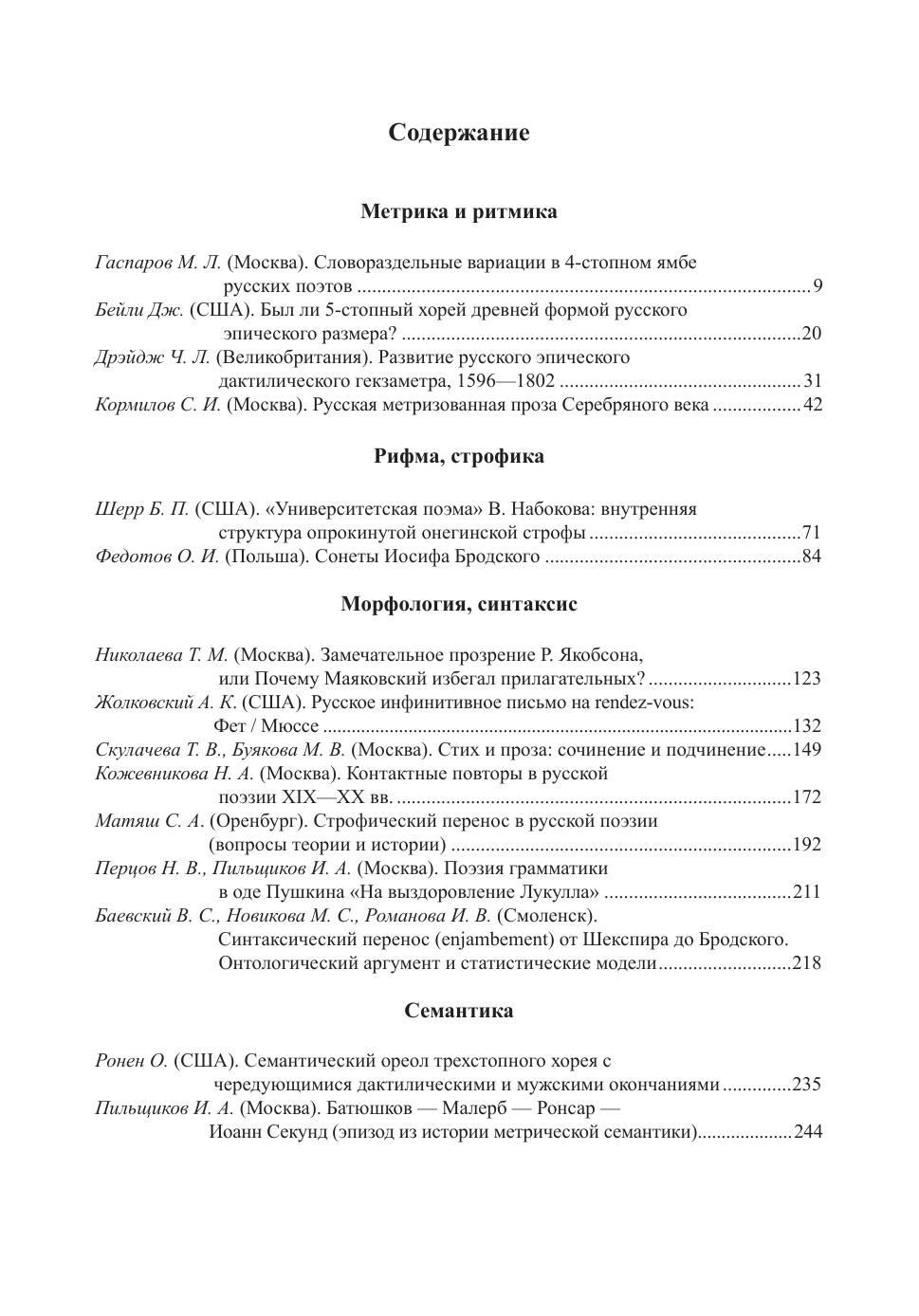 В сборнике представлены наиболее интересные работы ведущих российских, американских, английских, итальянских, сербских, польских, белорусских стиховедов по разделам: метрика, ритмика, рифма, строфика, морфология, синтаксис, семантика стихотворного текста, сопоставительная метрика, точные методы исследования стиха. Для широкого круга филологов – лингвистов и литературоведов.