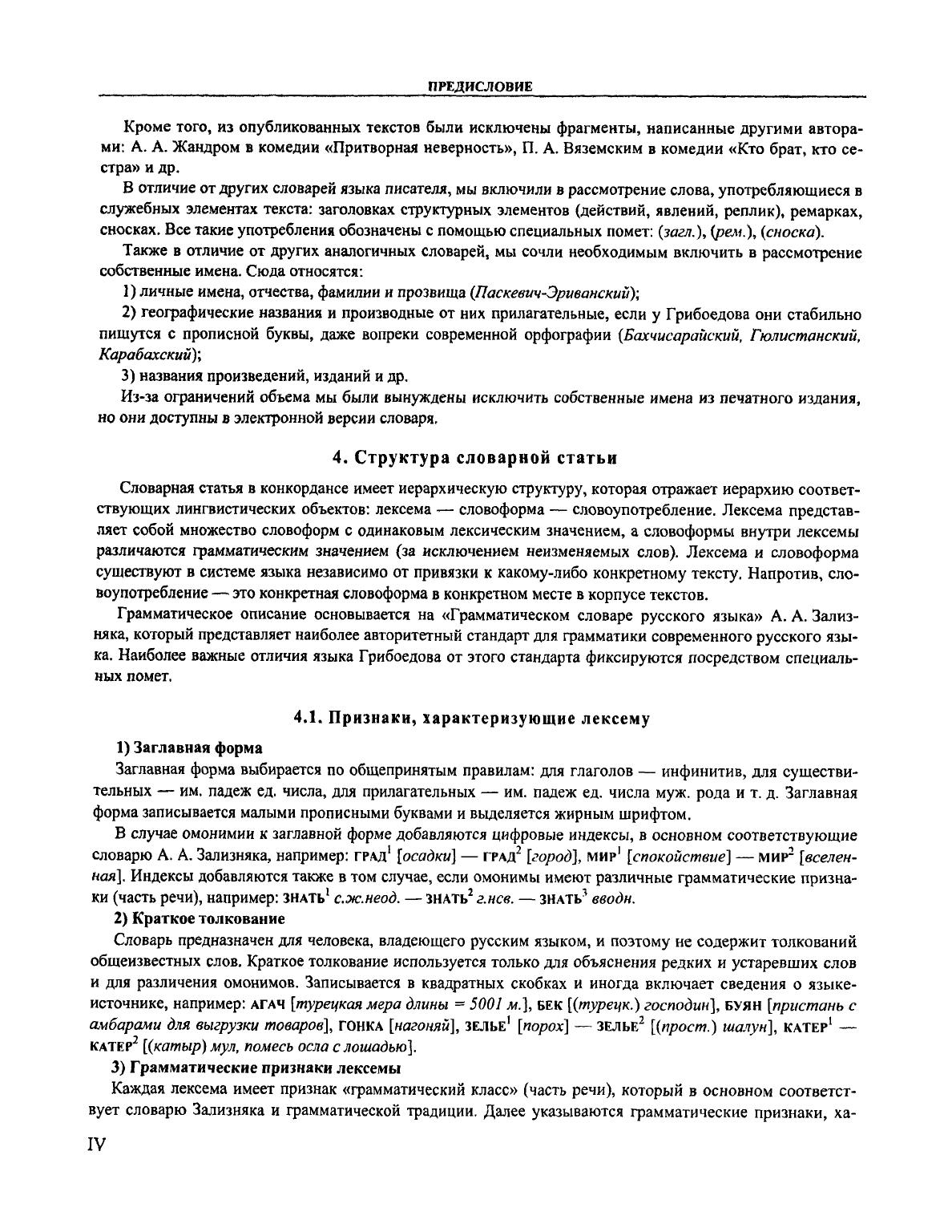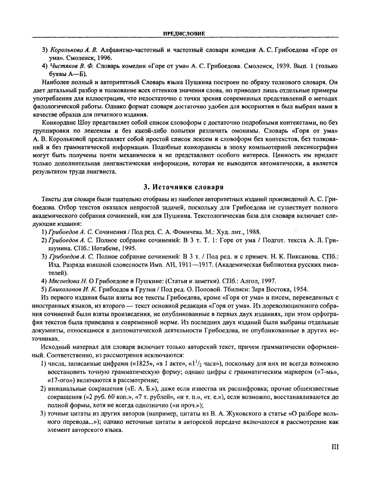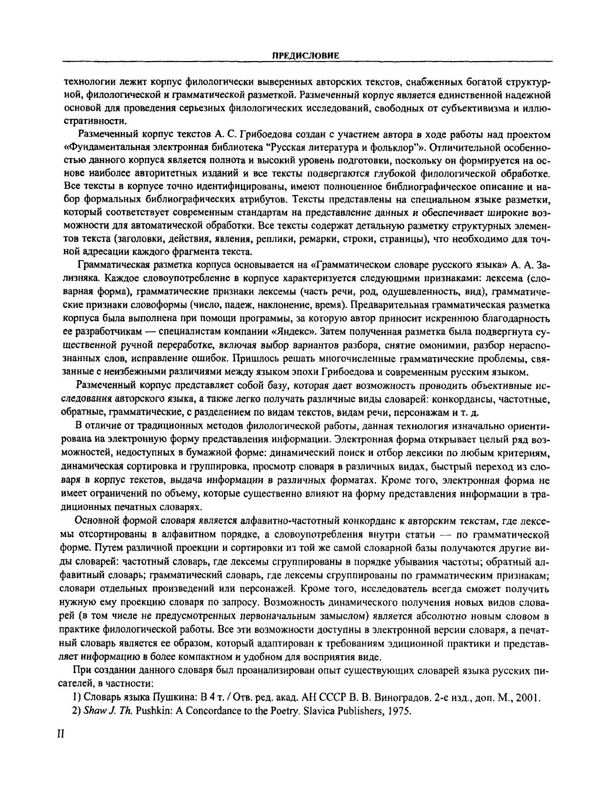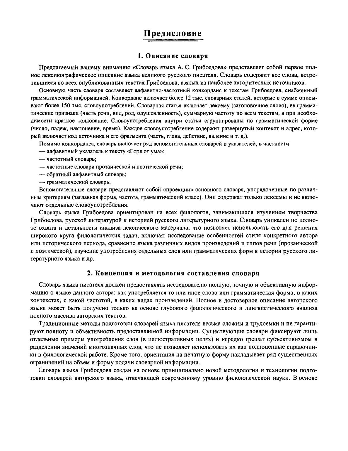 «Словарь языка А. С. Грибоедова» представляет собой первое полное лексикографическое описание языка великого русского писателя. Словарь включает более 12 тысяч словарных статей, которые охватывают все слова, встретившиеся во всех опубликованных текстах Грибоедова. Словарь создан на основе принципиально новой методологии подготовки словарей языка писателя, которая опирается на электронный корпус филологически размеченных текстов. Словарь содержит алфавитно-частотный конкорданс к текстам Грибоедова и ряд указателей (алфавитный, частотный, обратный, грамматический). Словарная статья включает лексему (заголовочное слово), ее грамматические признаки, суммарную частоту, а также список всех словоупотреблений. Для каждого словоупотребления указывается грамматическая форма, развернутый контекст и адрес в корпусе текстов. Словарь языка Грибоедова ориентирован на всех филологов, занимающихся изучением творчества Грибоедова, русской литературой и историей русского литературного языка. Словарь уникален по полноте охвата и детальности анализа лексического материала, что позволяет использовать его для решения широкого круга филологических задач: исследование особенностей стиля конкретного автора или периода, сравнение языка различных видов произведений, изучение употребления отдельных слов или грамматических форм в истории русского языка и др.