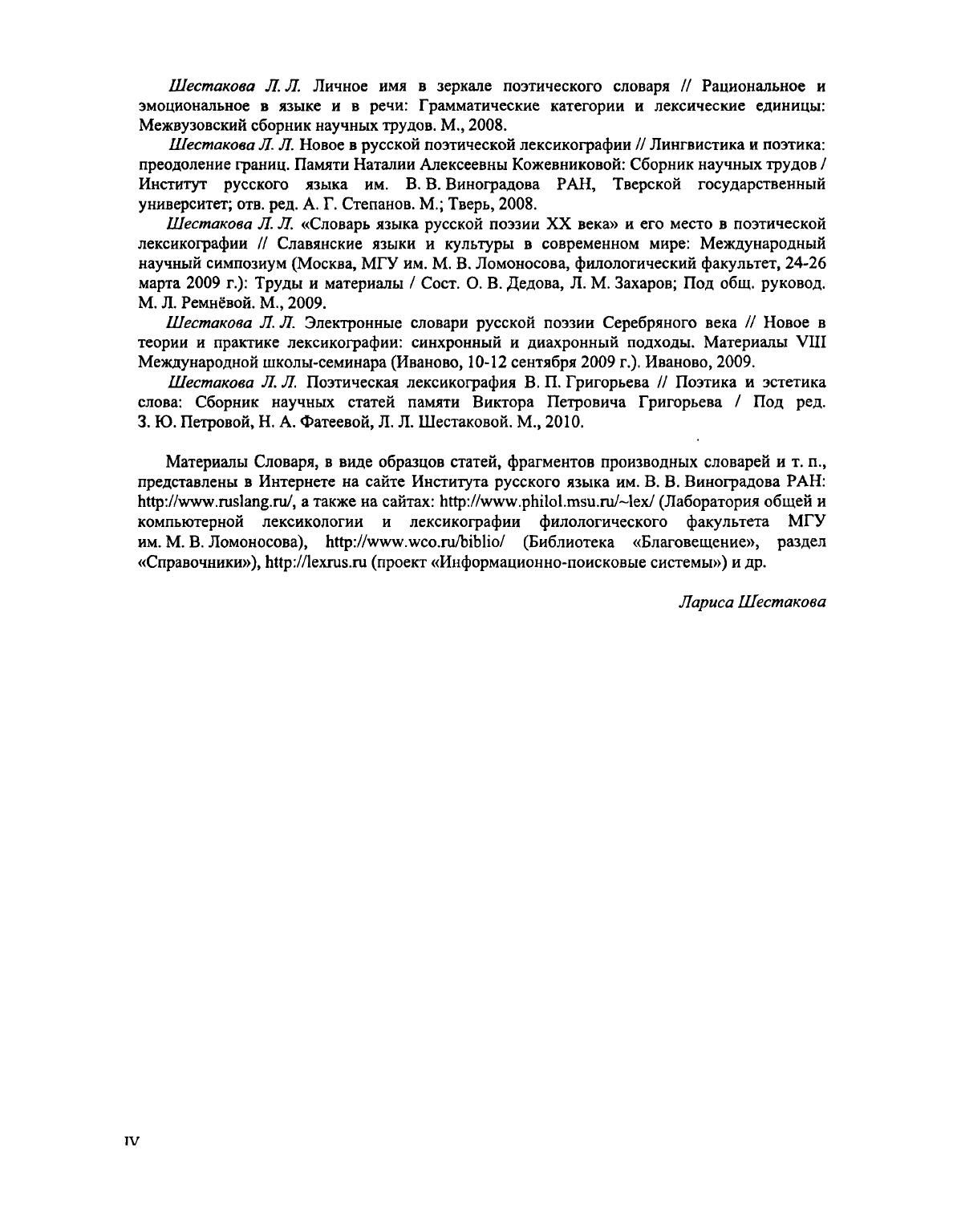 Четвертый том «Словаря языка русской поэзии XX века» содержит более 4000 словарных статей. Статьи включают в себя стихотворные строки из источников Словаря – произведений десяти выдающихся поэтов Серебряного века: И. Анненского, А. Ахматовой, А. Блока, С. Есенина, М. Кузмина, О. Мандельштама, В. Маяковского, Б. Пастернака, В. Хлебникова, М. Цветаевой. В статьях эти строки хронологически упорядочены, они дают возможность судить и о ритмике окружения заглавного слова, и о «приращениях смысла» в нем самом, и об истории слова в поэтическом языке эпохи. Все строки-контексты сопровождаются шифрами, в условной статье соответственно: Анн90, Ахм912, АБ914, Ес915, Куз916, ОМ918, М920, П921, Хл921, Цв935. В необходимых случаях к заглавным формам статей и контекстам даются пометы и краткий комментарий. Словарь демонстрирует разнообразие и выразительность языка поэзии и «художественную память» его слов. Обогащая наш эстетический кругозор, Словарь помогает уточнить впечатления от давно любимых читателем строк и обдумать их связи с множеством менее известных. Обращенный прежде всего к широкому кругу любителей поэзии, Словарь построен так, что в его материалах много нового для себя найдут и специалисты – культурологи и филологи.