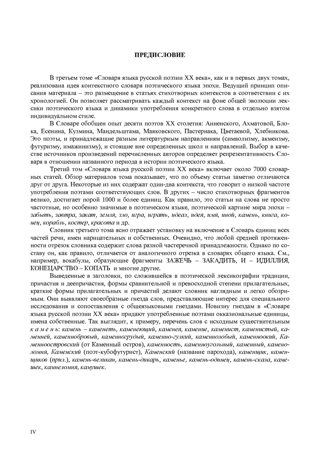 Третий том «Словаря языка русской поэзии XX века» содержит около 7000 статей. Каждая из статей представляет собой собрание стихотворных строк из источников Словаря – произведений десяти выдающихся поэтов Серебряного века: И. Анненского, А. Ахматовой, А. Блока, С. Есенина, М. Кузмина, О. Мандельштама, В. Маяковского, Б. Пастернака, В. Хлебникова, М. Цветаевой. В статьях эти строки хронологически упорядочены, они дают возможность судить и о ритмике окружения заглавного слова, и о «приращениях смысла» в нем самом, и об истории слова в поэтическом языке эпохи. Все строки-контексты сопровождаются шифрами, в условной статье соответственно: Анн909, Ахм912, АБ914, Ес915, Куз91б, ОМ918, М920, П921, Хл921, Цв935. В необходимых случаях к заглавным формам статей и контекстам даются пометы и краткий комментарий. Словарь демонстрирует разнообразие и выразительность языка поэзии и «художественную память» его слов. Обогащая наш эстетический кругозор, Словарь помогает уточнить впечатления от давно любимых читателем строк и обдумать их связи с множеством менее известных. Обращенный прежде всего к широкому кругу любителей поэзии, Словарь построен так, что в его материалах много нового для себя найдут и специалисты – культурологи и филологи.