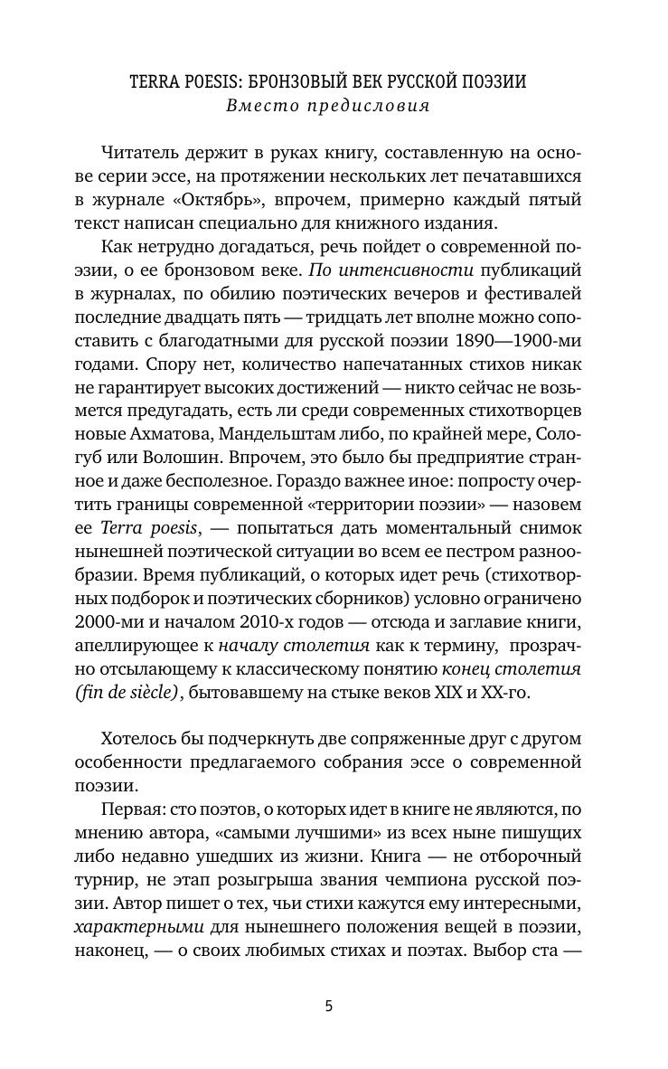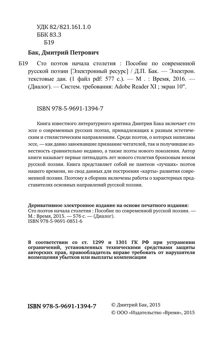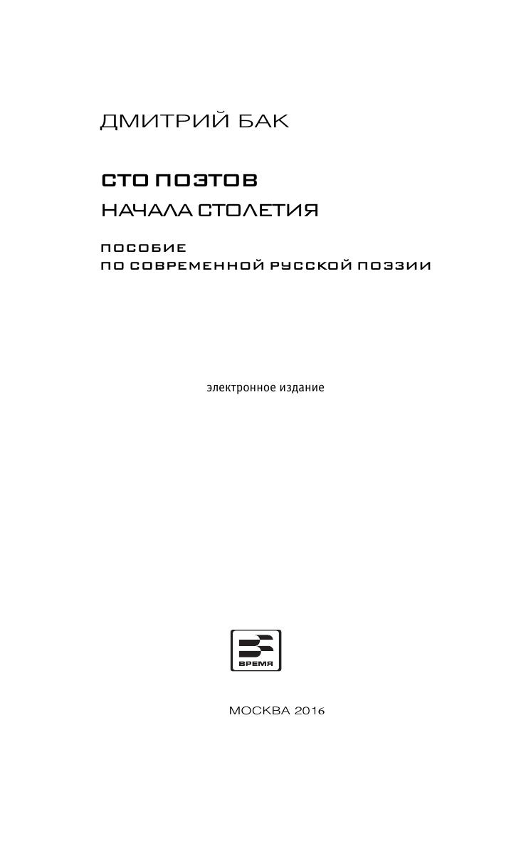 Книга известного литературного критика Дмитрия Бака включает сто эссе о современных русских поэтах, принадлежащих к разным эстетическим и стилистическим направлениям. Среди поэтов, о которых написаны эссе, — как давно завоевавшие признание читателей, так и получившие известность сравнительно недавно, а также поэты нового поколения. Автор книги называет первые пятнадцать лет нового столетия бронзовым веком русской поэзии. Книга представляет собой не пантеон «лучших» поэтов нашего времени, но свод данных для построения «карты» развития современной поэзии. Поэтому в сборник включены работы о характерных представителях основных направлений русской поэзии.